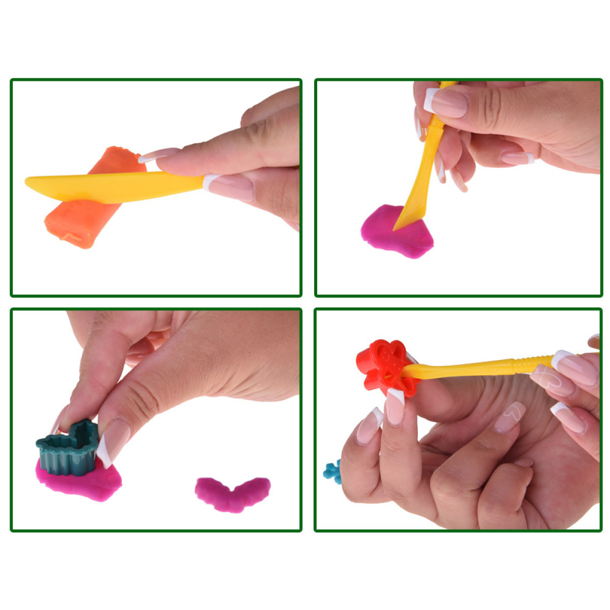 Kalėdinės formelės leidžia kurti išskirtines figūrėles, tokias kaip sniego senis, eglutė ar žvaigždė, kurios gali būti papuoštos pagal jūsų vaiko idėjas. Rinkinyje taip pat yra trys saugūs plastikiniai peiliukai, padedantys tiksliai atskirti masės perteklių ir kurti detalius elementus.