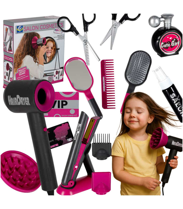 • Viskas, ko reikia mažajam stilistui - pilnas kirpėjo rinkinys su plaukų džiovintuvu, tiesintuvu, veidrodžiu, šepečiu, šukomis ir kirpėjo priedais.