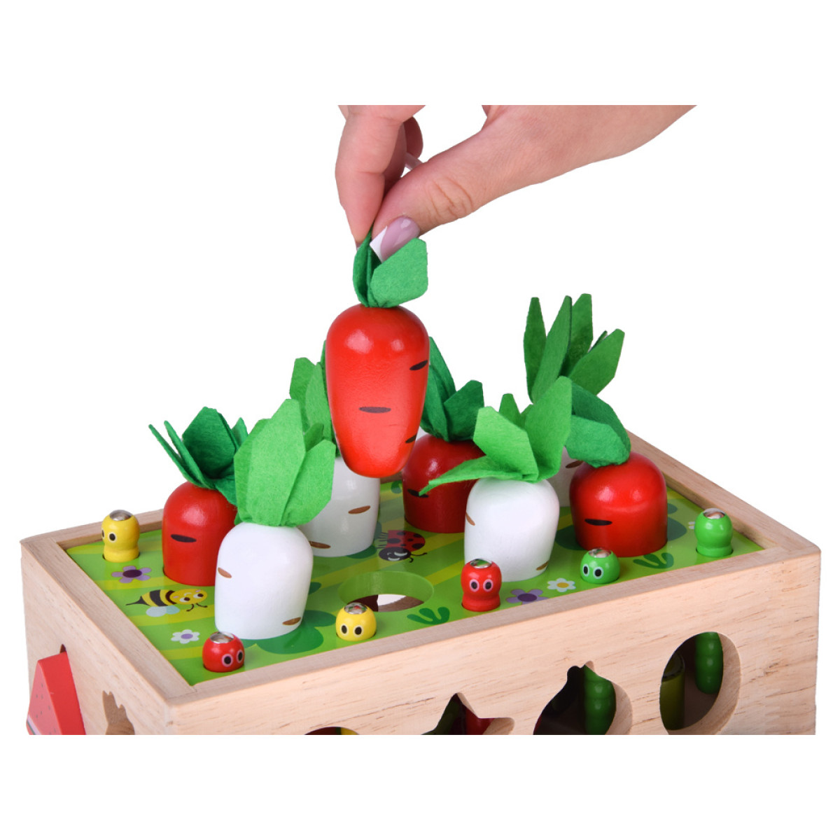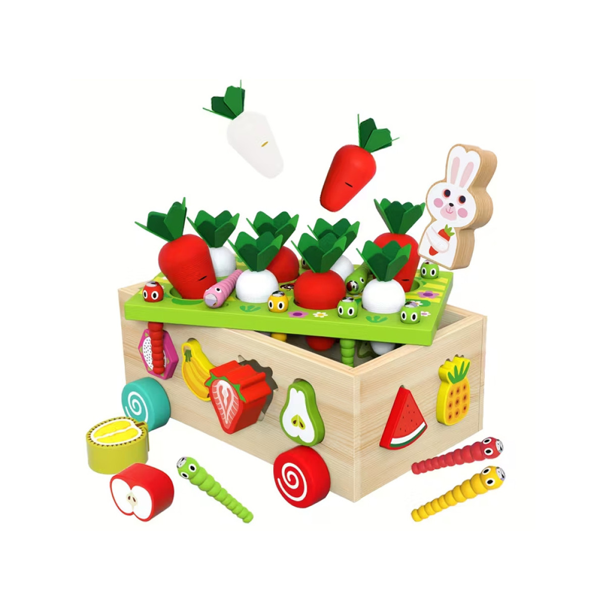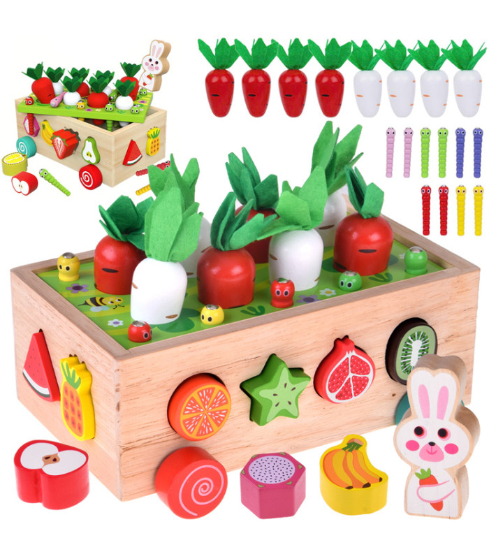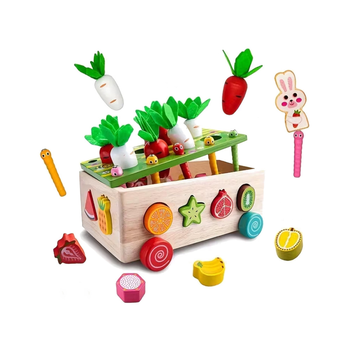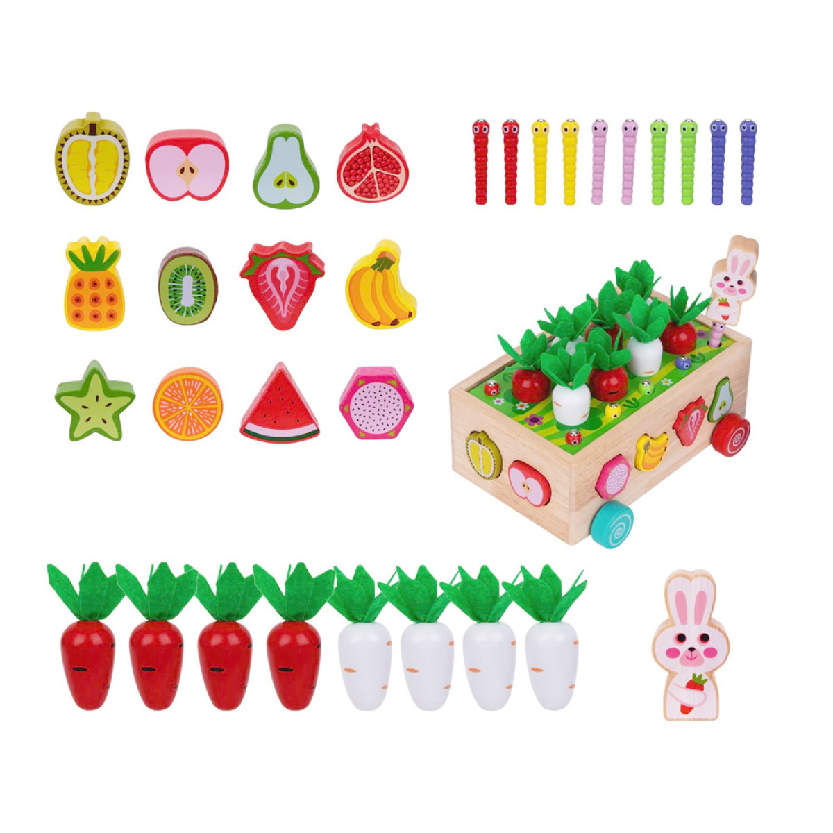 Vežimėlis pagamintas iš medžio, nudažytas saugiais, netoksiškais dažais. Žaislas ne tik patrauklus, bet ir saugus vaikams. Dėmesys detalėms užtikrina, kad žaislas neturi aštrių briaunų. Įdomi formos sorterė moko vaikus atpažinti formas, spalvas ir pavadinimus. Magnetiniai elementai su triušio figūrėle skatina rankų ir akių koordinaciją.