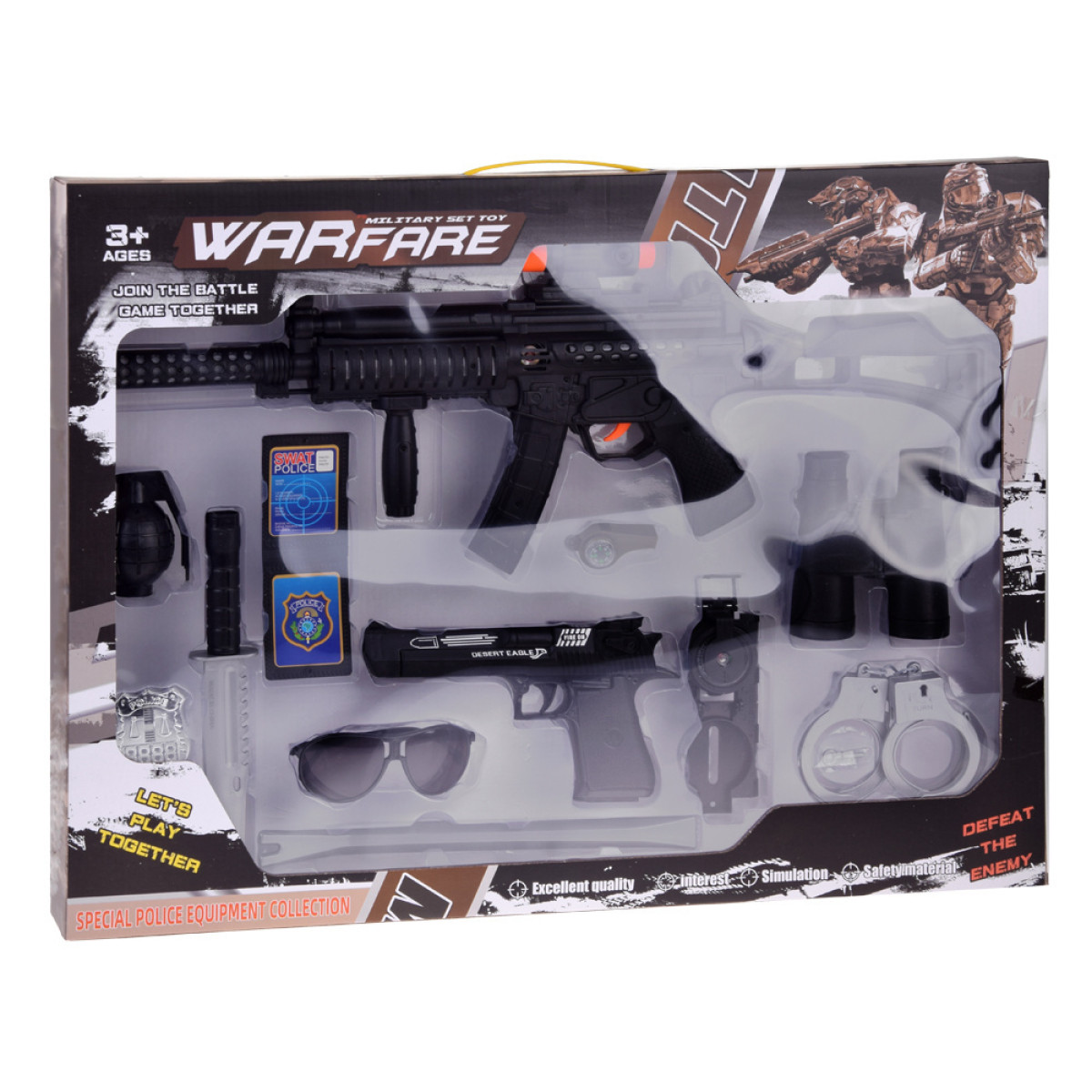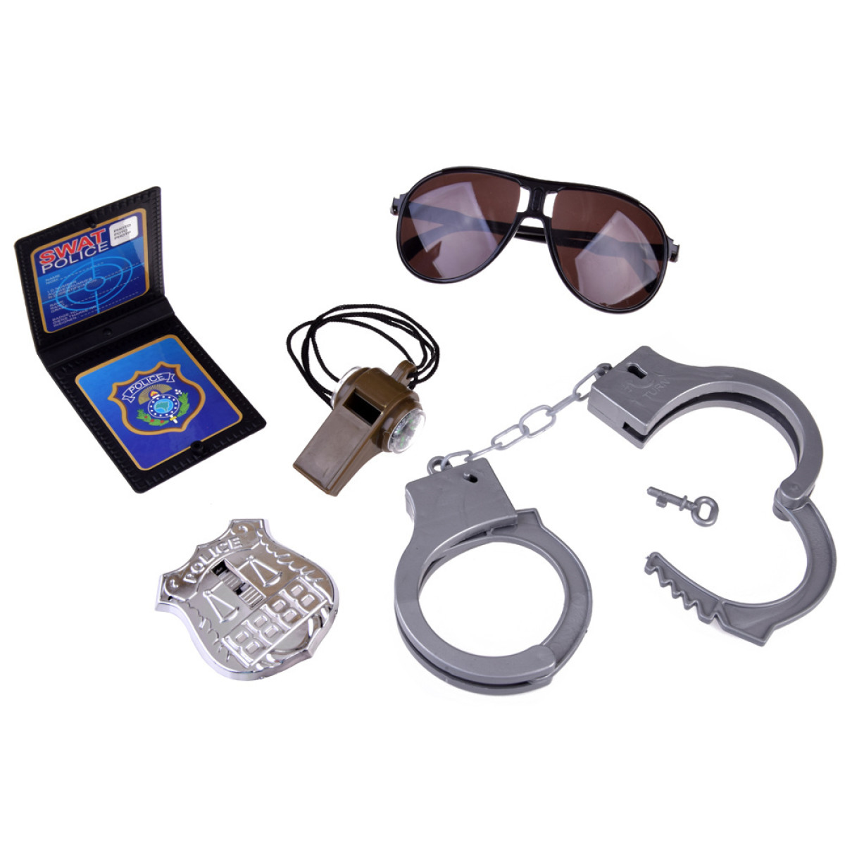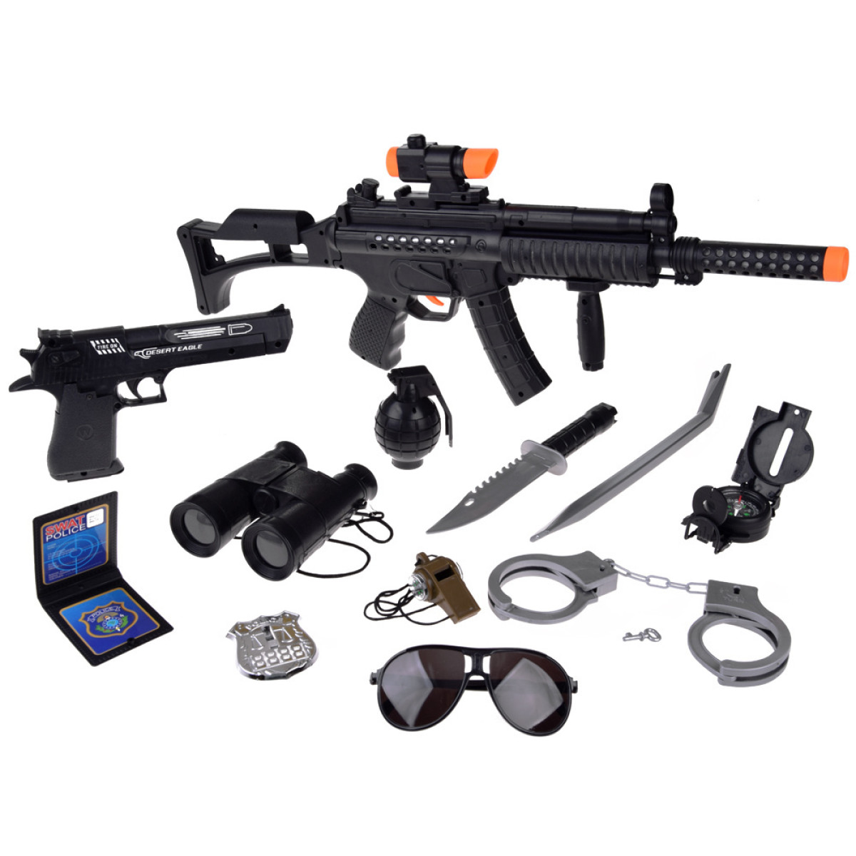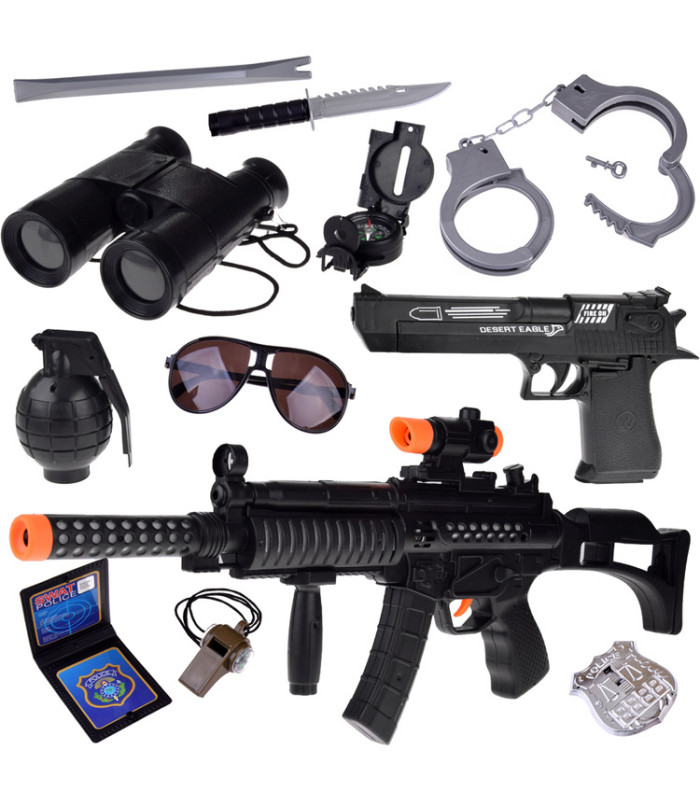 Komplektas su 12 būtinų priedų leis jūsų vaikui įsijausti į policininko vaidmenį. Šis rinkinys padės vaikui patirti džiaugsmingas akimirkas, žaidžiant teisėsaugininko darbą. Rinkinyje yra automatinis šautuvas su šviesos ir garso efektais, pistoletas su vieno šūvio garsu, taip pat granata su sprogimo efektu. Nauda ir privalumai: