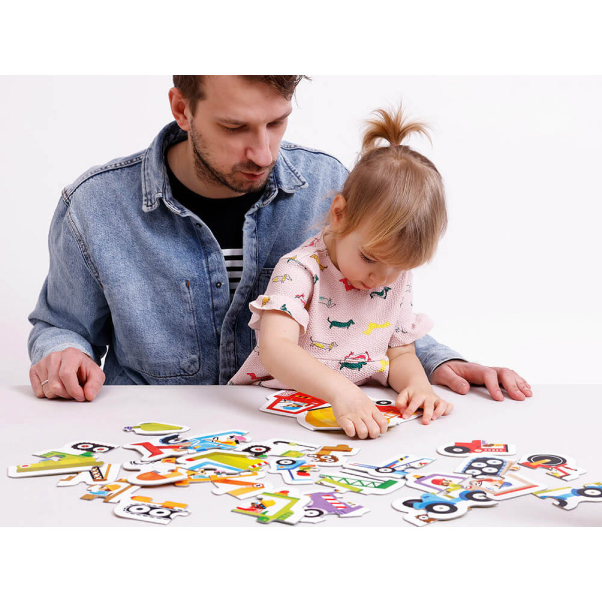 Gražios iliustracijos skatina žaisti, o produkto forma pritaikyta 2 metų vaikui. Rinkinys supakuotas į spalvingą dėžutę su patogiu laikikliu, puikiai tinka kaip dovana.