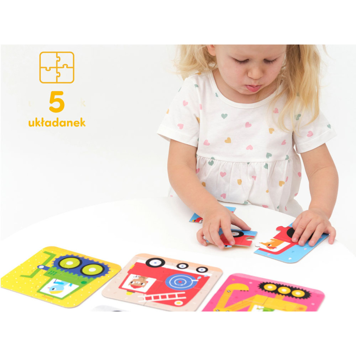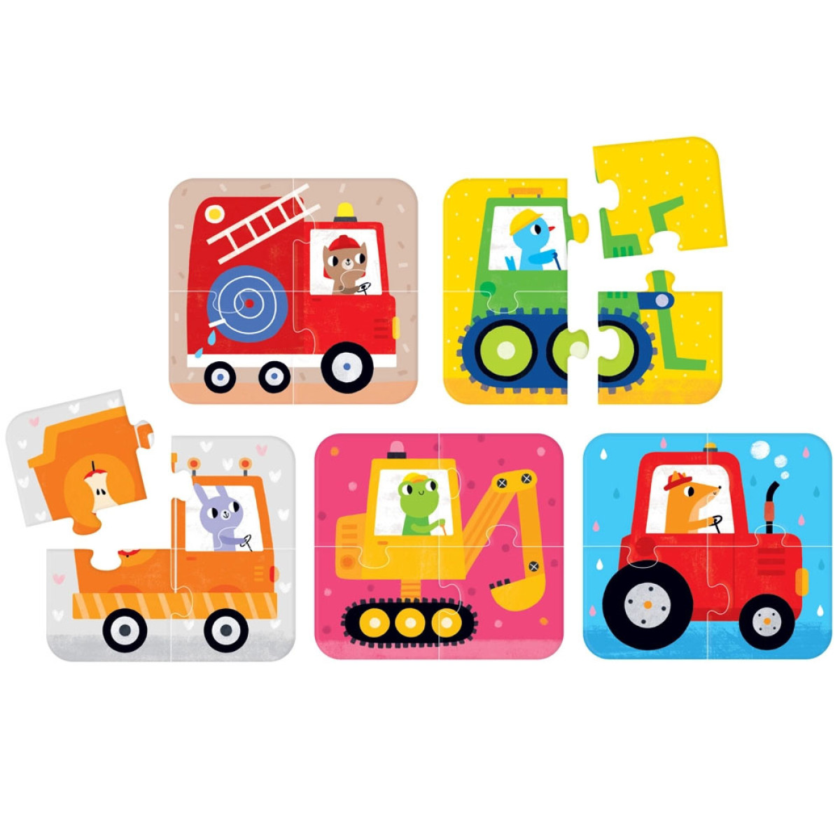 Patogioje dėžutėje rasite net penkias keturių dalių dėliones. Pasakų iliustracijos įkvepia mažuosius dėlioti, kas puikiai lavina mažus rankytes ir vysto pastabumą. Dėlionės skatina pažinti gyvūnų, transporto priemonių ir spalvų pavadinimus, skleidžia garsus, o net ir judriuosius žaidimus – leiskitės į vaizduotės kelionę! Mažieji didelių mašinų gerbėjai rekomenduoja transporto priemones kaip pirmąsias daugelio dalių dėliones.