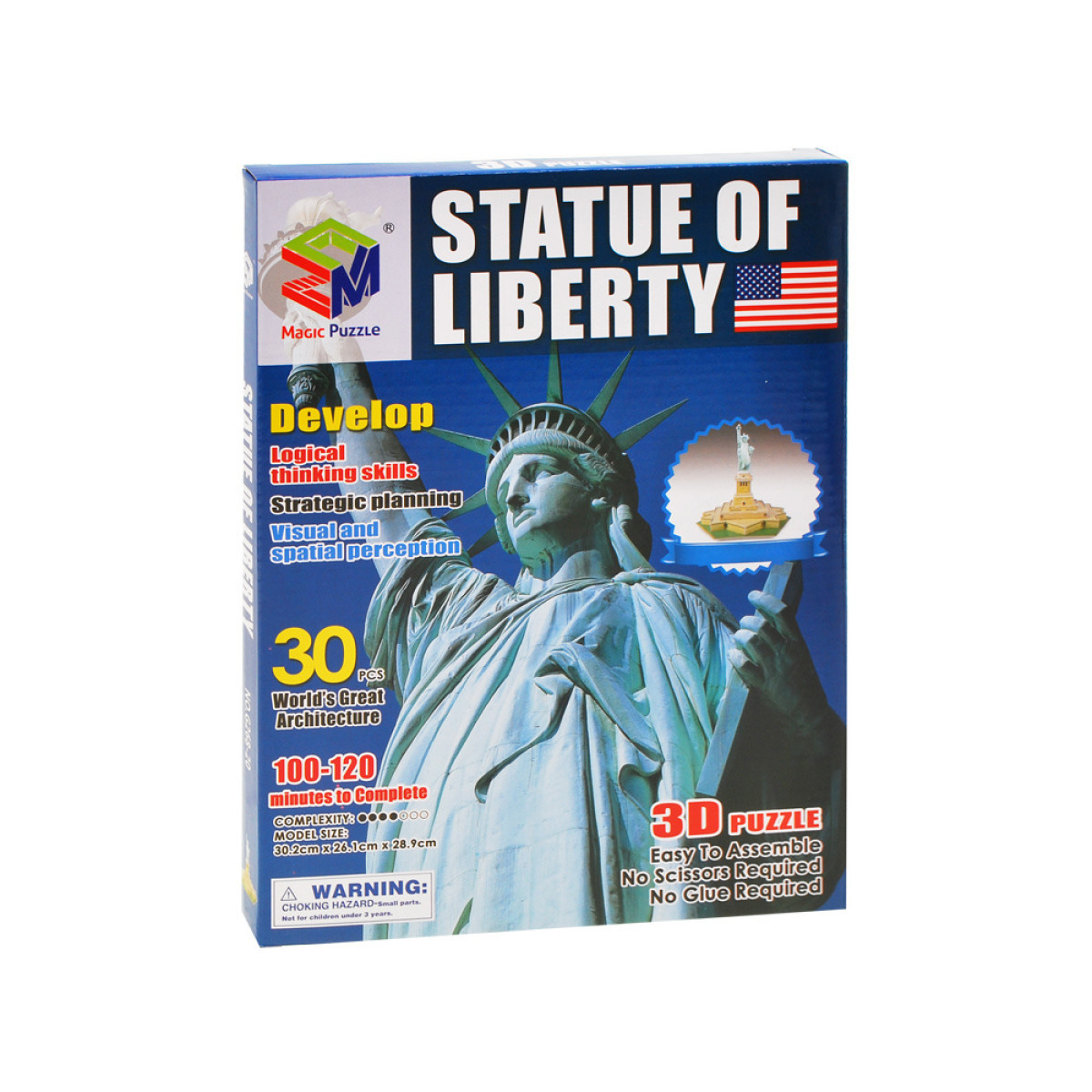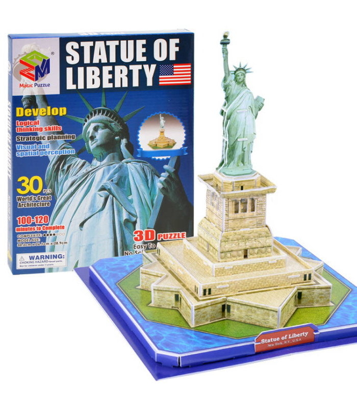 Erdvinė 30 dalių dėlionė, vaizduojanti garsųjį Amerikos Laisvės statulą, tikrai sužavės kiekvieną mažą 3D dėlionių ar modeliavimo entuziastą. Dėlionės dalys yra specialiuose lakštuose, todėl jų surinkimui nereikia jokių aštrių daiktų ar klijų.