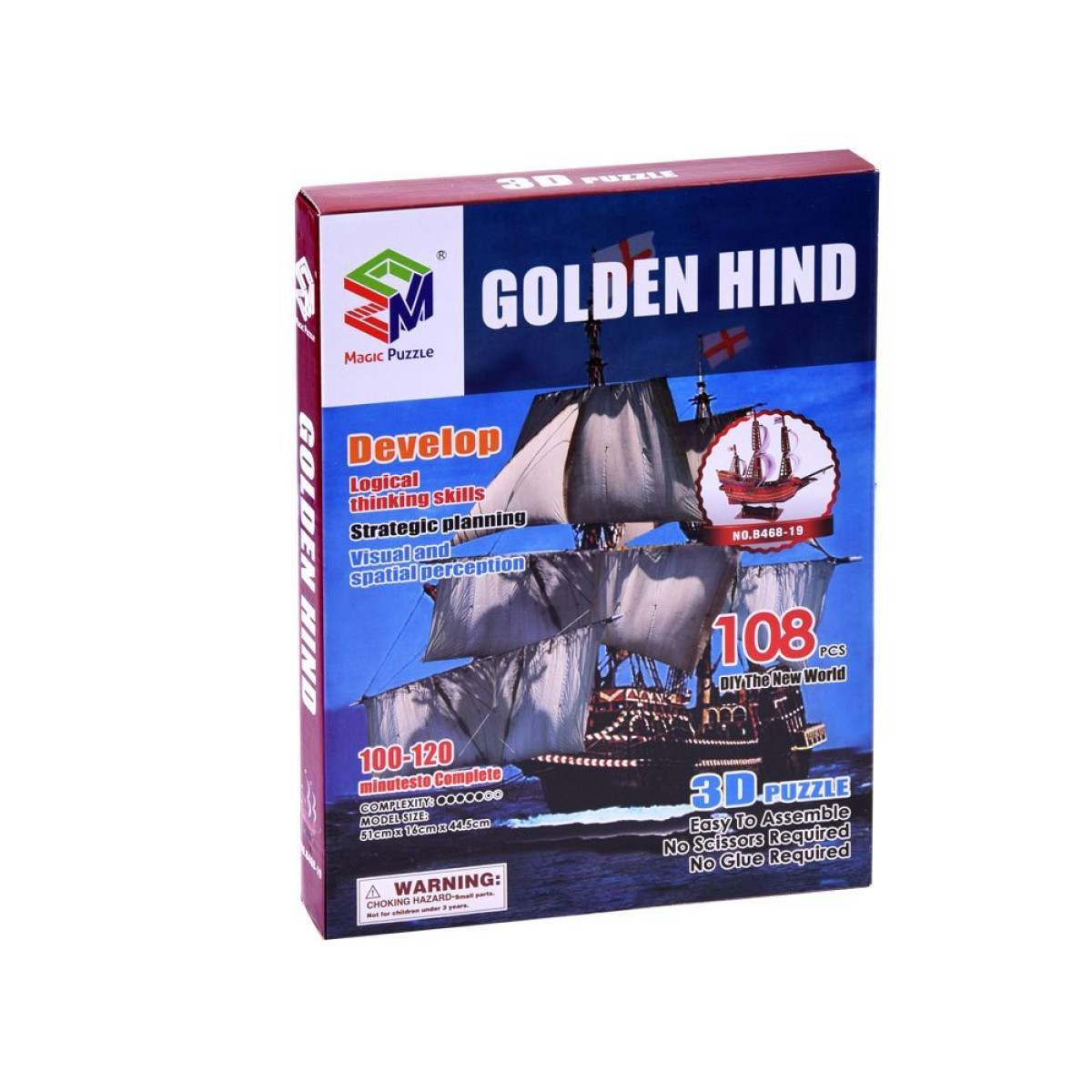 Fantastiškas 3D dėlionių rinkinys, leidžiantis sukurti nuostabų laivą. Galeonas Golden Hind, dar vadinamas Auksine Elne, buvo Francis Drake flagmaninis laivas jo kelionėje aplink pasaulį. Šis dėlionių rinkinys suteikia puikią pramogą dėlionių entuziastams ir modeliuotojams. Kuriant laivą, lavinama erdvinė vaizduotė, galima atidžiai stebėti daugybę detalių. Ši veikla suteikia daug pasitenkinimo, moko kantrybės, reikalauja tikslumo ir švelnumo. Dėlionė nereikalauja įrankių, yra lengva surinkti, o galutinis laivas tampa puikiu dekoratyviniu elementu. Dėlionės dalys pateikiamos specialiame kartoniniame lape. Modelis Golden Hind sudarytas iš 108 dalių. Surinkto rinkinio išmatavimai pagal gamintoją yra 51 x 16 x 44,5 cm. Rinkinys supakuotas įspūdingame įpakavime, puikiai tinkančiame dovanai.