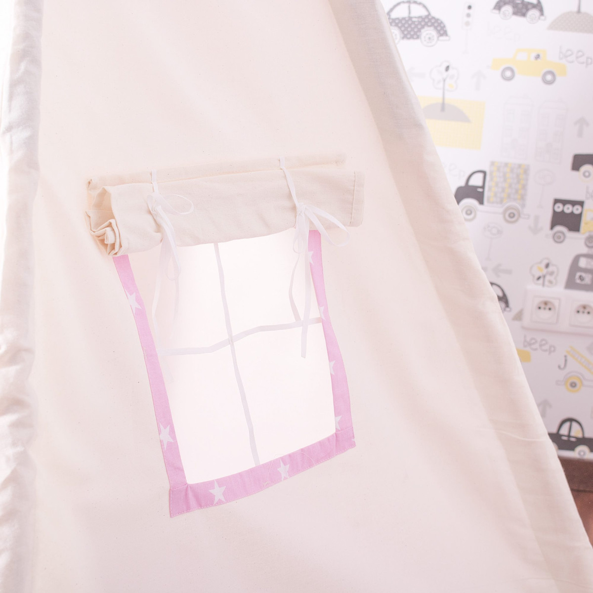Ši žavi vaikiška palapinė yra pagaminta iš 100% medvilnės, užpildyta silikono pūkais ir turi tvirtą pušies medienos rėmą. Palapinė puošta rožinėmis žvaigždutėmis, kurios suteikia unikalų ir patrauklų dizainą.
