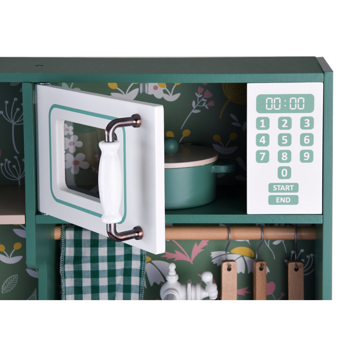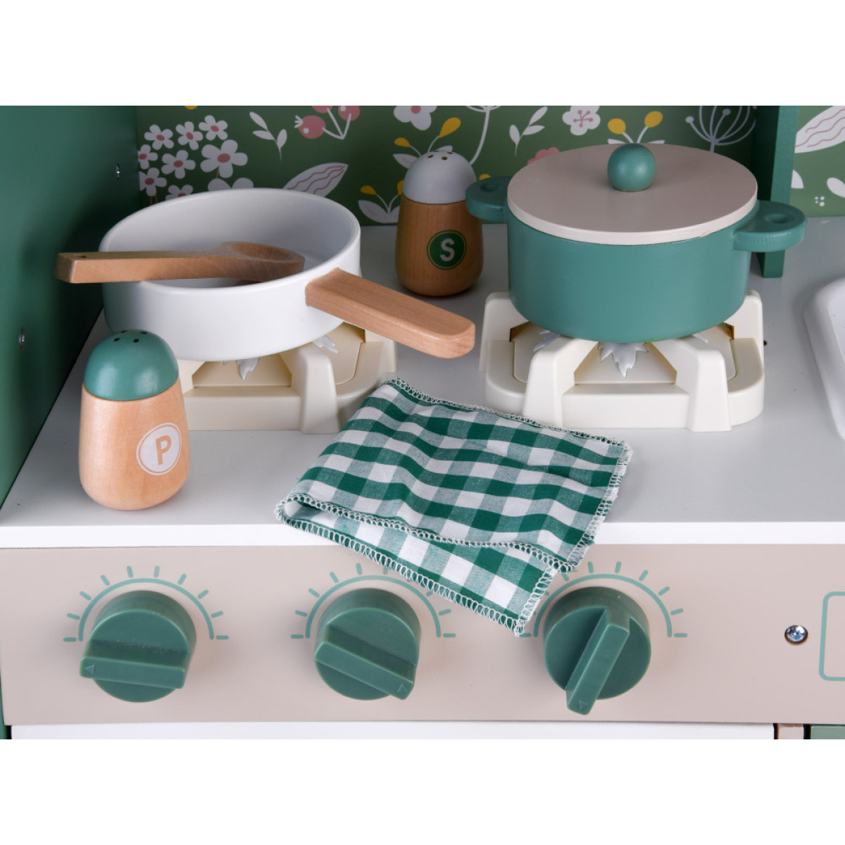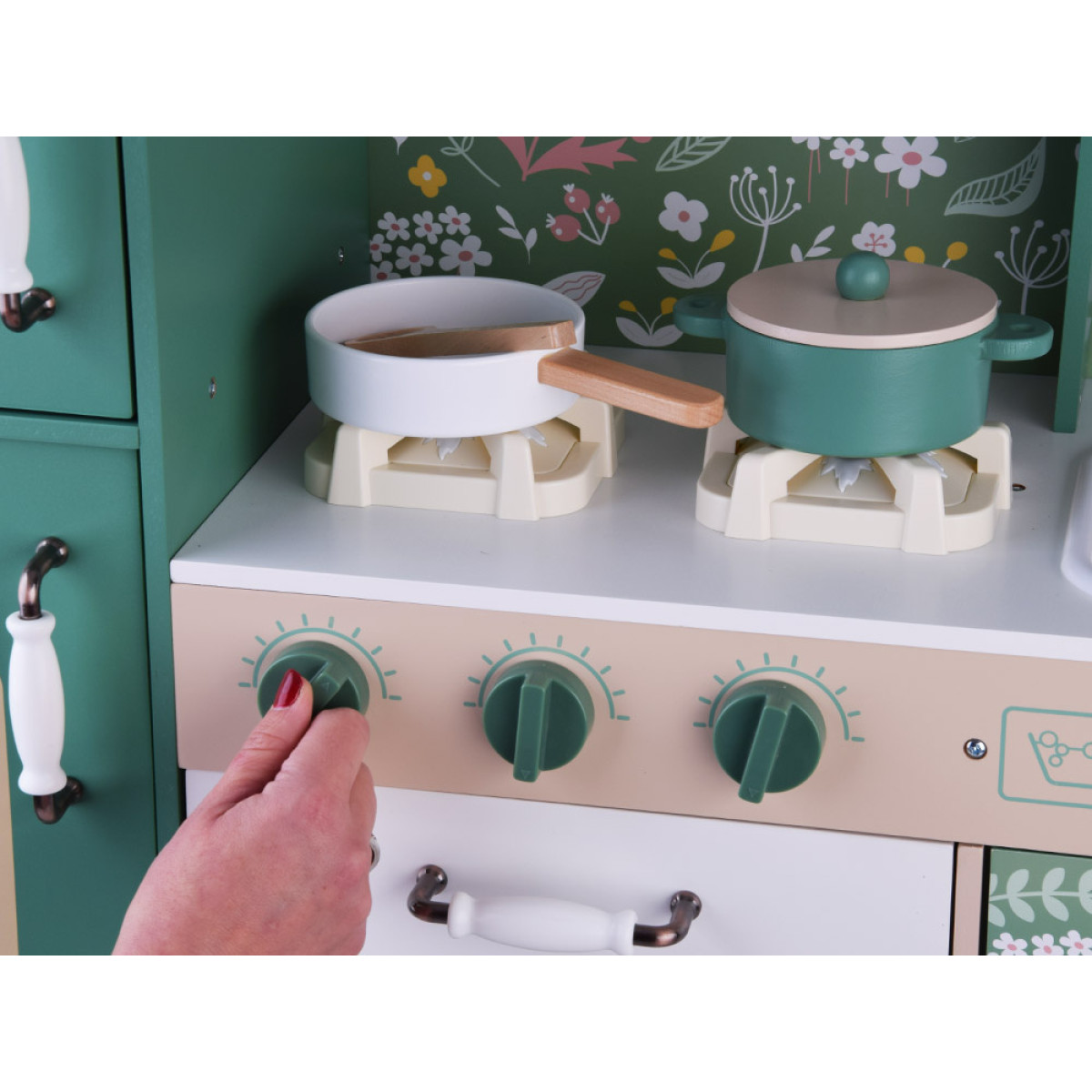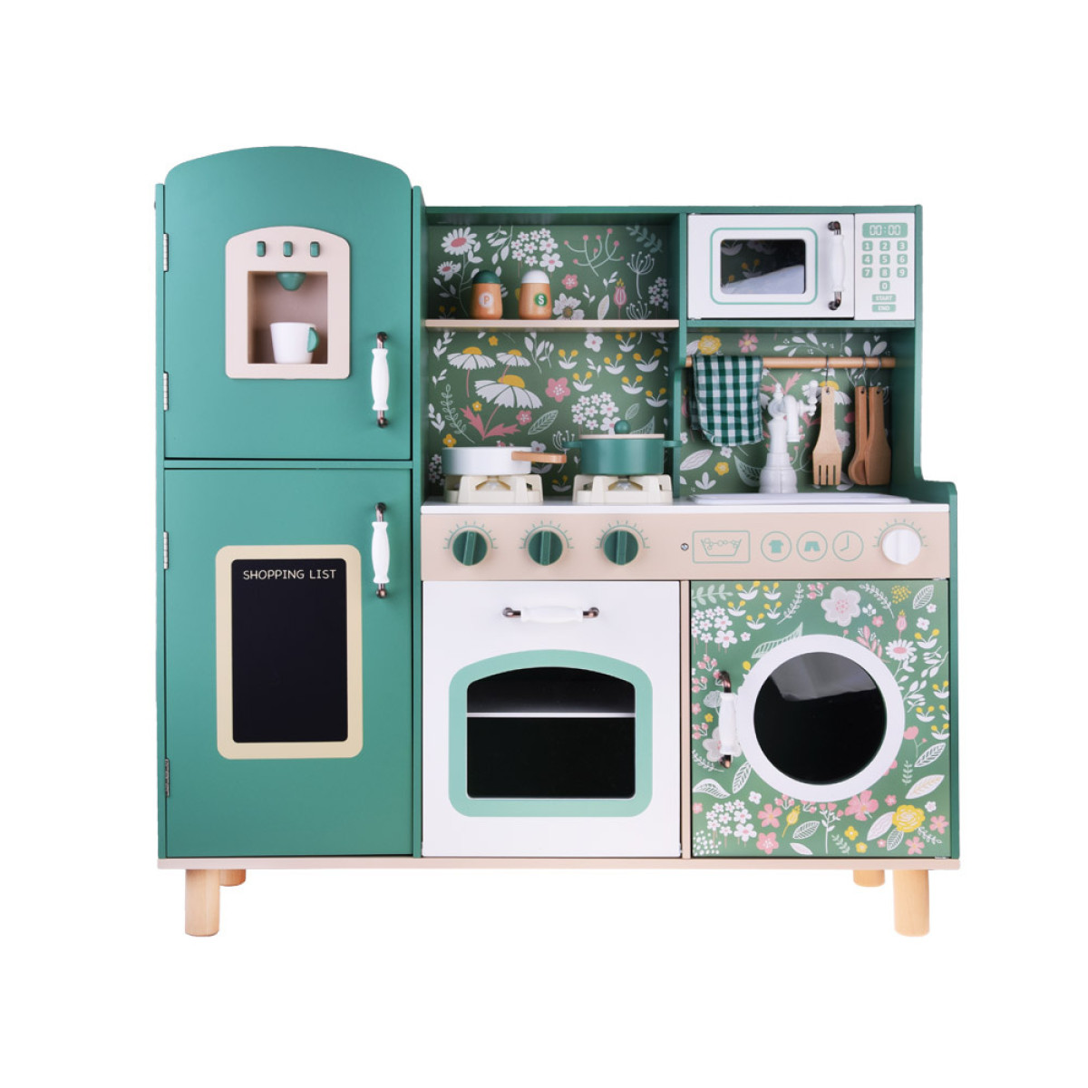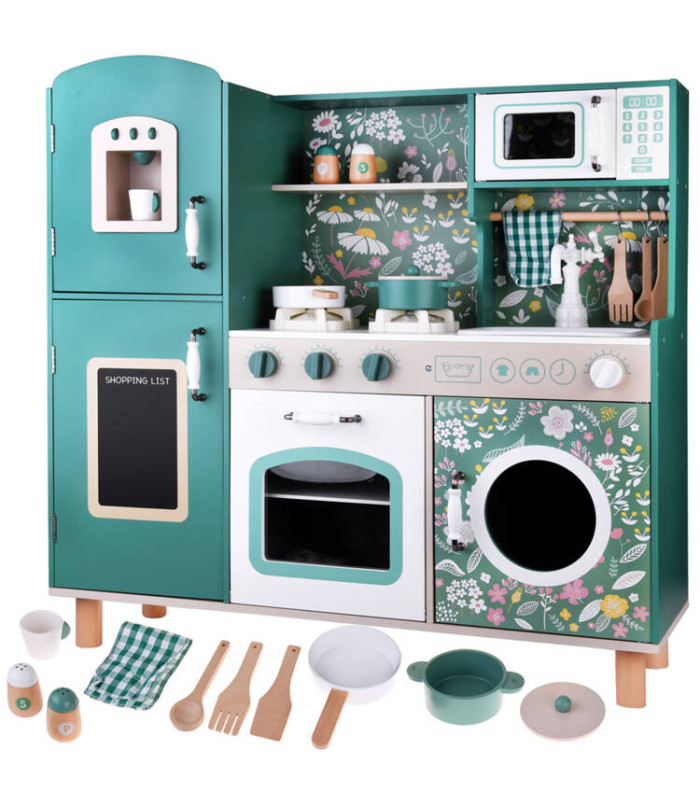 Virtuvė turi visus būtinus priedus, kad būtų gerai organizuota buitis. Žalia vintage stiliaus virtuvė yra pagaminta su detalių atidumu, o gėlių dekoracijos suteikia jai išskirtinį stilių, kuris puikiai tiks bet kuriame vaikų kambaryje. Medinės virtuvės yra amžinos ir ilgaamžės, o išsamiai aprūpintas komplektas užtikrins daugybę valandų nuostabaus žaidimo.