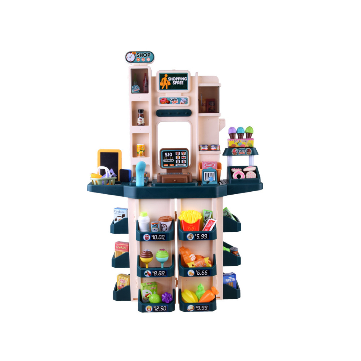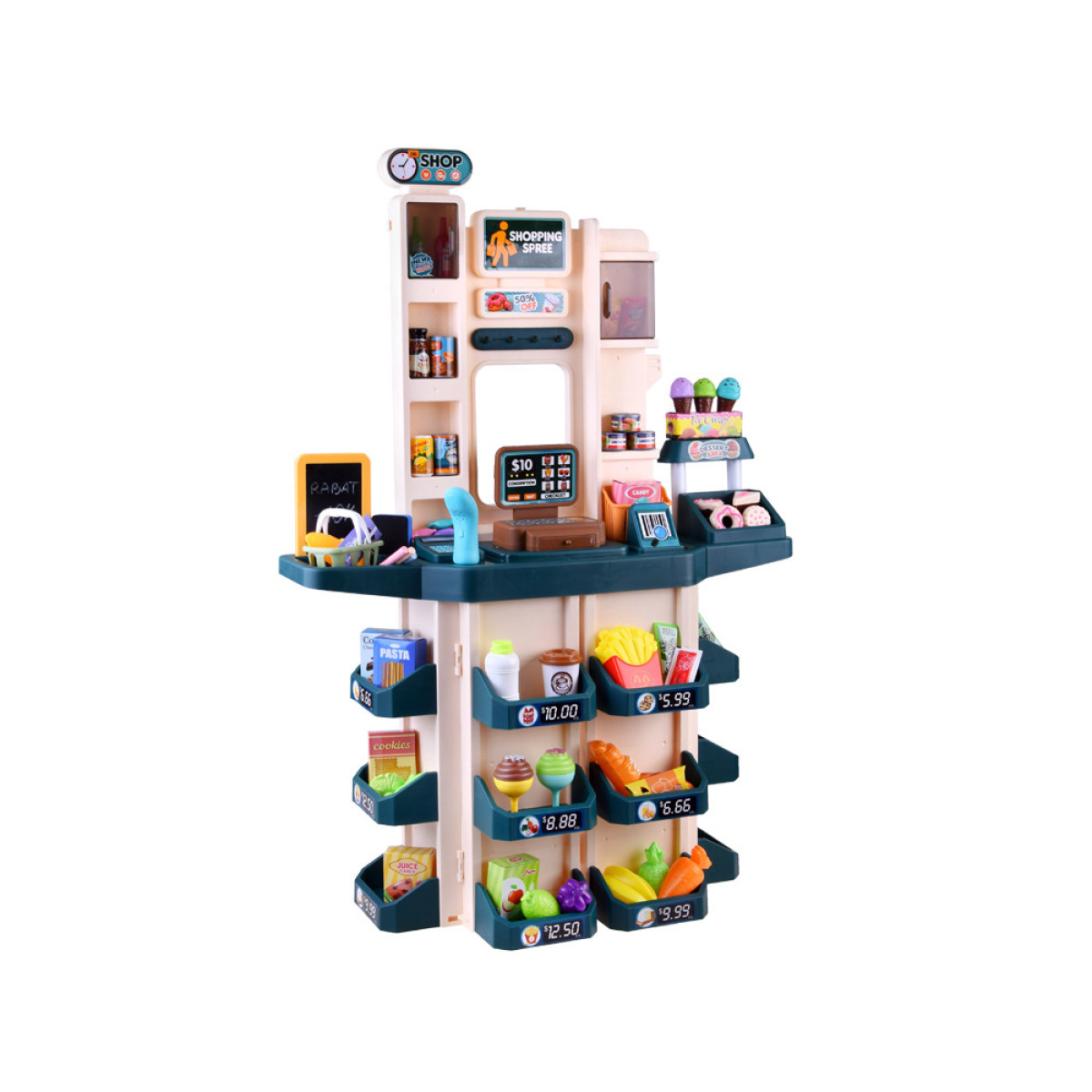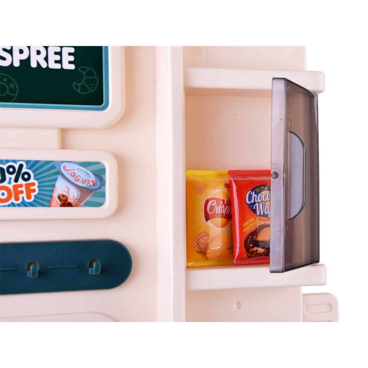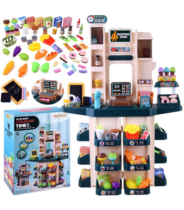 Vaikai mėgsta mėgdžioti suaugusiuosius, žaisdami gydytojus, namų šeimininkus ar parduotuvę. Šis didelis, turtingai įrengtas rinkinys turi viską, ko reikia norint atidaryti savo mažą prekybos centrą. Žaidžiant parduotuvę, vaikas mokosi skaičiuoti, įgyja socialinių įgūdžių ir tai yra puiki proga pasikalbėti apie sveiką mitybą. Žaislas pagamintas iš plastiko su maloniomis, ramiomis spalvomis, o spalvingi lipdukai ir reklaminiai baneriai suteikia parduotuvei tikrovišką išvaizdą.