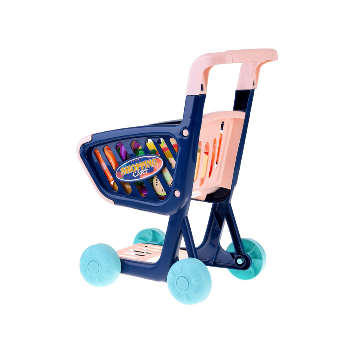Didelis pirkinių vežimėlis su daržovėmis yra puikus žaislas žaidimui parduotuvėje.
