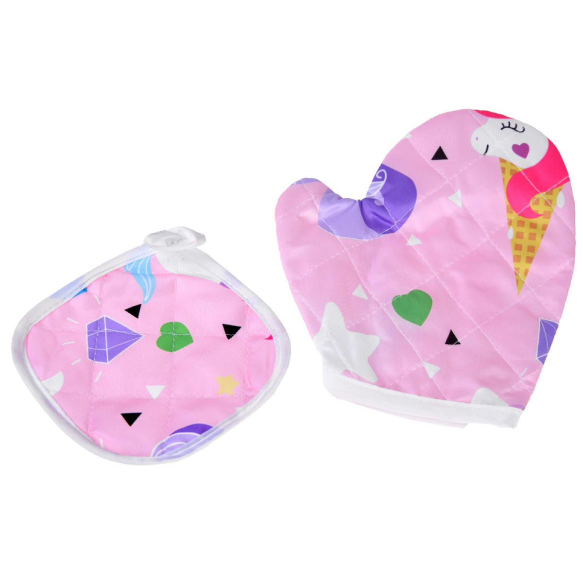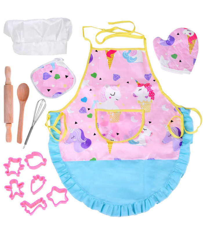 Žavingas vienaragio motyvo virtuvės prijuostės rinkinys su aksesuarais - puikus pasirinkimas kiekvienam mažajam pagalbininkui virtuvėje. Rinkinys turi viską, ko reikia saugiai ir įdomiai padėti mamai ruošiant patiekalus ar kepant pyragus ir sausainius.