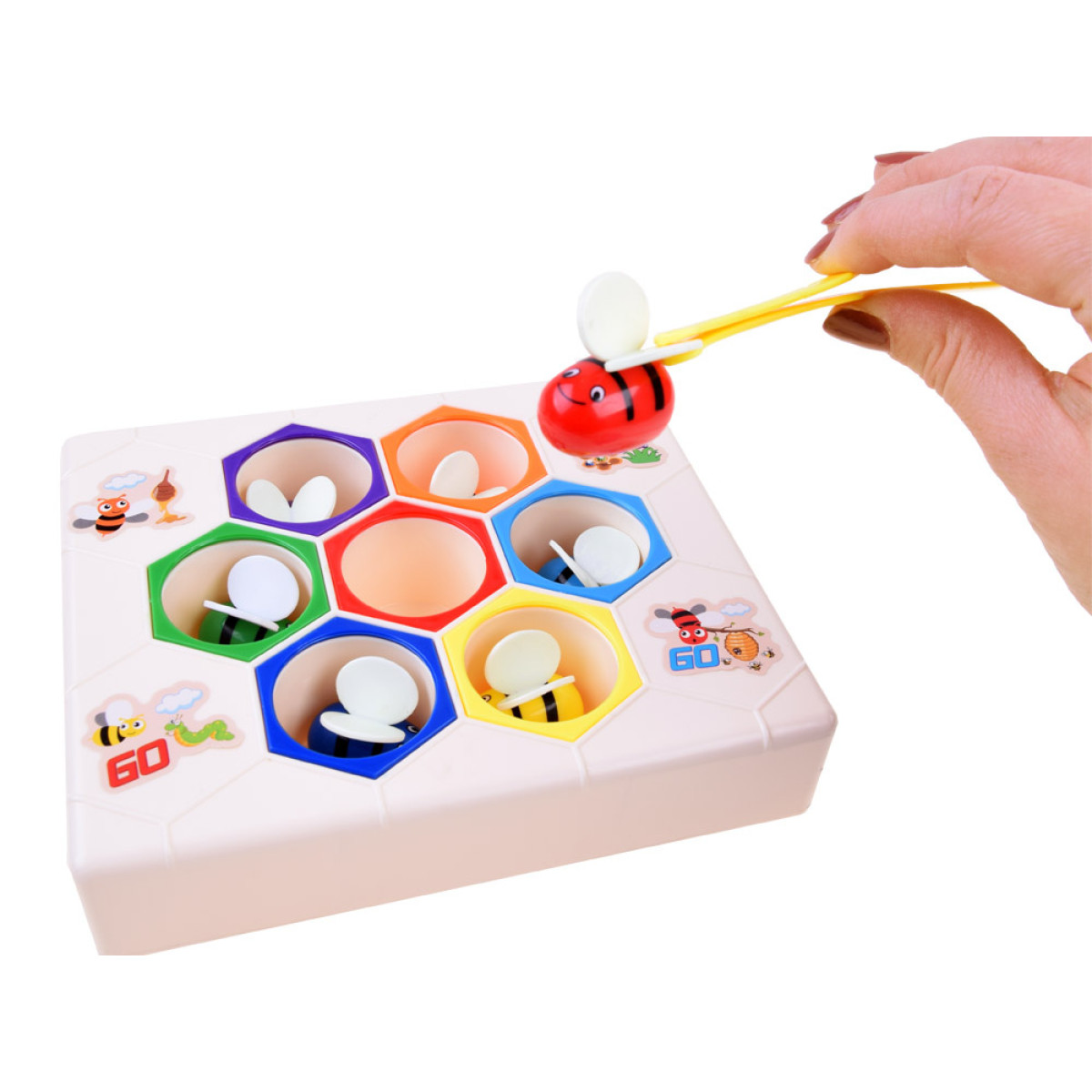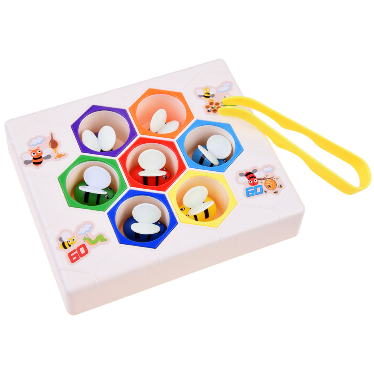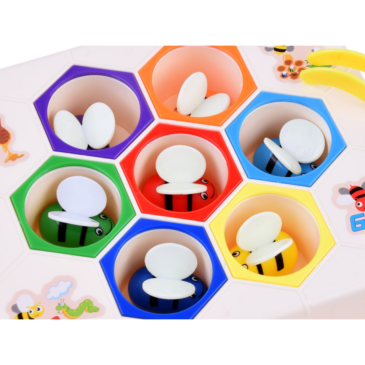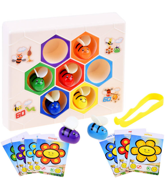Edukacinis žaislas darbščiosios bitės ant medaus korio yra skirtas vaikams nuo 3 metų amžiaus. Šis žaislas pagamintas iš tvirto plastiko. Rinkinį sudaro 7 bitės, kiekviena skirtingos spalvos. Su žaislu galima žaisti dviem būdais: