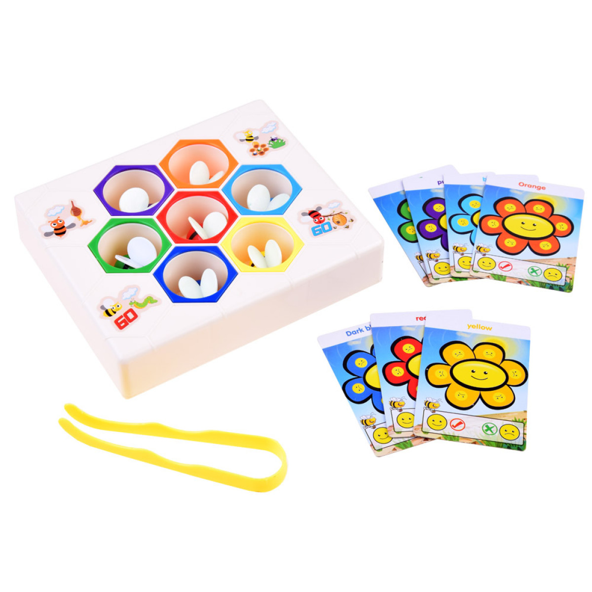 - Vaiko užduotis yra ištraukti kortelę ir, naudojant pridedamą pincetą, išimti tos spalvos bitę, kuri nurodyta kortelėje, ir padėti ją ant kortelės gėlytės.