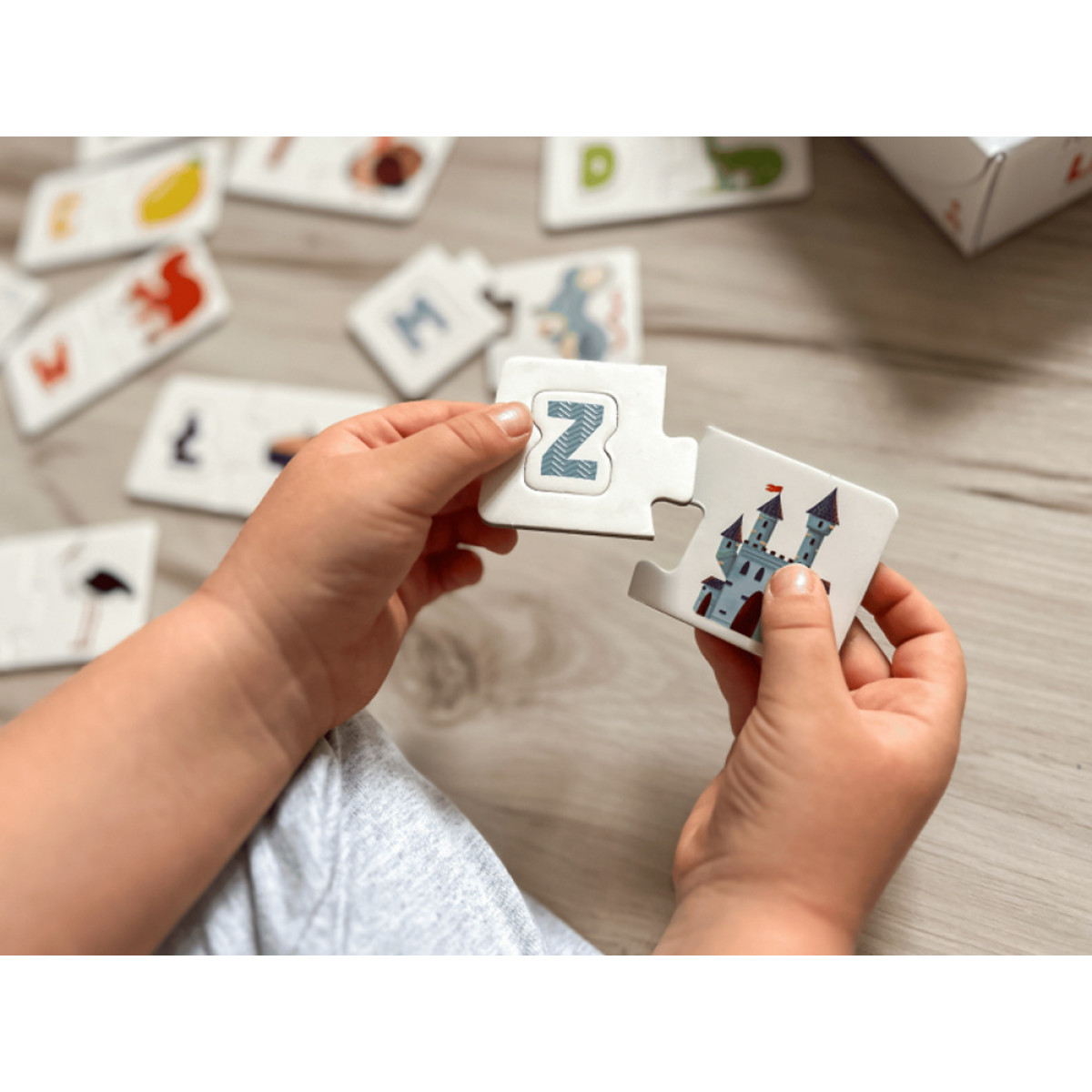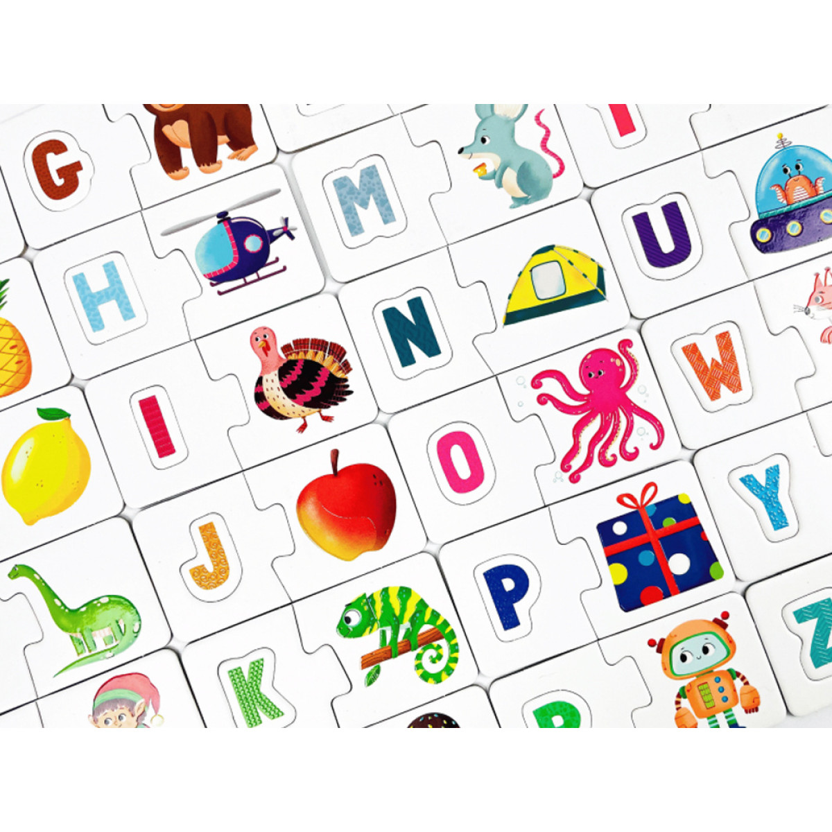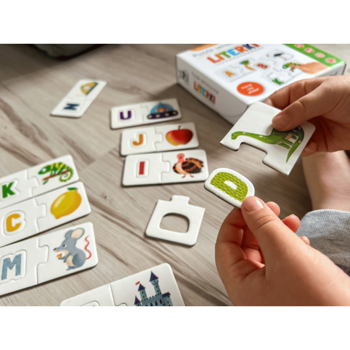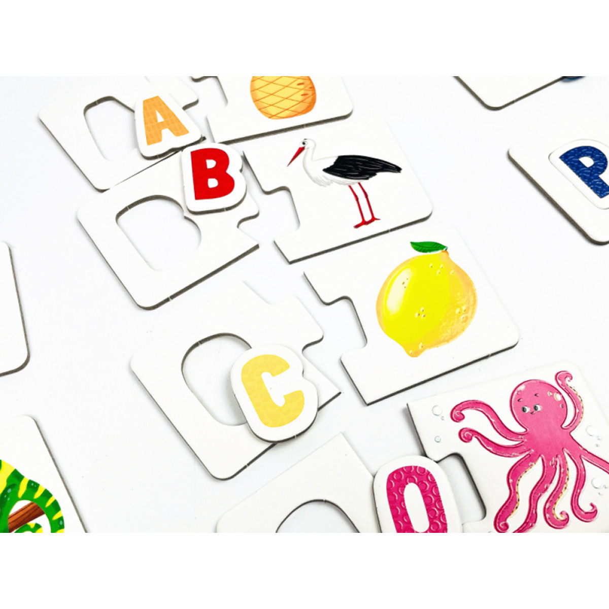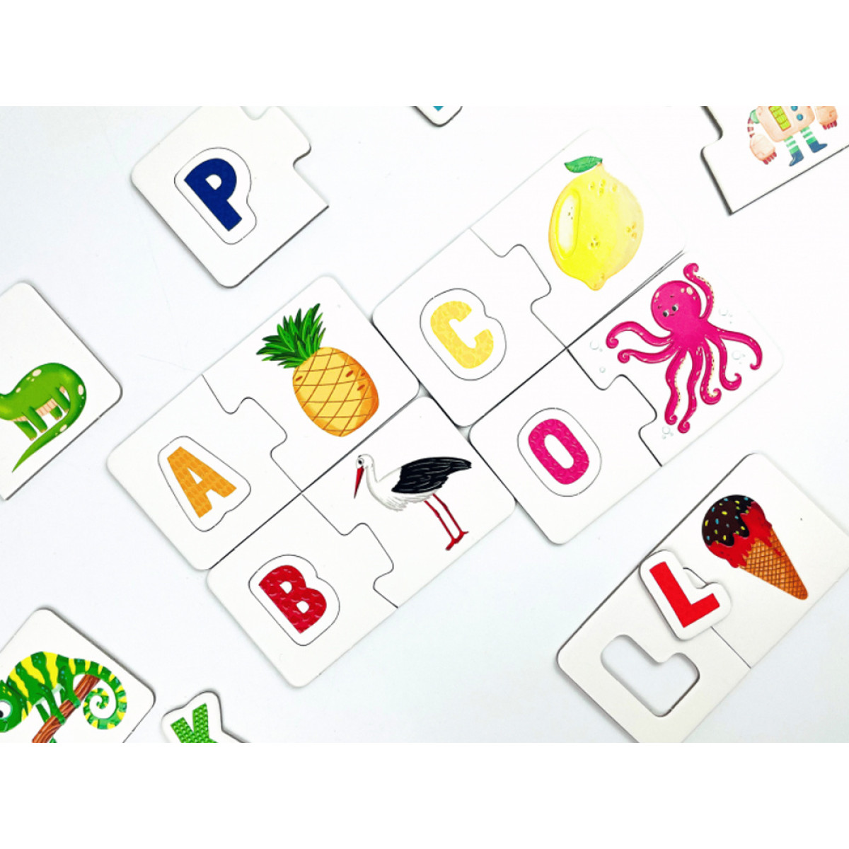 Paveikslėliai dėlionėse vaizduoja gyvūnus, vaisius ir daiktus, žinomus vaikams iš kasdienio gyvenimo. Rinkinyje taip pat rasite instrukciją su žaidimų idėjomis, kurios padarys raidžių mokymąsi dar įdomesniu!