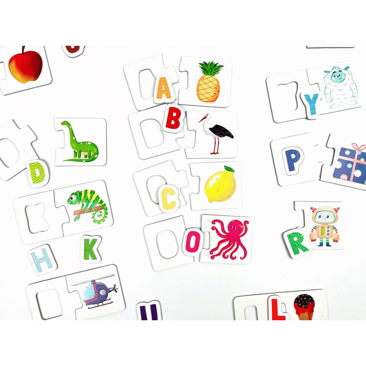 Rinkinyje yra 24 trijų dalių dėlionės (iš viso 72 elementai), kurios padeda pažinti ir įsiminti visas abėcėlės raides.