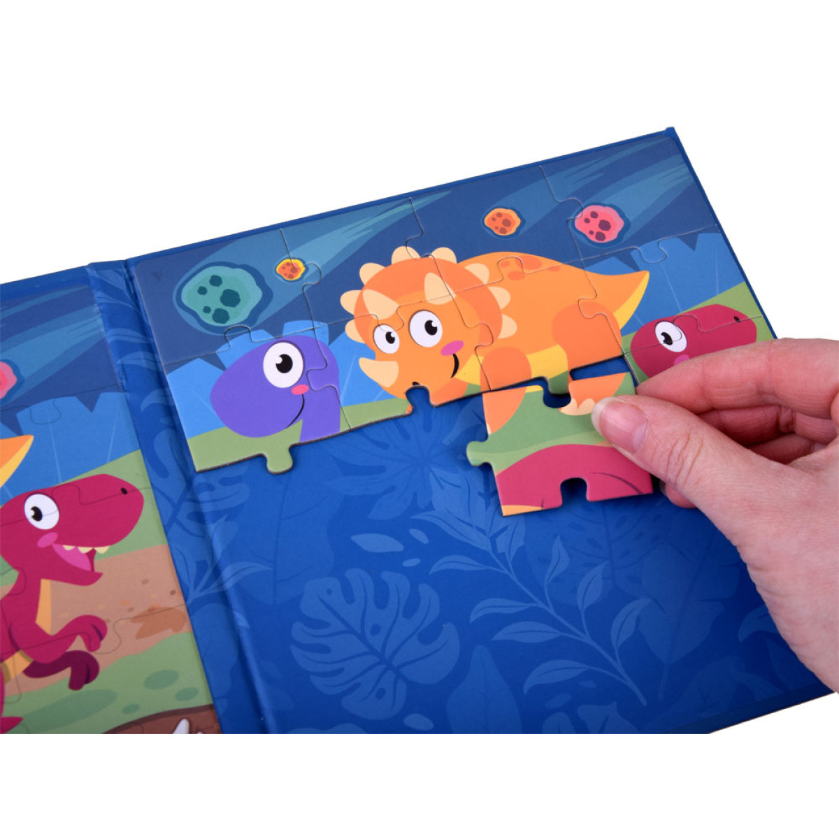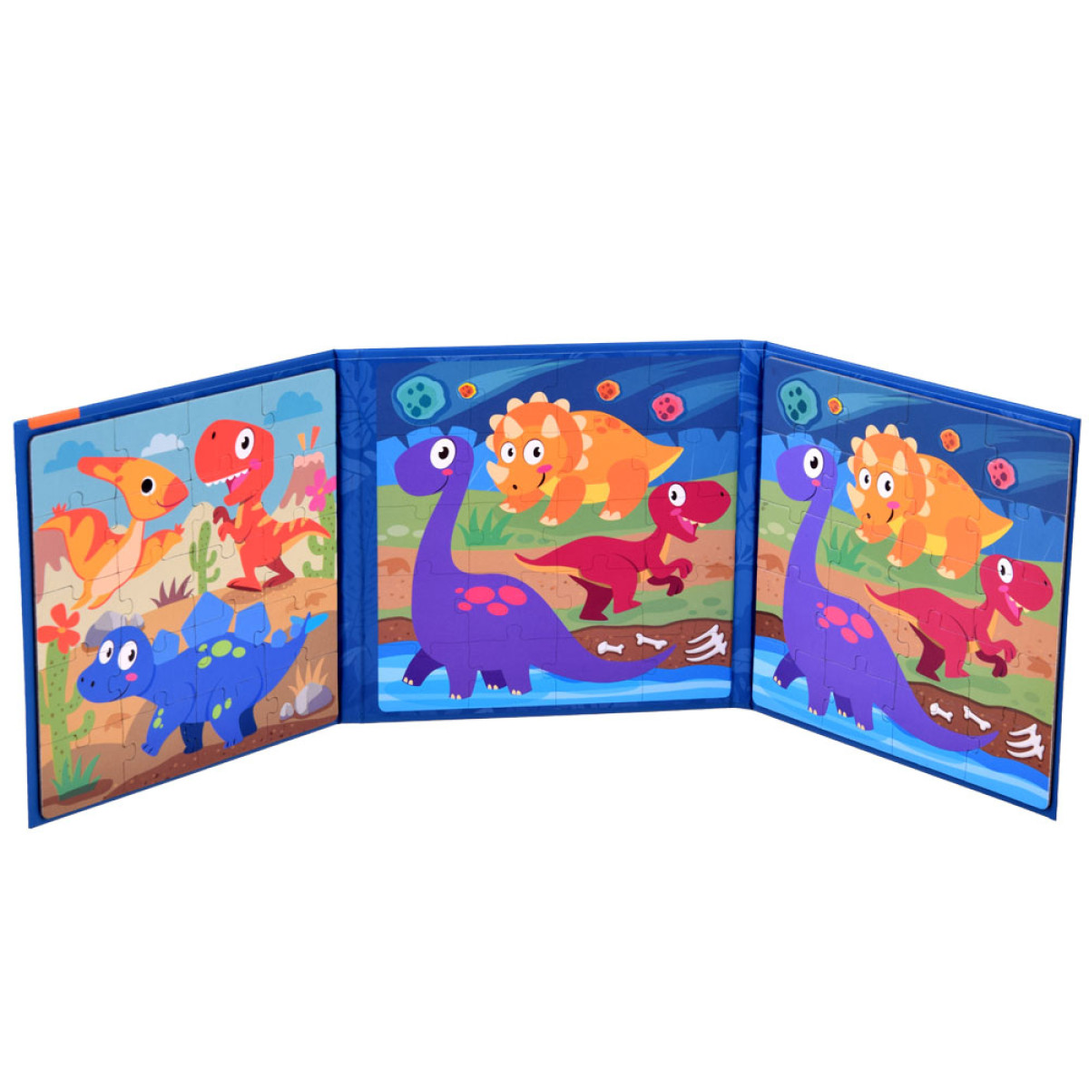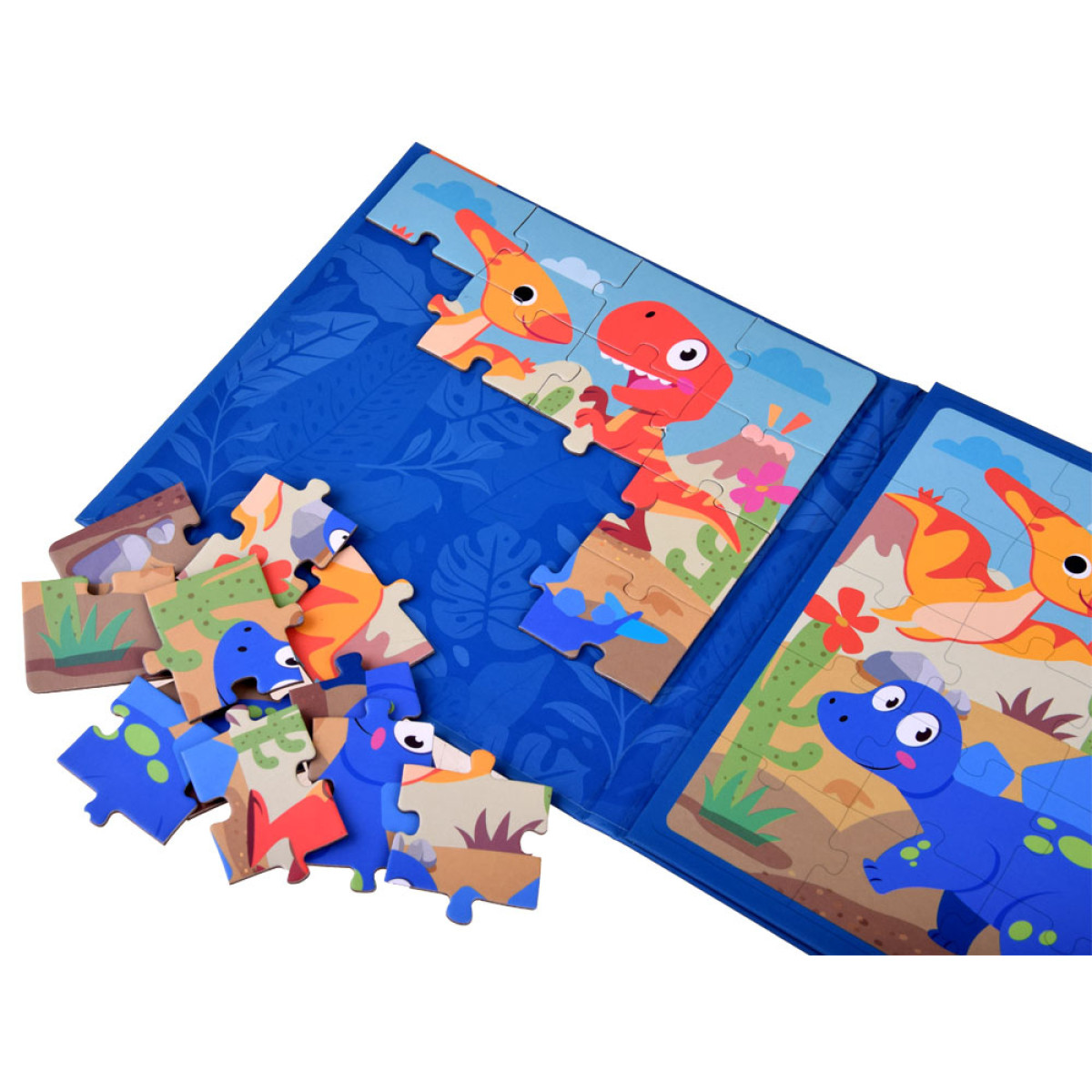 Spalvingos magnetinės dėlionės su dinozaurais, supakuotos tvirtoje knygutėje, suteiks kiekvienam vaikui daug kūrybinio malonumo. Rinkinį sudaro dvi magnetinės lentelės, vaizduojančios linksmus dinozaurus. Vaiko užduotis – sudėti ir priderinti elementus, kad būtų suformuotos lentelės su linksmu dinozaurų vaizdu.