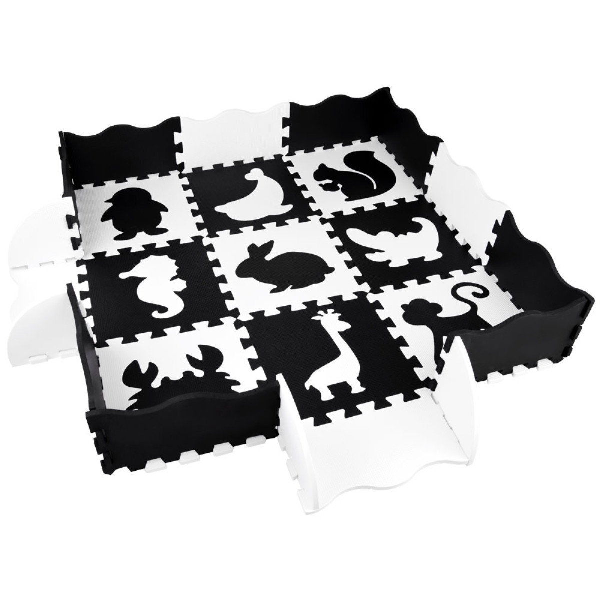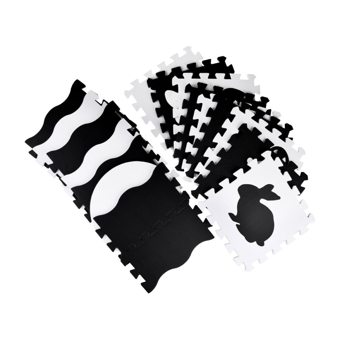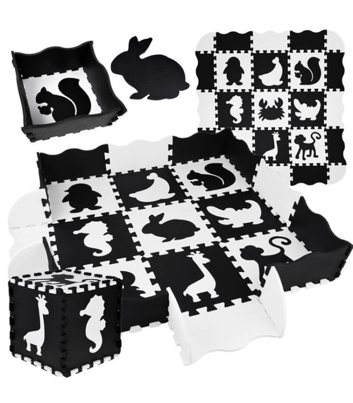 Didelis putplasčio kilimėlis vaikams, sudarytas iš 16 minkštų dėlionių kontrastingų juodos ir baltos atspalvių. Dėl savo modernios, neutralios spalvų paletės puikiai tinka bet kuriame vaikų kambaryje, o kontrastingos spalvos pritraukia mažiausiųjų dėmesį ir skatina kūdikių regėjimo vystymąsi.