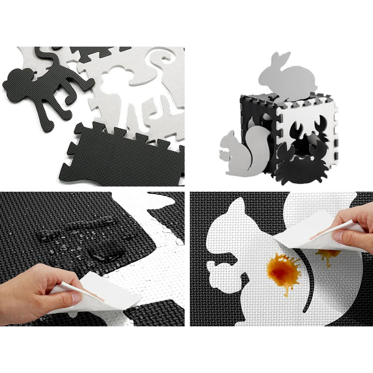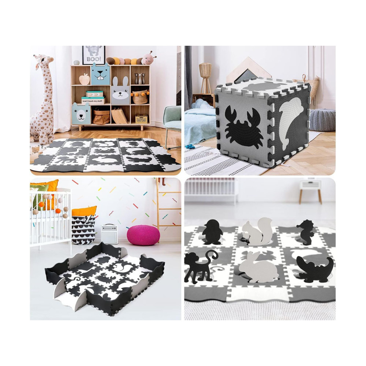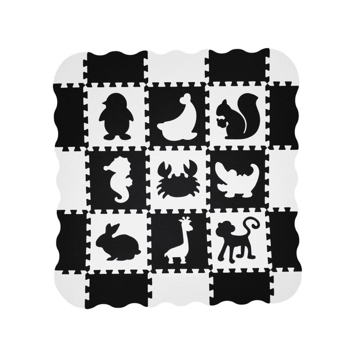 Didelis putplasčio kilimėlis vaikams, sudarytas iš 16 minkštų dėlionių kontrastingų juodos ir baltos atspalvių. Dėl savo modernios, neutralios spalvų paletės puikiai tinka bet kuriame vaikų kambaryje, o kontrastingos spalvos pritraukia mažiausiųjų dėmesį ir skatina kūdikių regėjimo vystymąsi.
