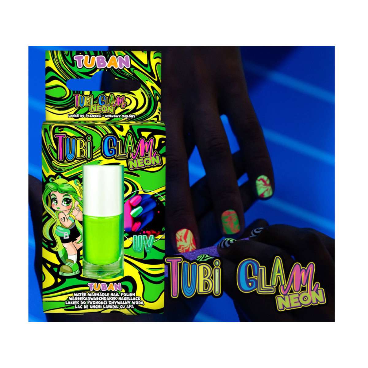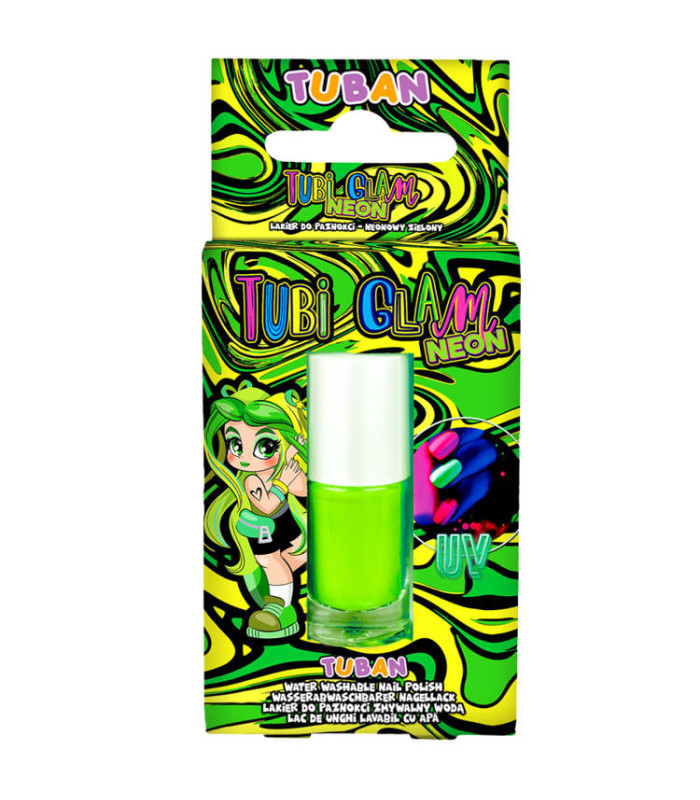 Neoninės TUBI GLAM nagų lako versijos yra ne tik intensyvi žalia spalva, bet ir saugumas naudojant. Jis sukurtas taip, kad būtų 100% saugus vaikų nagų plokštelei. Lakas gali būti lengvai pašalinamas šiltu vandeniu ir kempine, todėl mažoji mados sekėja galės keisti nagų spalvą net kelis kartus per dieną.