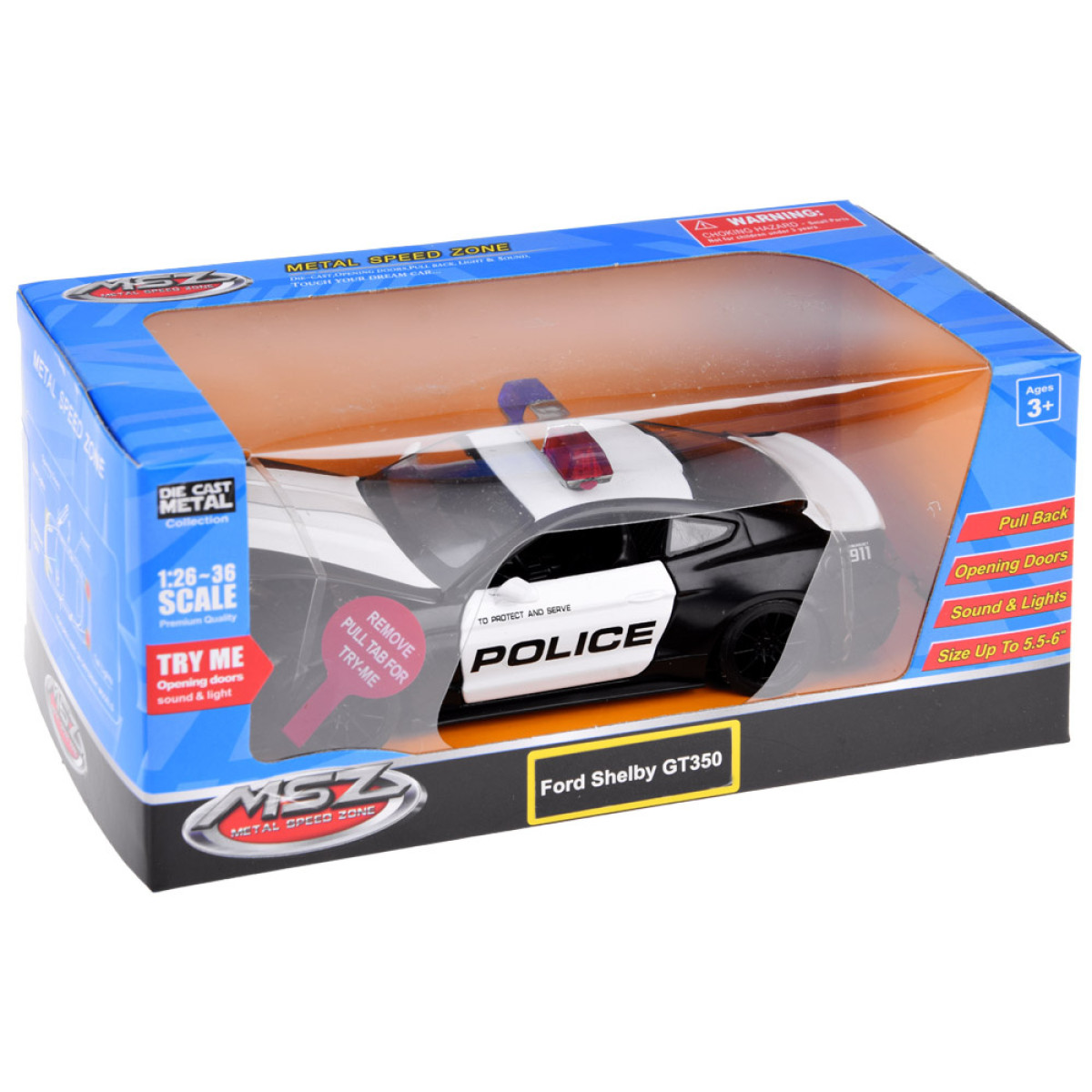 Atidarius duris ir prispaudus Ford Shelby GT350 prie grindų, išgirsime pavojaus signalus. Garso efektus lydi priekinės ir galinės šviesos bei mirksintys švyturėliai ant stogo. Visa automobilio korpusas yra metalinis, ratai guminiai, važiuoklė pagaminta iš plastiko.
