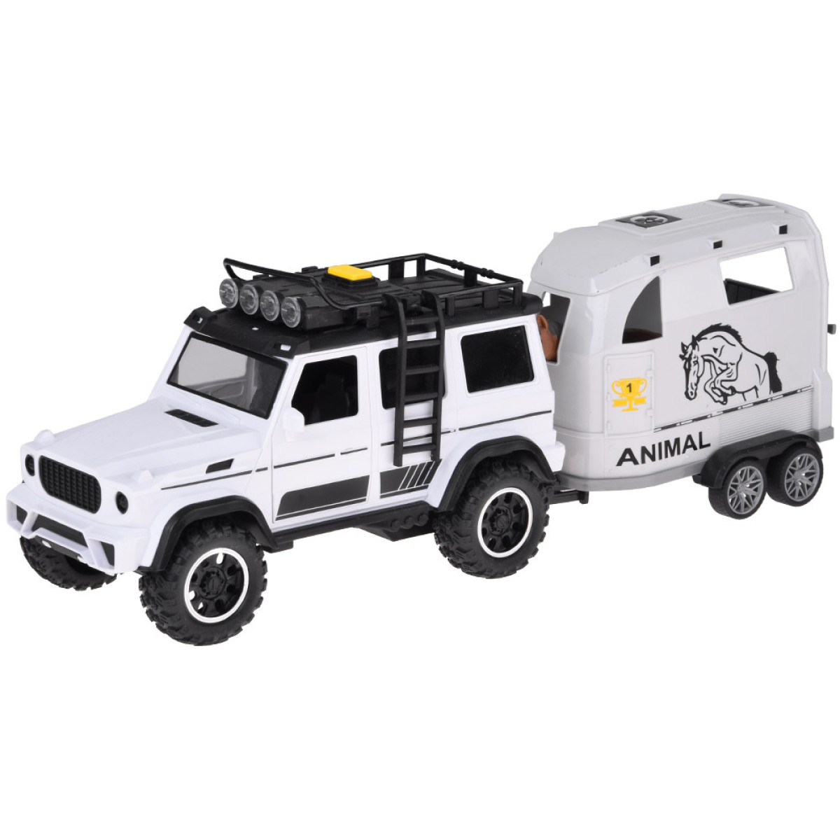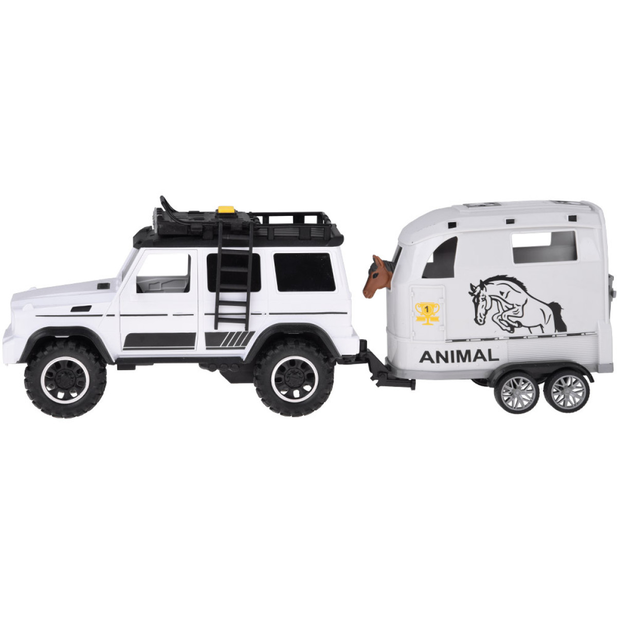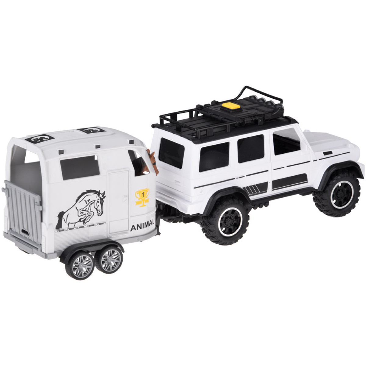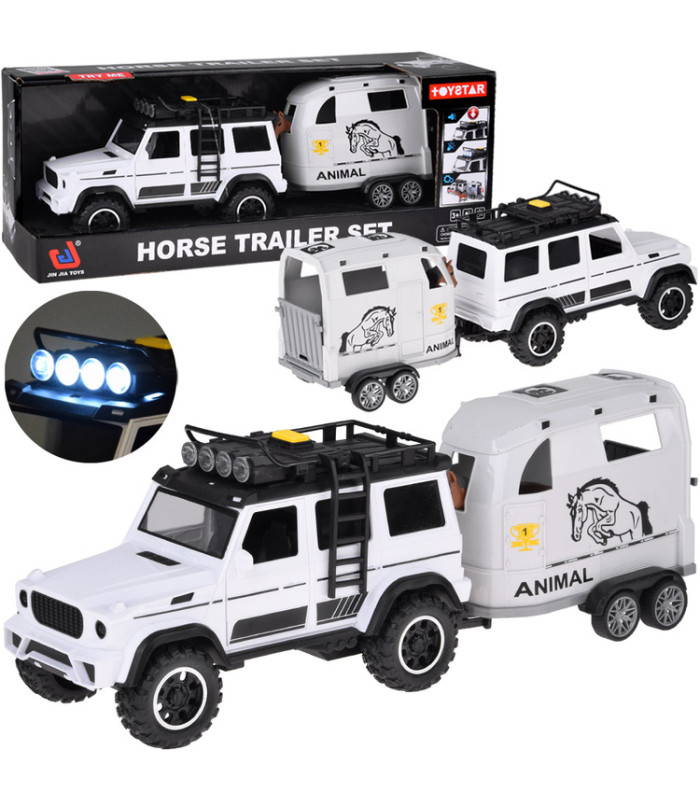 Šis žaislas yra puikus pasirinkimas vaikams, kurie mėgsta automobilius ir naudoti juos įvairių daiktų gabenimui. Rinkinį sudaro interaktyvus visureigis baltos spalvos su juodais akcentais ir šviesios spalvos atidaroma priekaba. Priekaba skirta saugiai vežti arklius, bet vaikas gali į ją įdėti viską, ką tik nori pervežti.
