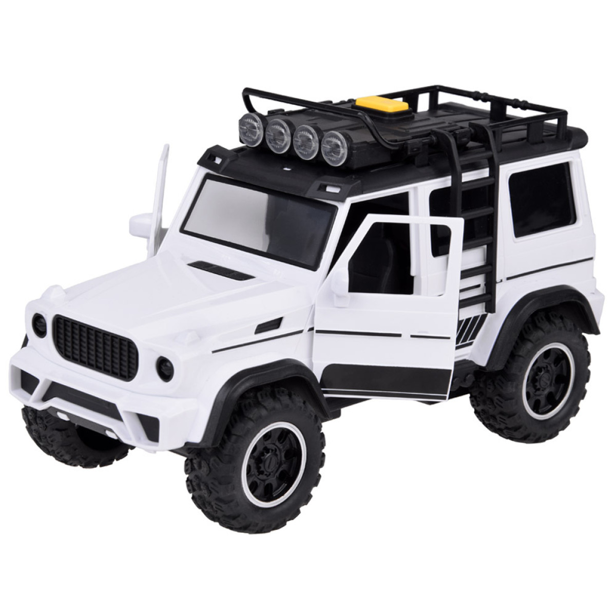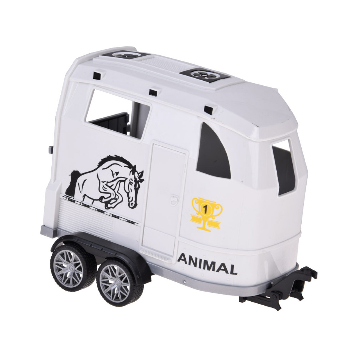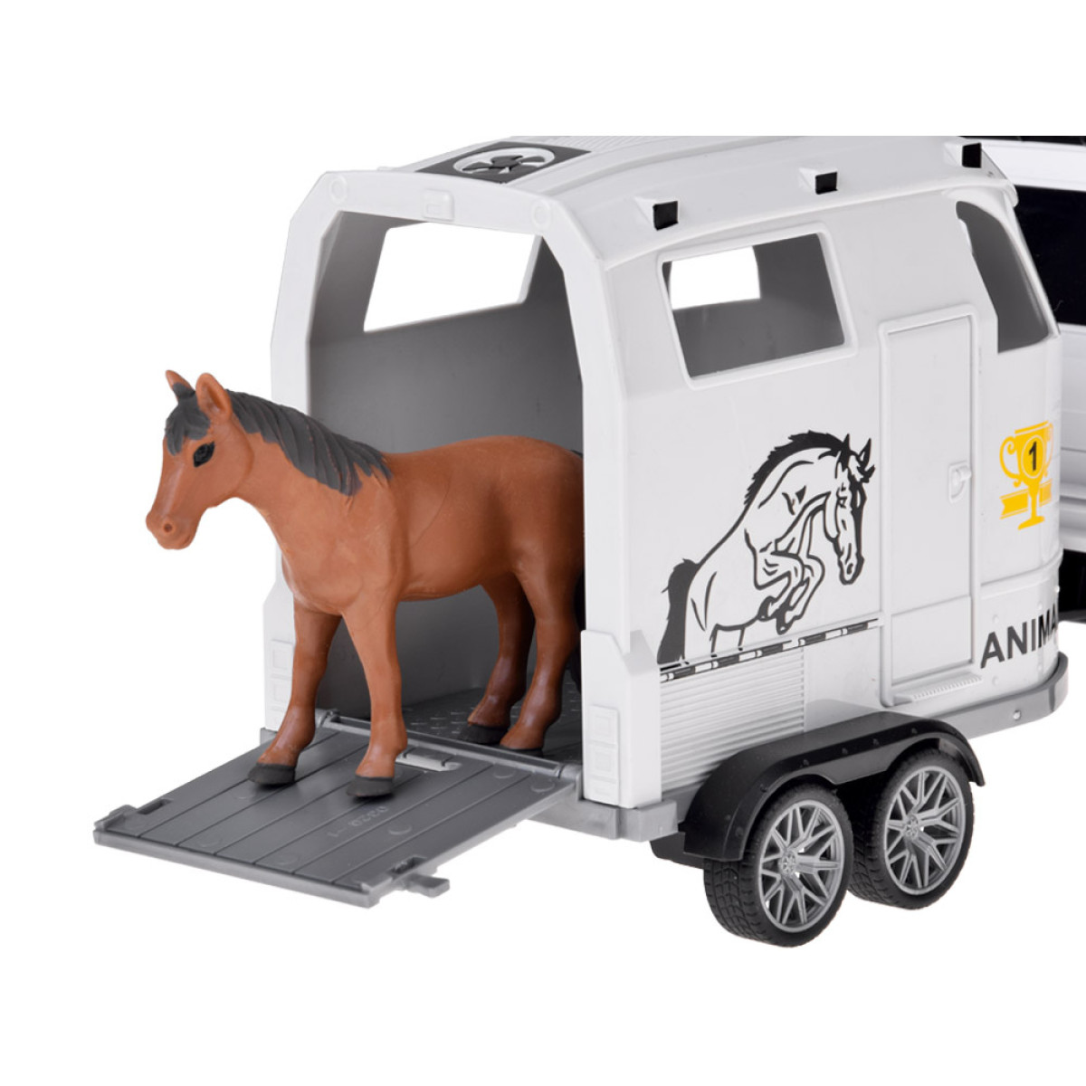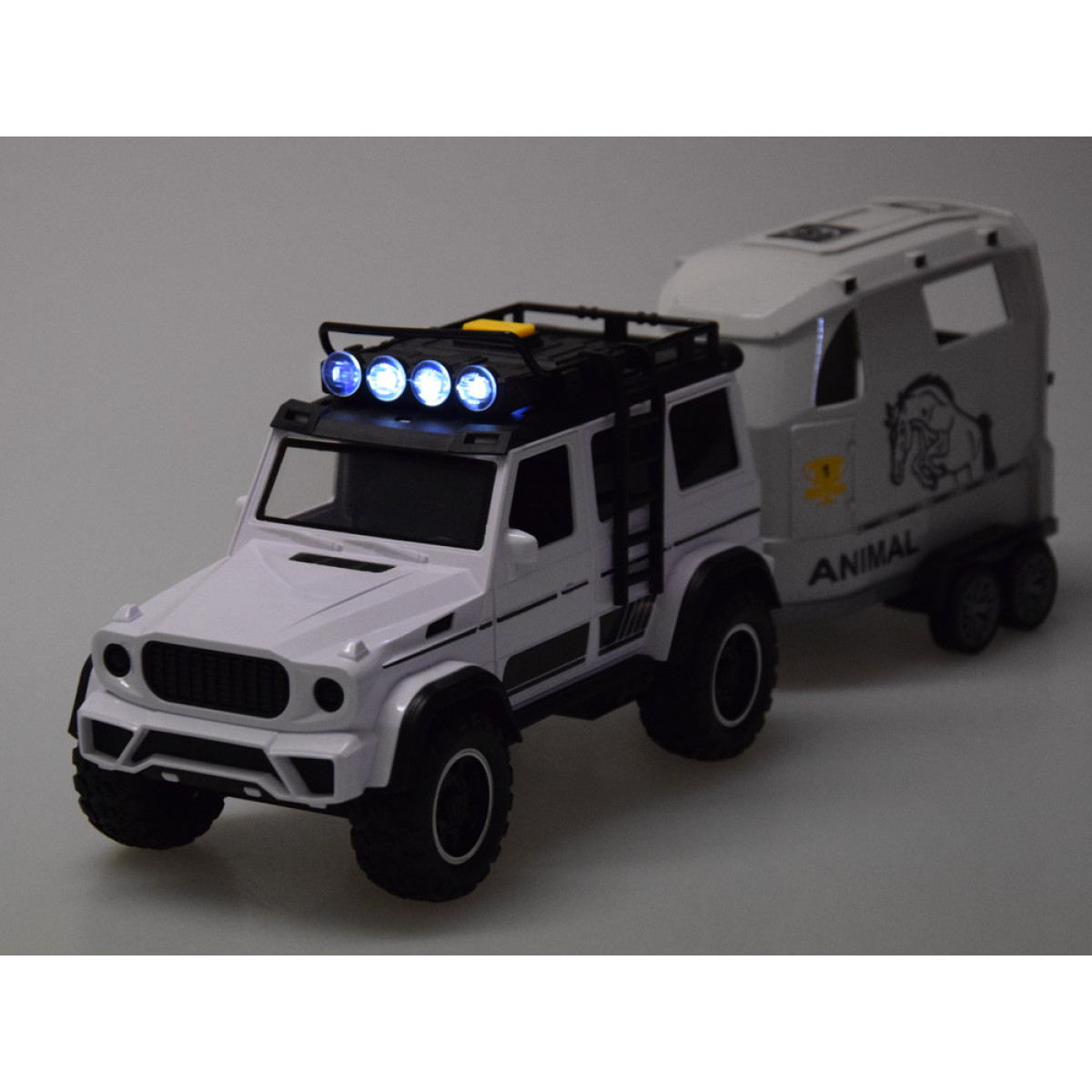 Šis žaislas yra puikus pasirinkimas vaikams, kurie mėgsta automobilius ir naudoti juos įvairių daiktų gabenimui. Rinkinį sudaro interaktyvus visureigis baltos spalvos su juodais akcentais ir šviesios spalvos atidaroma priekaba. Priekaba skirta saugiai vežti arklius, bet vaikas gali į ją įdėti viską, ką tik nori pervežti.