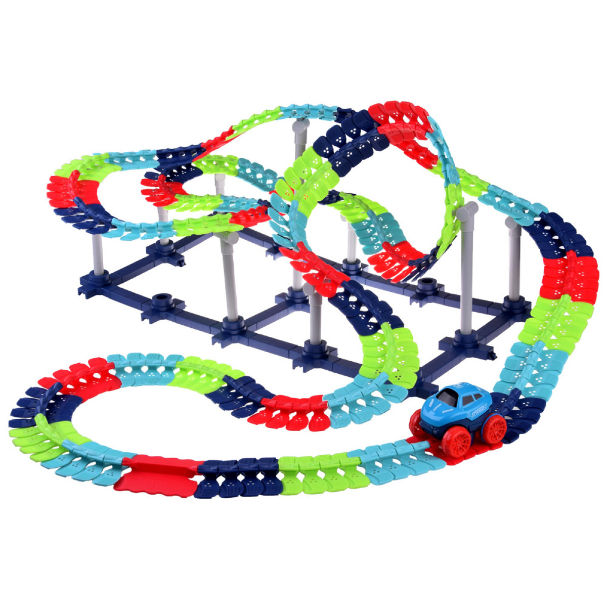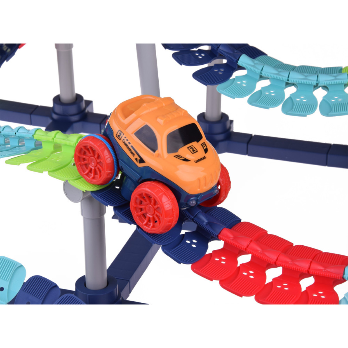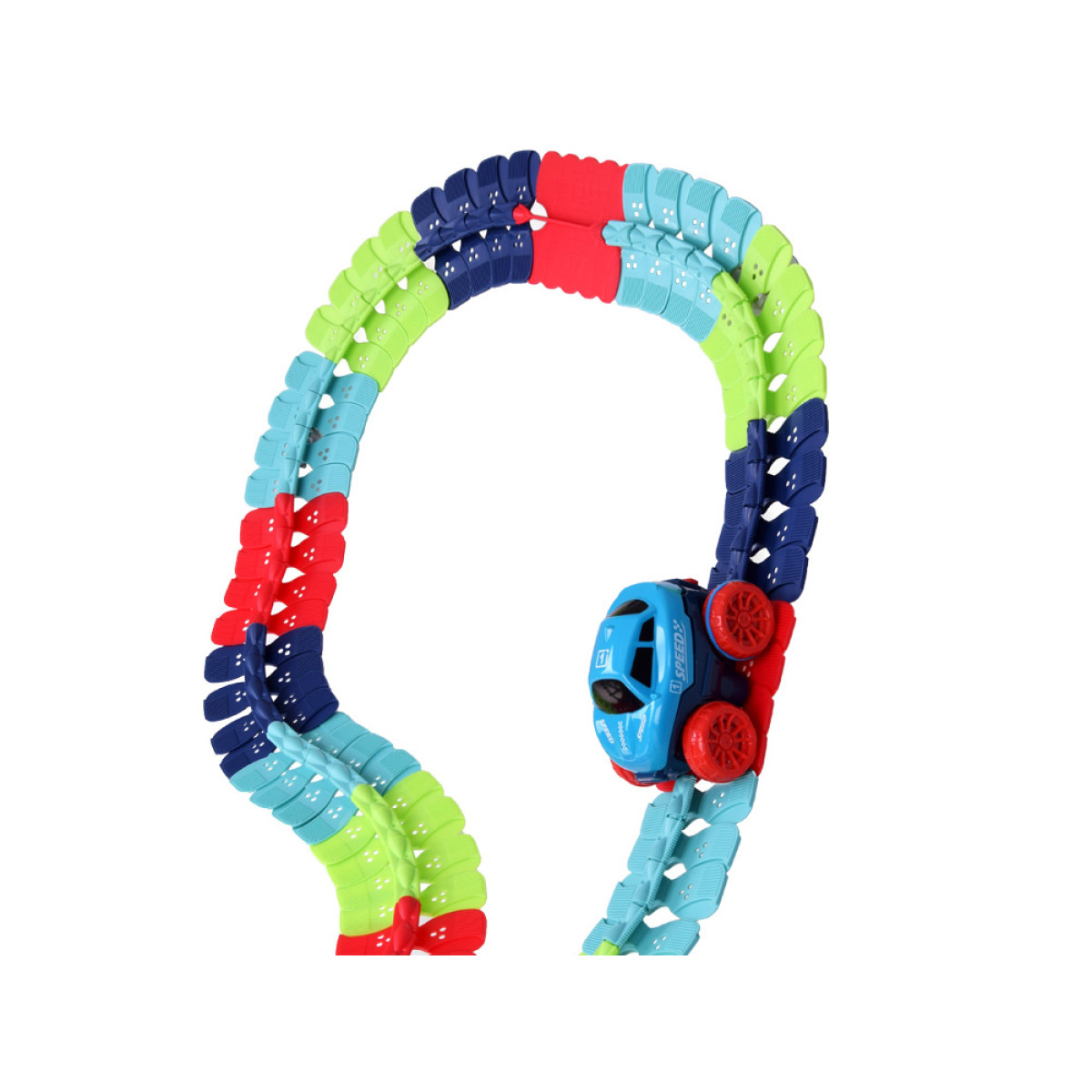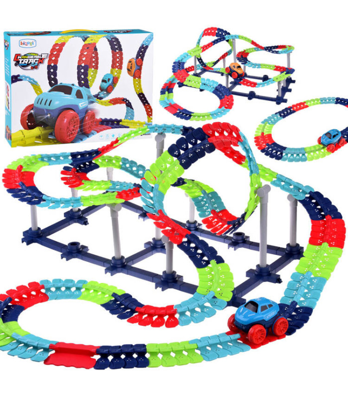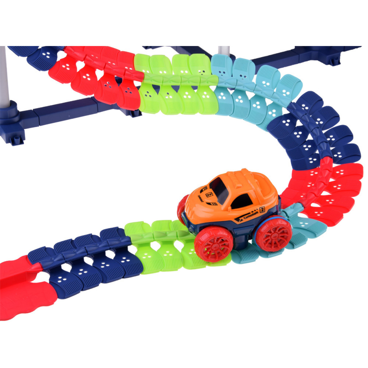 Spalvingas automobilis savarankiškai įveiks trasą. Pakanka įdėti akumuliatorių ir jį įjungti paspaudus mygtuką, esantį automobilio gale, ir jis skubės pirmyn paruošta trasa. Automobilis pagamintas iš aukštos kokybės plastiko ir turi 2 kėbulo spalvų pasirinkimą. Galiniai ratai papildomai turi gumines juostas, gerinančias sukibimą. Papildoma pramoga yra švytintys automobilio žibintai.