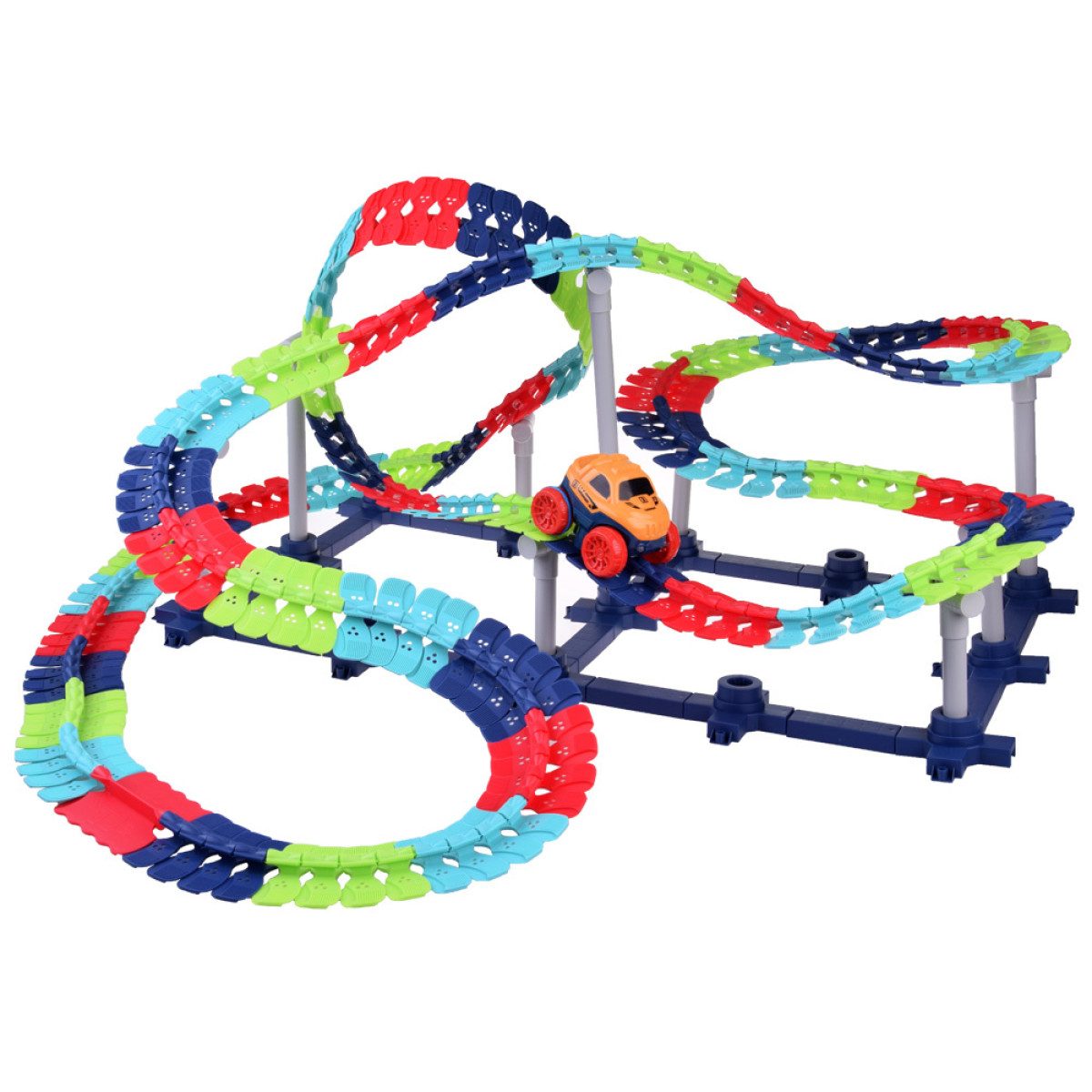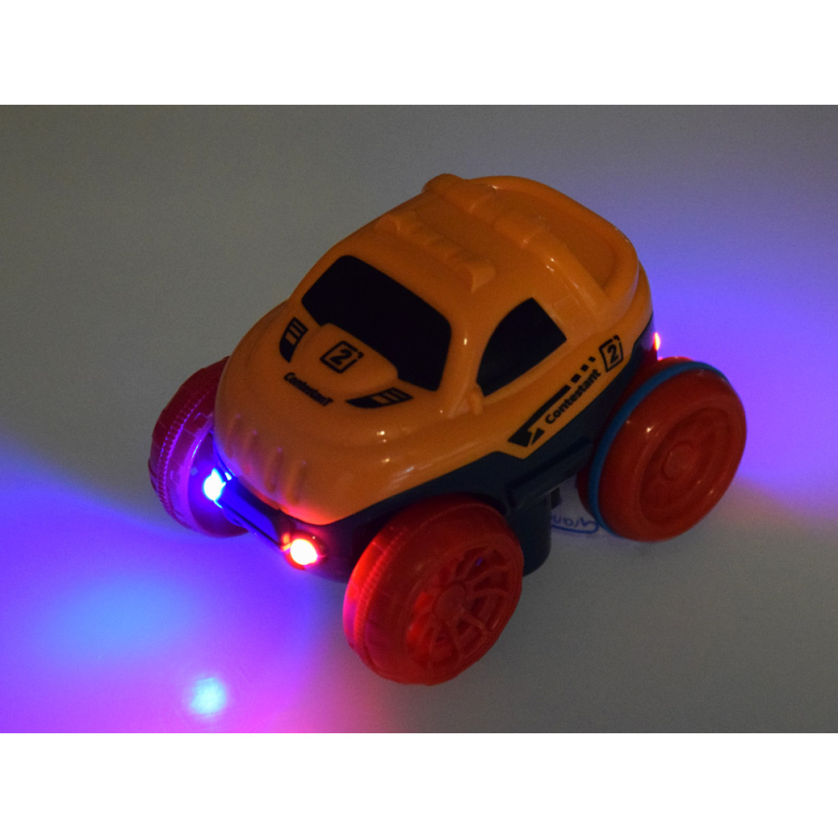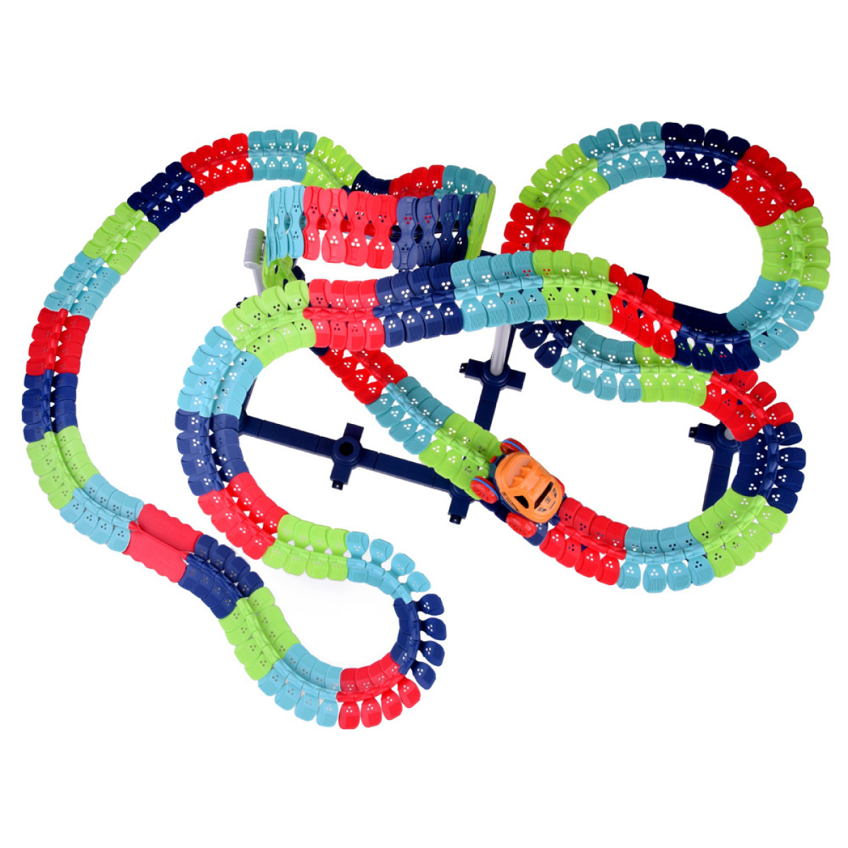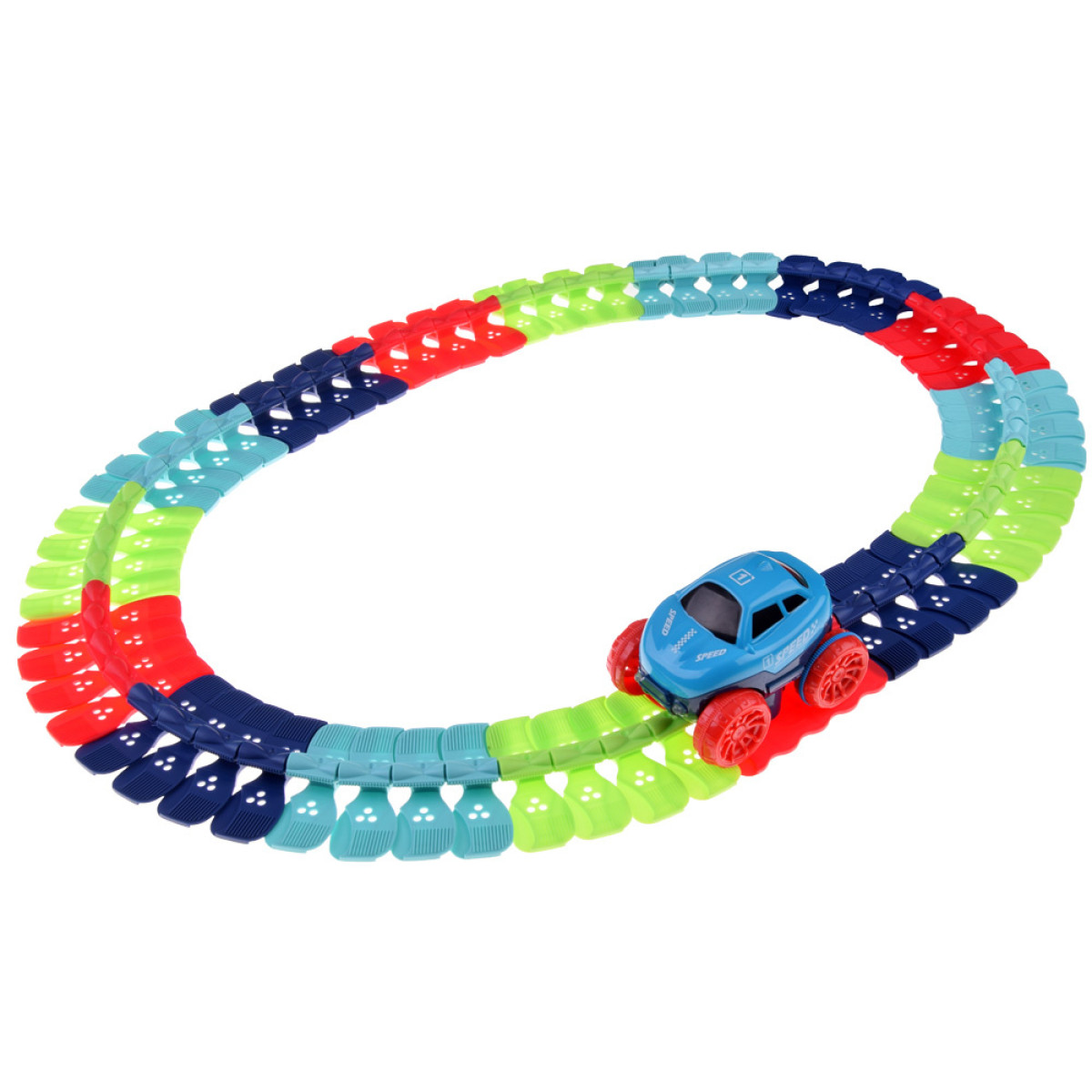 Spalvingas automobilis savarankiškai įveiks trasą. Pakanka įdėti akumuliatorių ir jį įjungti paspaudus mygtuką, esantį automobilio gale, ir jis skubės pirmyn paruošta trasa. Automobilis pagamintas iš aukštos kokybės plastiko ir turi 2 kėbulo spalvų pasirinkimą. Galiniai ratai papildomai turi gumines juostas, gerinančias sukibimą. Papildoma pramoga yra švytintys automobilio žibintai.