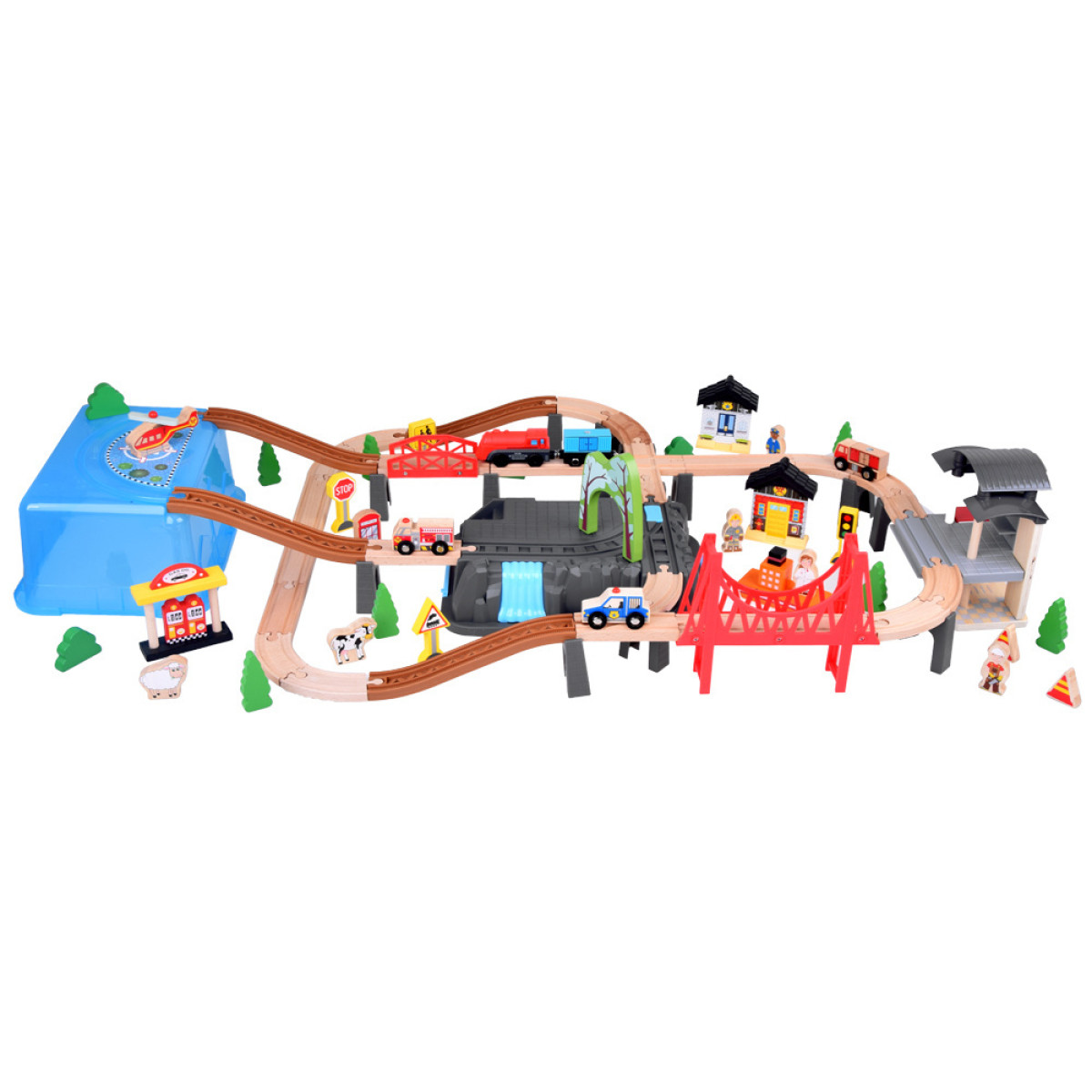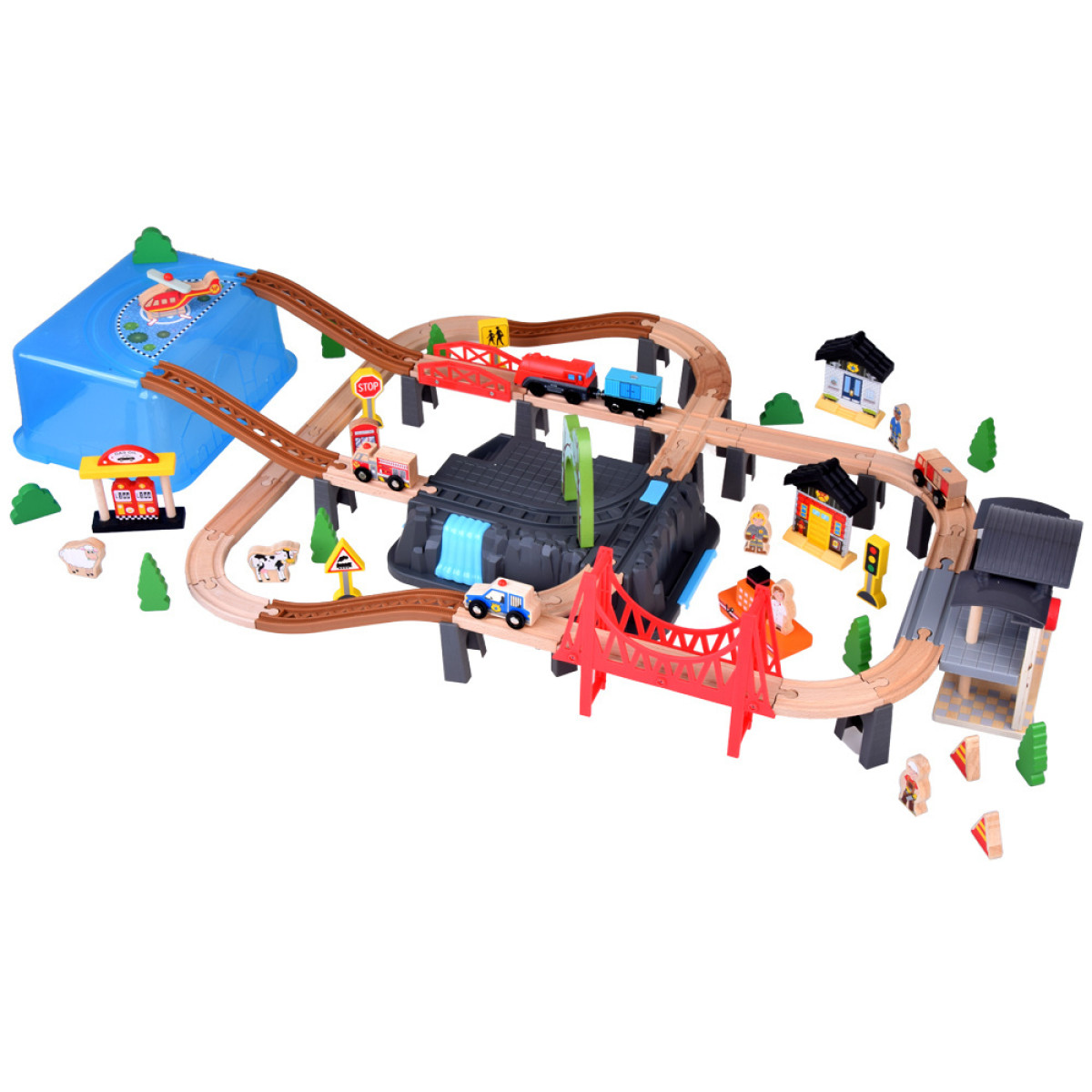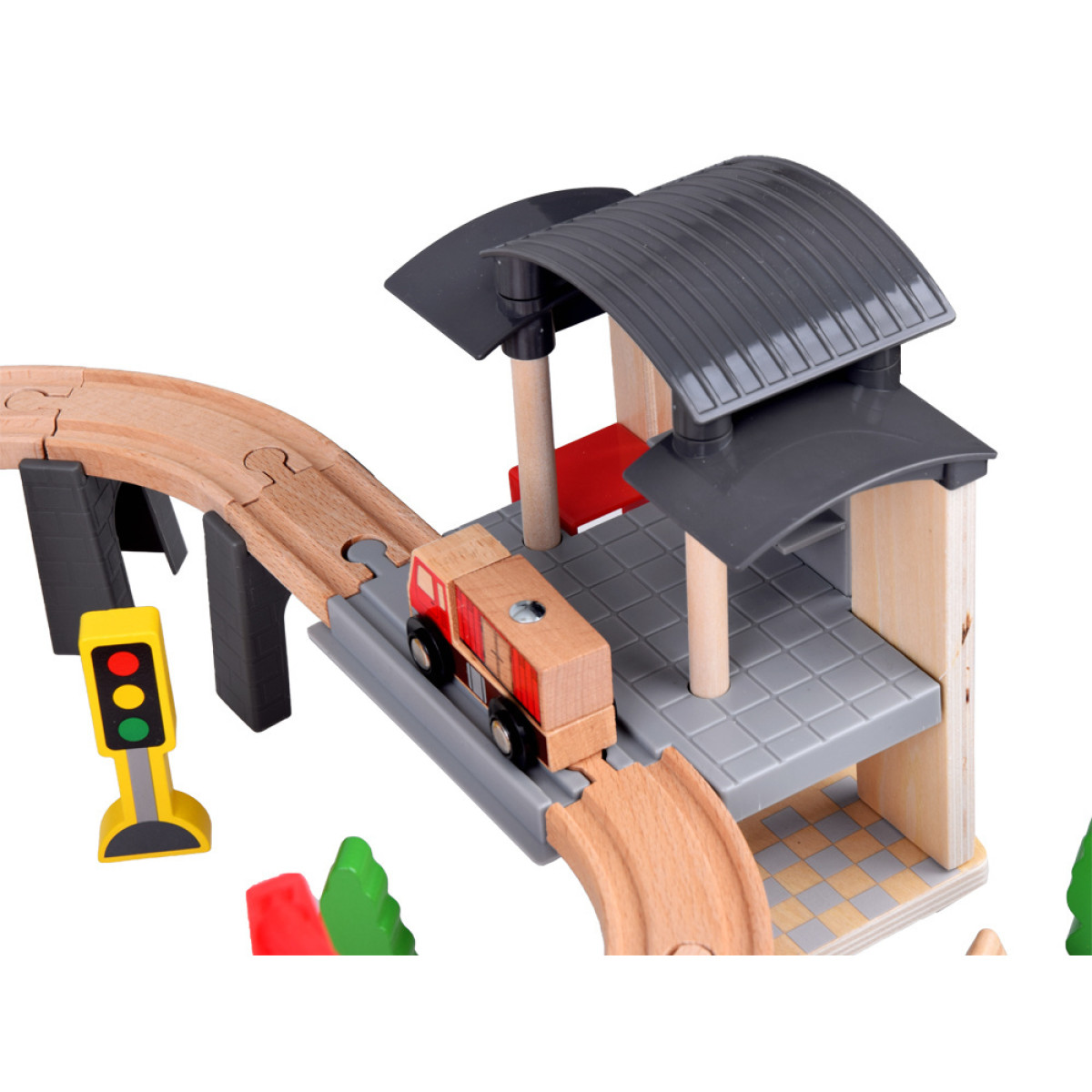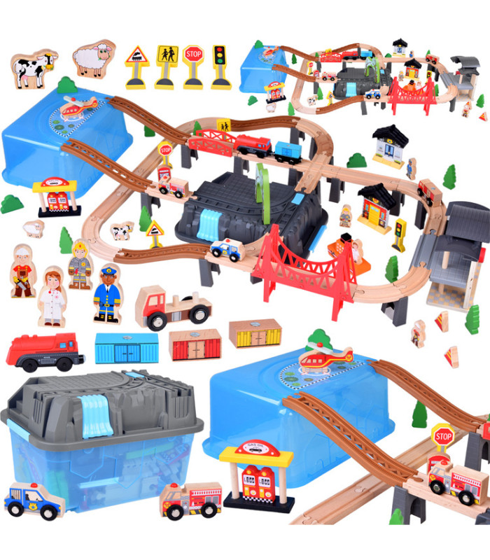 Medinis traukinio rinkinys su blokeliais yra pilnas žaidimo ir kūrybingumo pasaulis! Rinkinys turi 100 elementų, įskaitant tiltus, tunelius, geležinkelio stotis, transporto priemones bei žmonių ir gyvūnų figūrėles. Visa tai leidžia kurti savo miestą su geležinkeliu, kuris pasižymi įspūdingomis detalėmis, kaip pavyzdžiui, oro uostas su sraigtasparniu. Visi elementai pagaminti iš medžio, todėl rinkinys yra patvarus ir saugus vaikams.