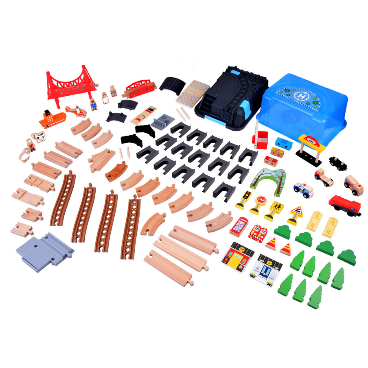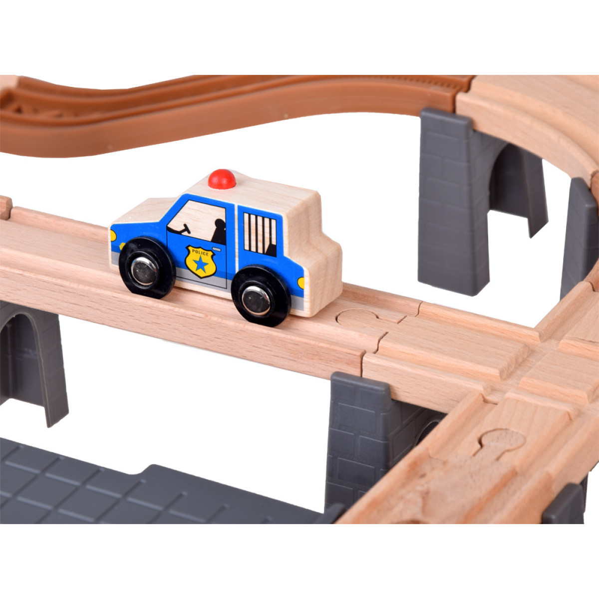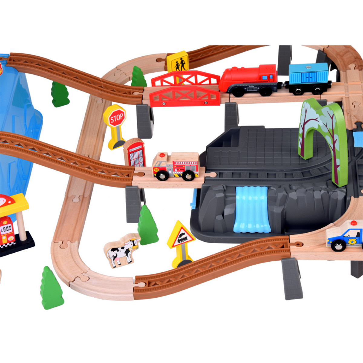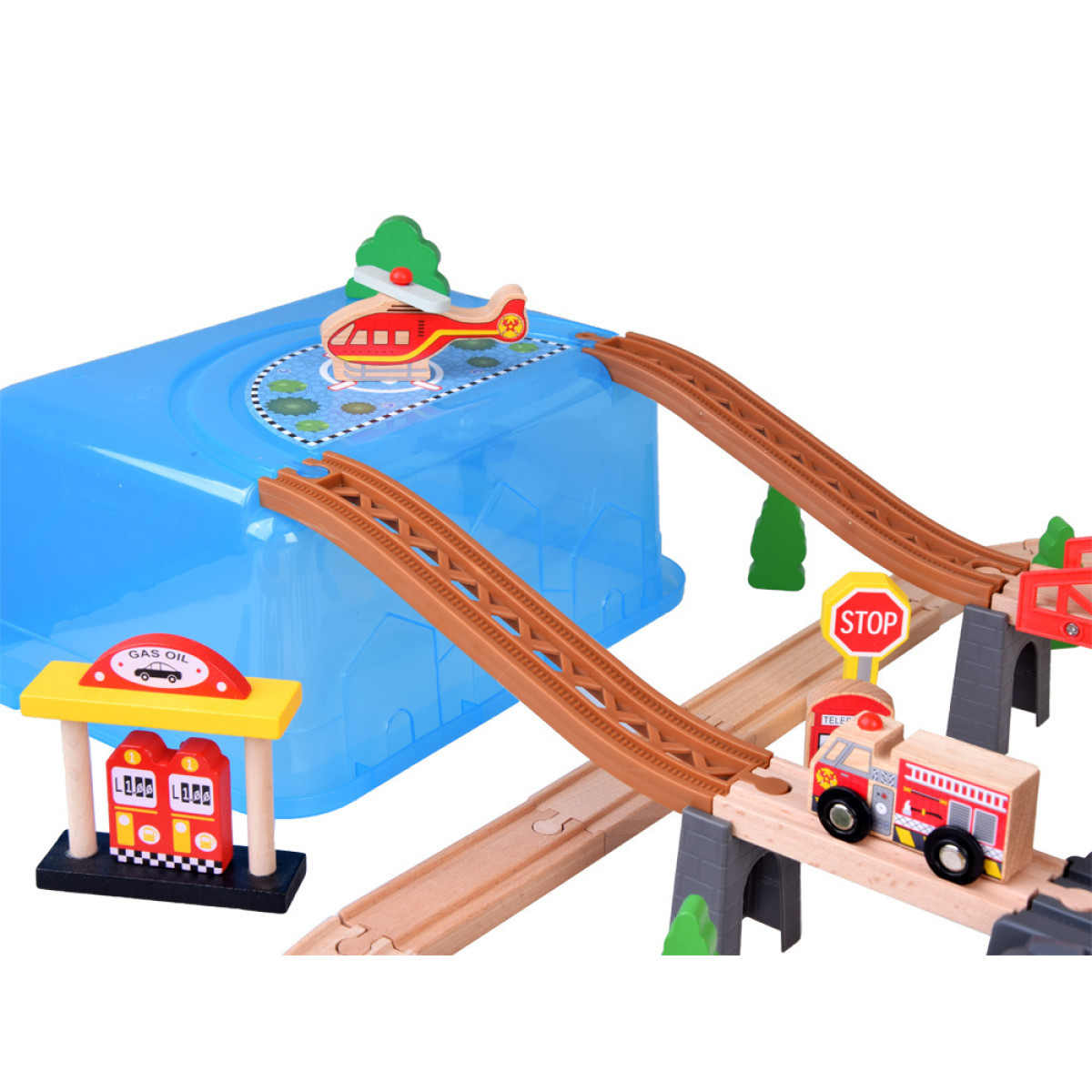 Medinis traukinio rinkinys su blokeliais yra pilnas žaidimo ir kūrybingumo pasaulis! Rinkinys turi 100 elementų, įskaitant tiltus, tunelius, geležinkelio stotis, transporto priemones bei žmonių ir gyvūnų figūrėles. Visa tai leidžia kurti savo miestą su geležinkeliu, kuris pasižymi įspūdingomis detalėmis, kaip pavyzdžiui, oro uostas su sraigtasparniu. Visi elementai pagaminti iš medžio, todėl rinkinys yra patvarus ir saugus vaikams.