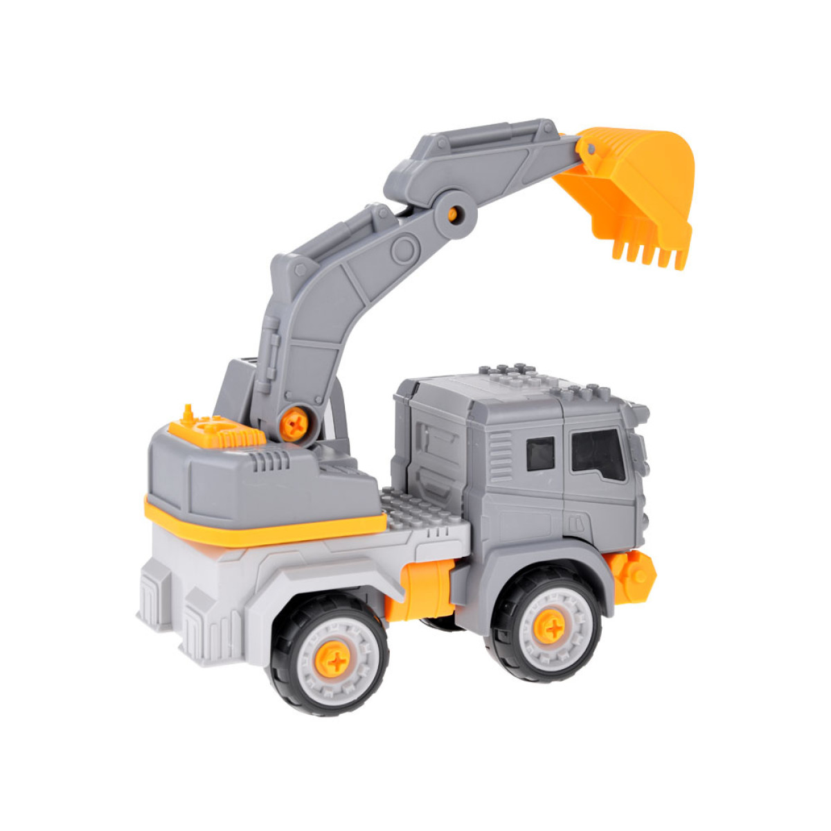 - Automobilis turi nuimamus elementus: ratus, variklio dangtį, kabiną su ekskavatoriumi ir ranką su kastuvu.