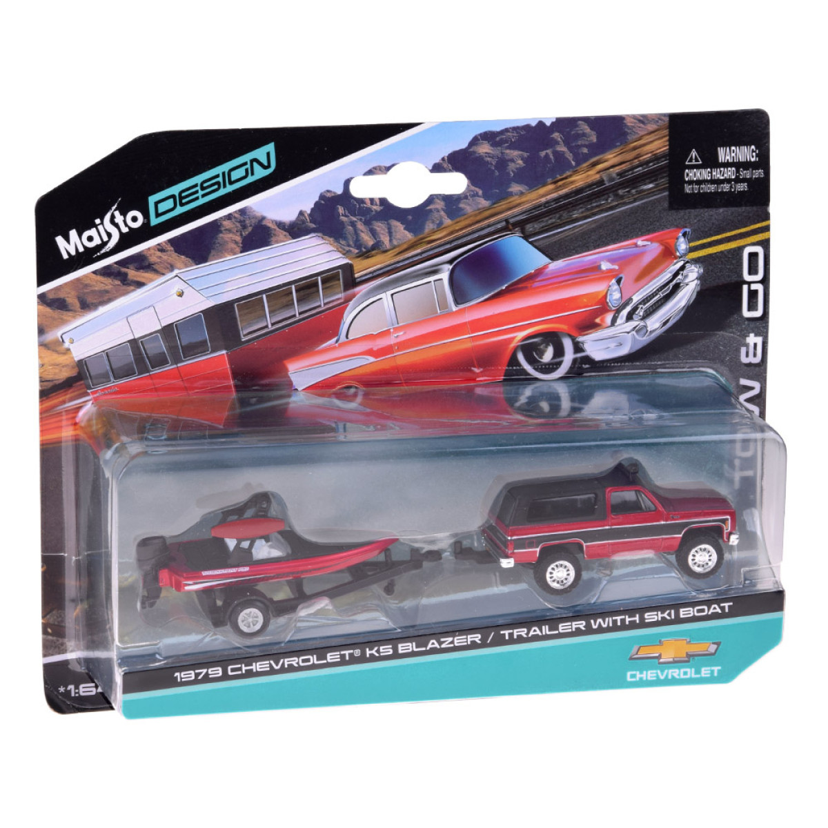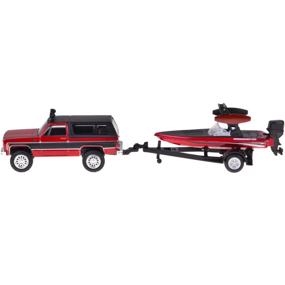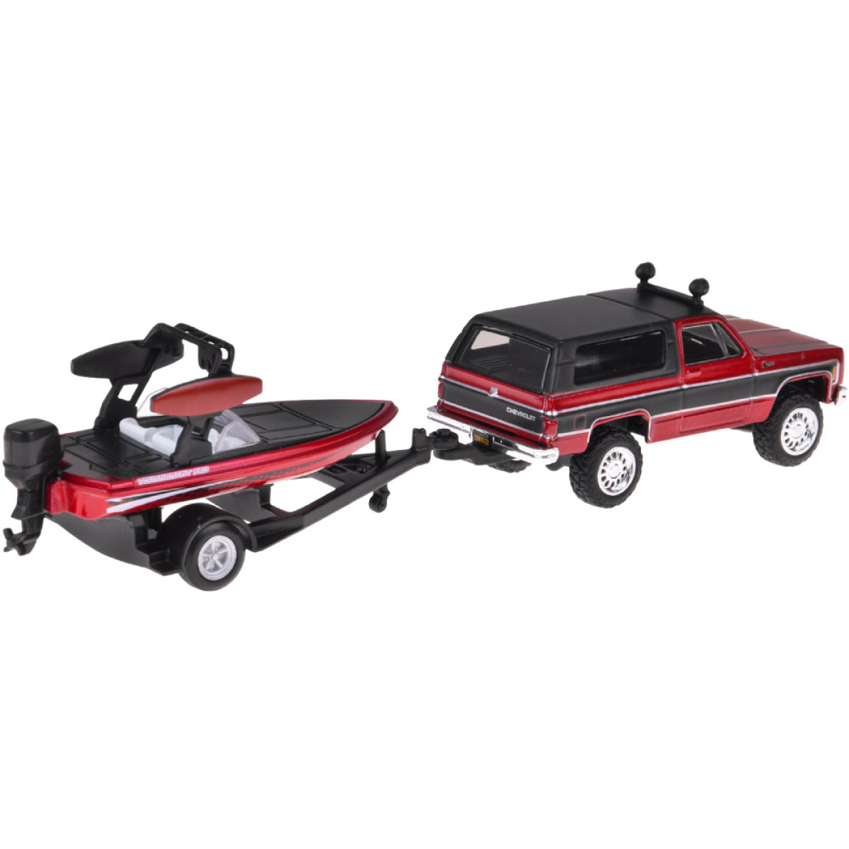 Raudona spalva pabrėžia modelio galingą, bekelei pritaikytą charakterį ir nesenstantį stilių. Chevrolet K5 Blazer turi kablį, leidžiantį priekabą su laivu pritvirtinti. Kablį galima nuimti naudojant varžtą, o priekaba atjungti be kablio atsukimo. Laivas puikiai atrodo ant priekabos, suteikdamas rinkiniui realizmo ir puikiai tinka tiek kolekcininko lentynai, tiek žaidimui.