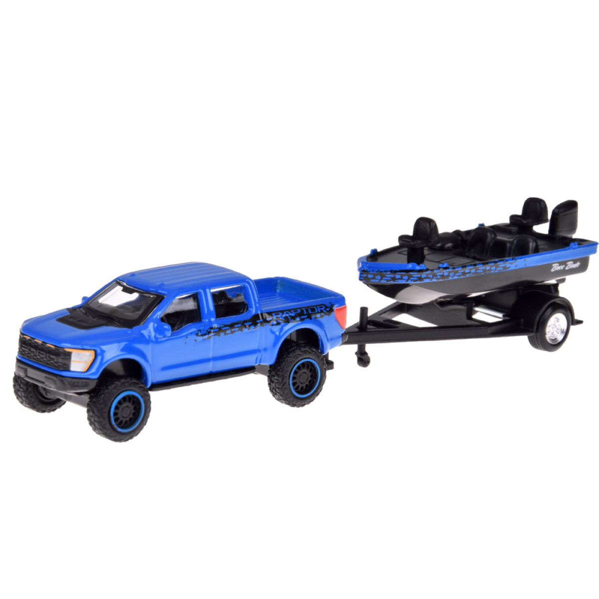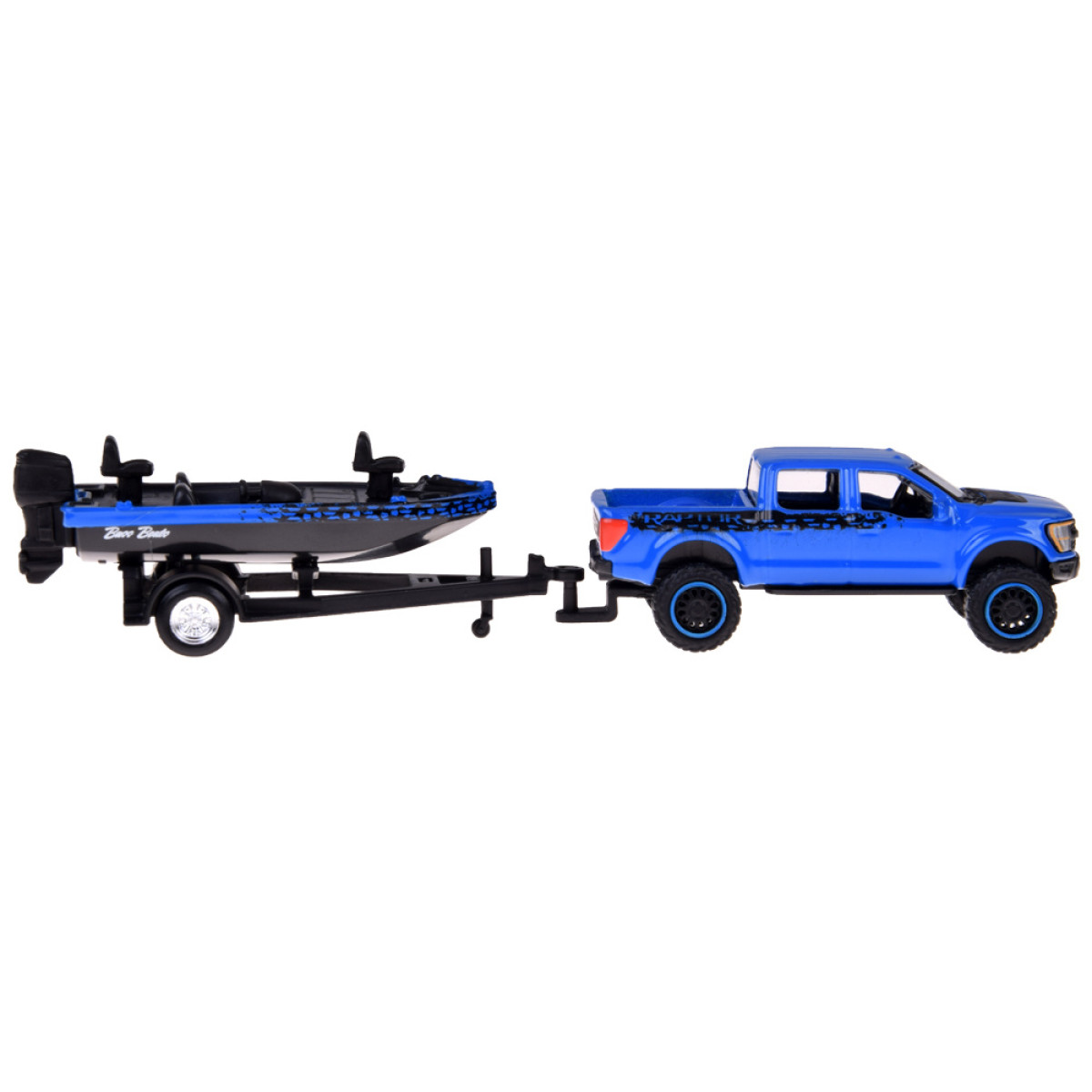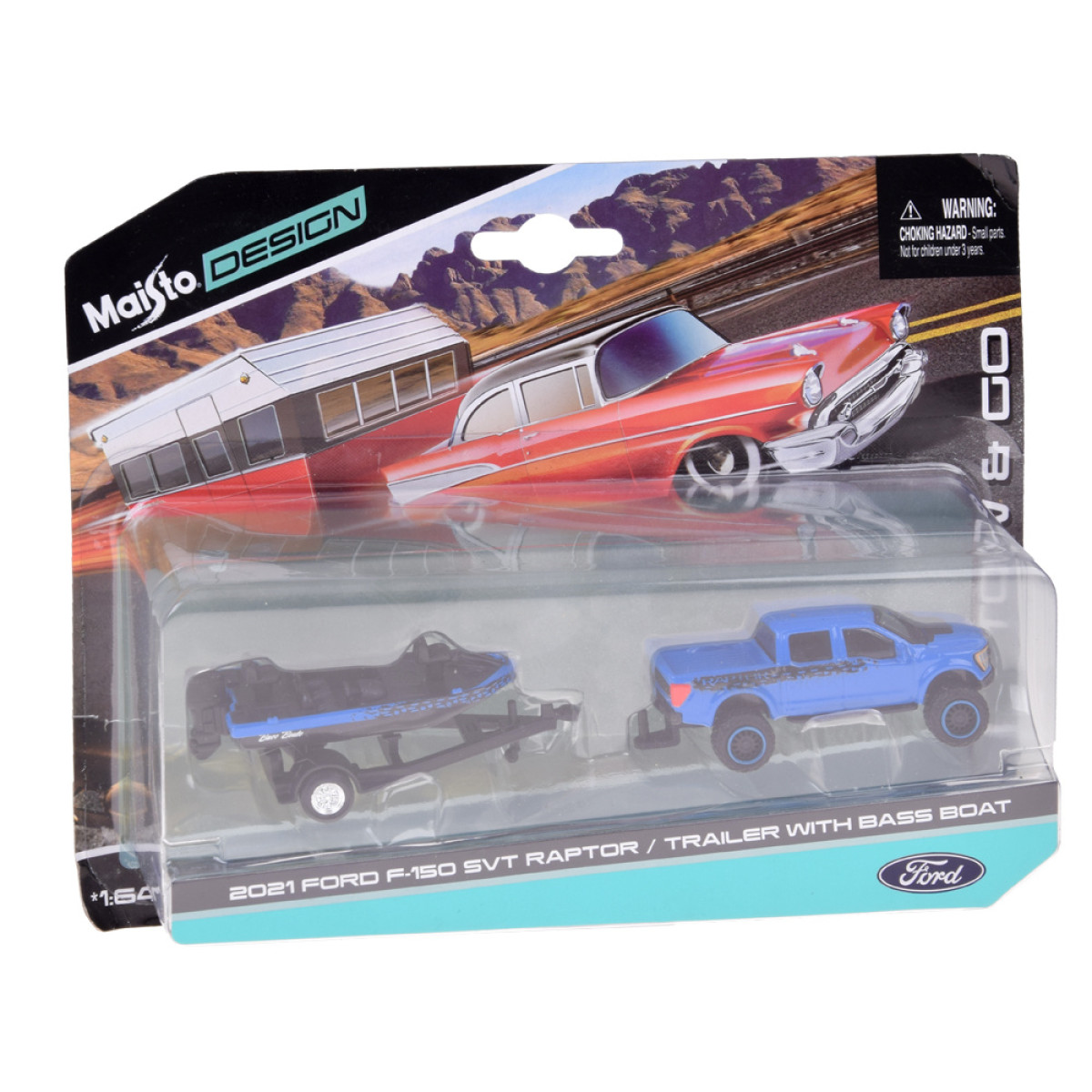 Modelis yra mėlynos ir juodos spalvos, suteikiant sportinį ir klasikinį įspūdį. Ford F-150 SVT Raptor turi kablį, leidžiantį pritvirtinti priekabą su valtimi. Kablį galima nuimti naudojant varžtą, o pati priekaba taip pat atsikabina be kablio atlaisvinimo. Valtis puikiai atrodo pritvirtinta priekaboje, suteikiant rinkiniui realistiškumo ir žavesio tiek kolekcijoje, tiek žaidimo metu.