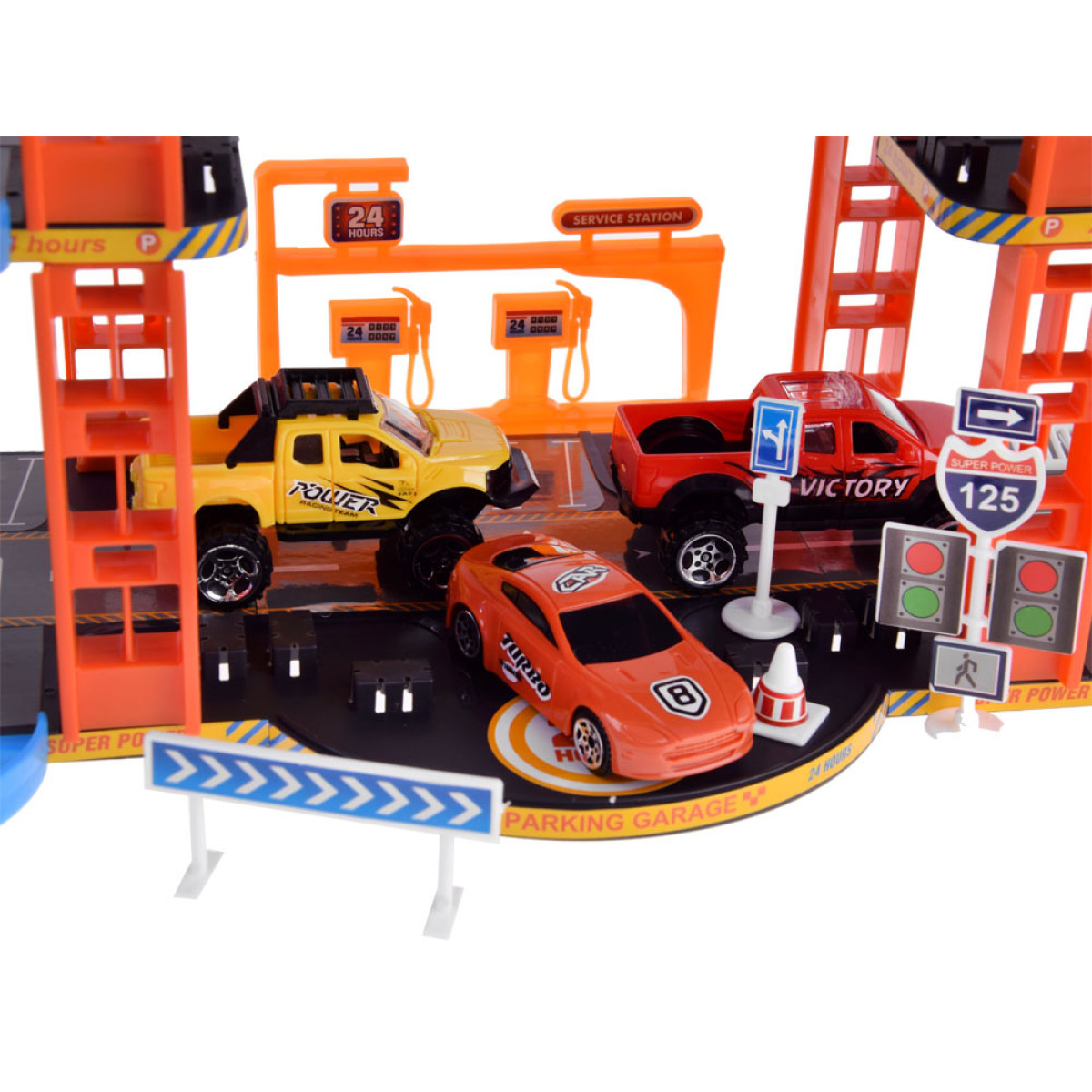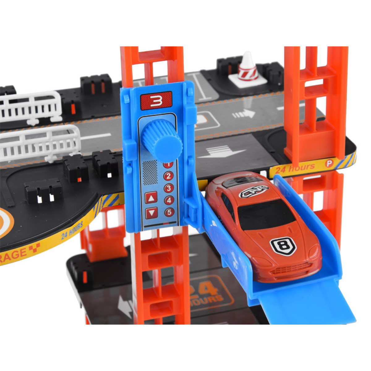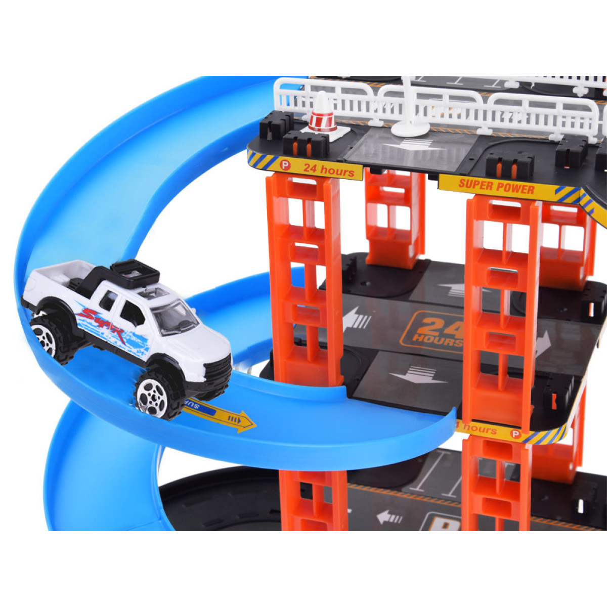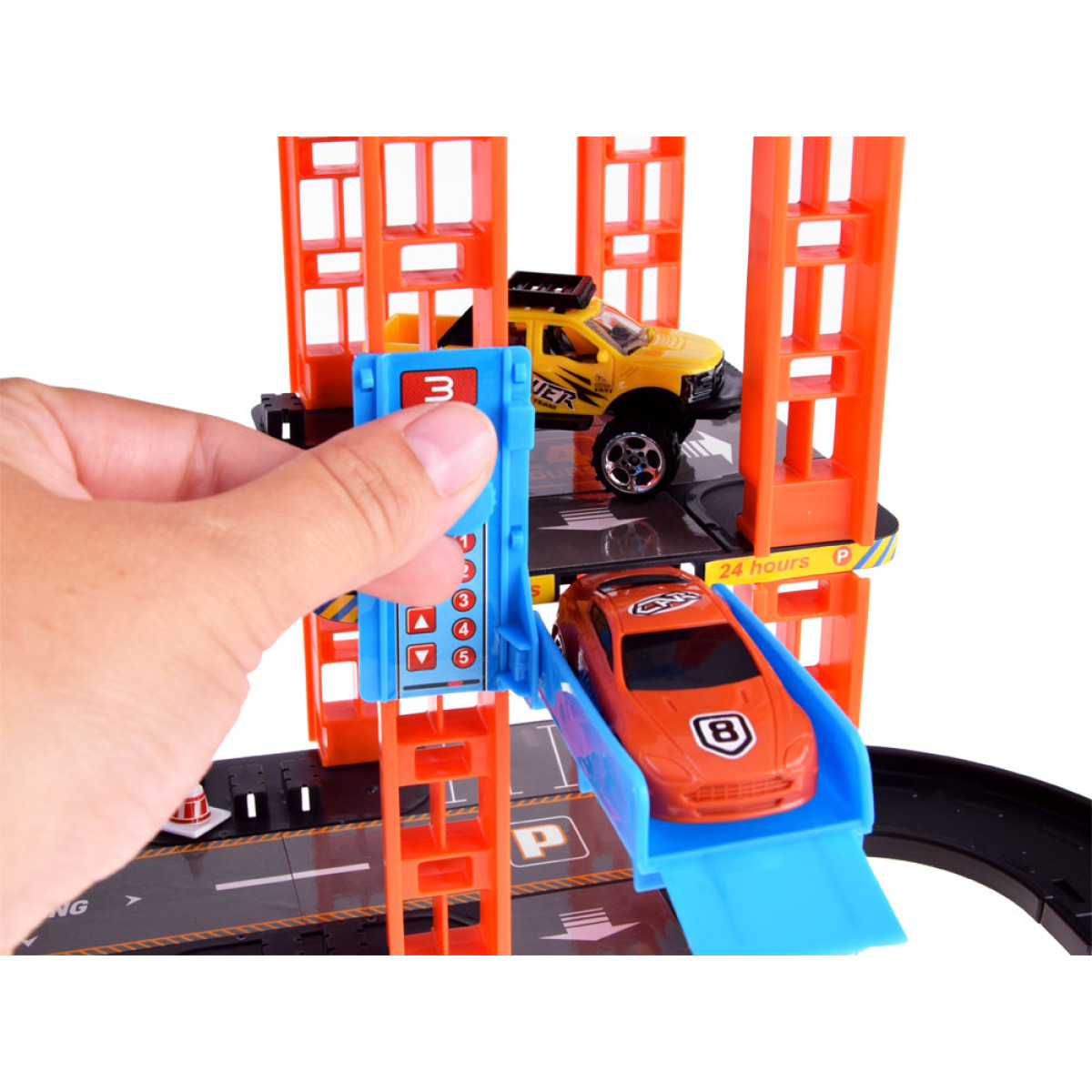 Daugiaaukštis automobilių stovėjimo aikštelė – puikus žaislas kiekvienam vaikui, mėgstančiam žaisti su automobiliais. Šis žaislas turi liftą, kuris leidžia transportuoti automobilius į bet kurį stovėjimo aikštelės aukštą. Rinkinys su nusileidimo trasomis, posūkiais, kelio ženklais, autobusų stotele ir degaline suteiks kūrybingą pramogą kiekvienam mažam vairuotojui. Žaislas pagamintas iš plastiko, su spalvotais lipdukais, kuriuos vaikas gali pats užklijuoti ant stovėjimo aikštelės elementų.