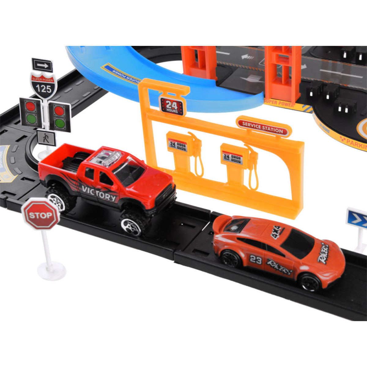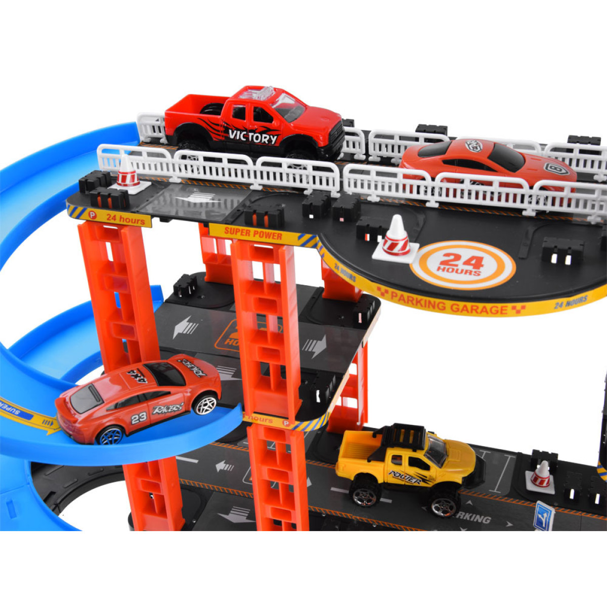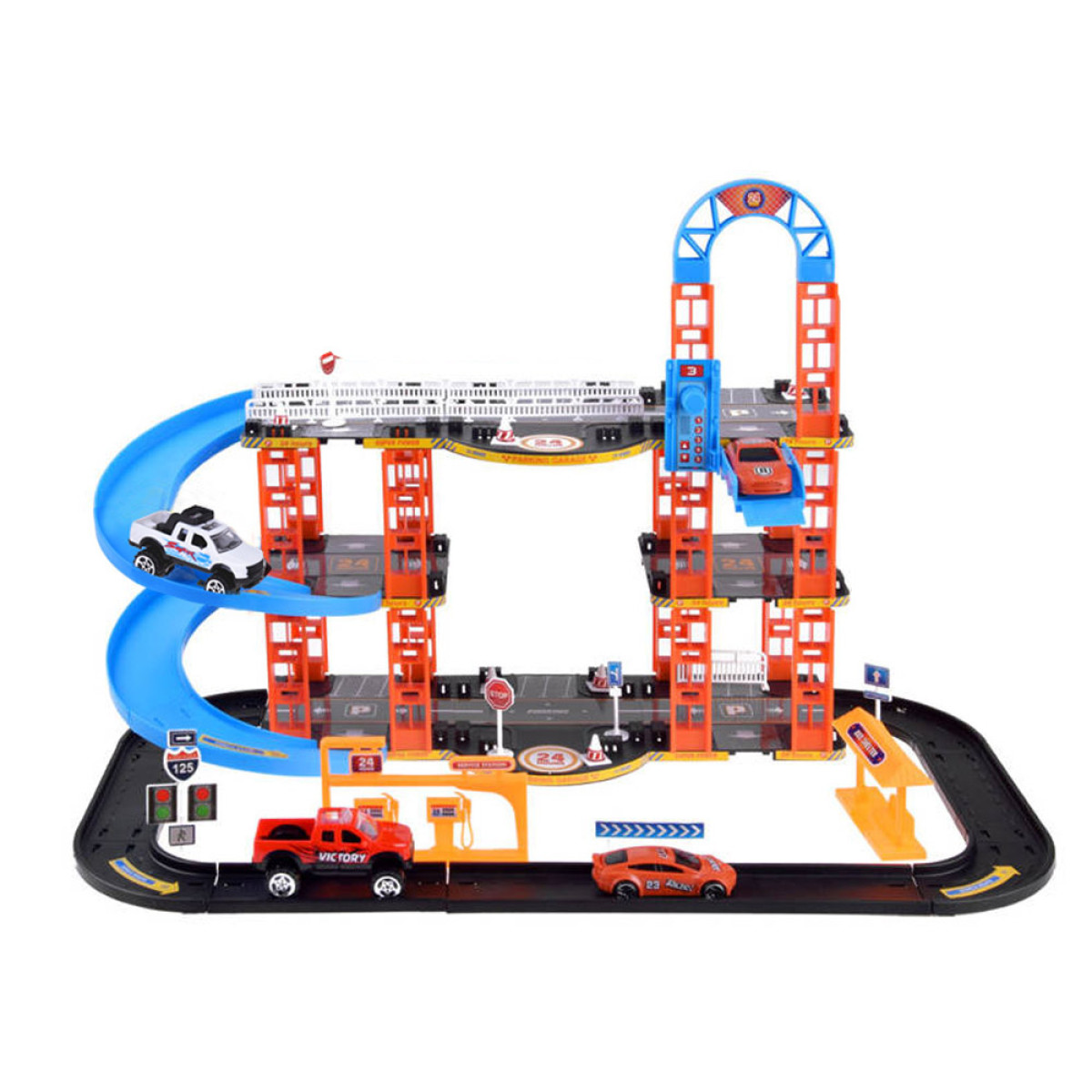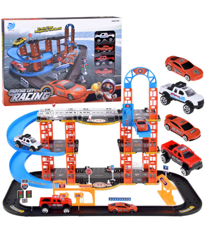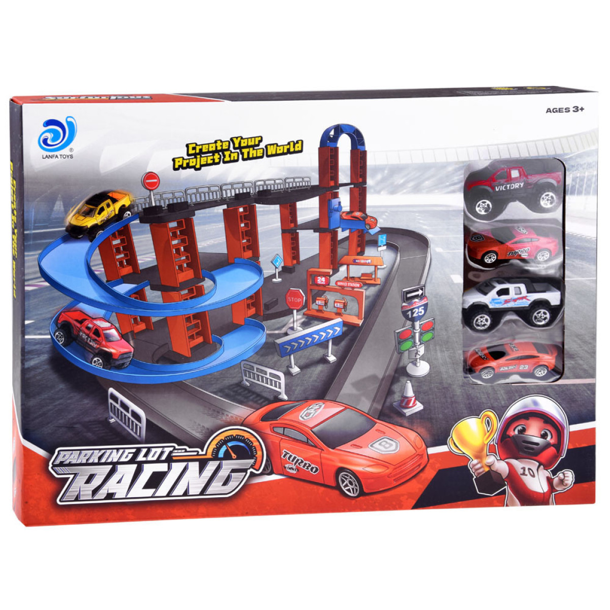 Daugiaaukštis automobilių stovėjimo aikštelė – puikus žaislas kiekvienam vaikui, mėgstančiam žaisti su automobiliais. Šis žaislas turi liftą, kuris leidžia transportuoti automobilius į bet kurį stovėjimo aikštelės aukštą. Rinkinys su nusileidimo trasomis, posūkiais, kelio ženklais, autobusų stotele ir degaline suteiks kūrybingą pramogą kiekvienam mažam vairuotojui. Žaislas pagamintas iš plastiko, su spalvotais lipdukais, kuriuos vaikas gali pats užklijuoti ant stovėjimo aikštelės elementų.