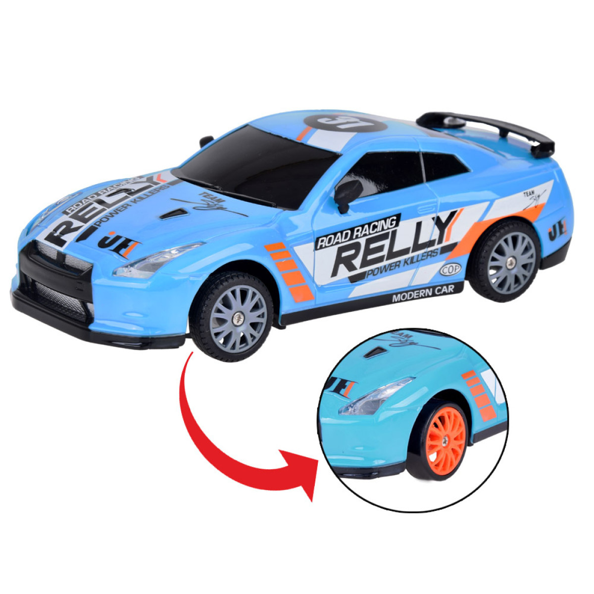 Automobilis valdomas 2,4 GHz nuotolinio valdymo pultu su įmontuota antena, leidžiančia visiškai kontroliuoti transporto priemonę: važiuoti į priekį, atgal, pasukti į dešinę ir kairę. Rinkinyje yra papildomi atsarginiai ratai ir kūgeliai, kurie leidžia kurti nuostabius lenktynių trasas lenktyniavimui ar driftui.