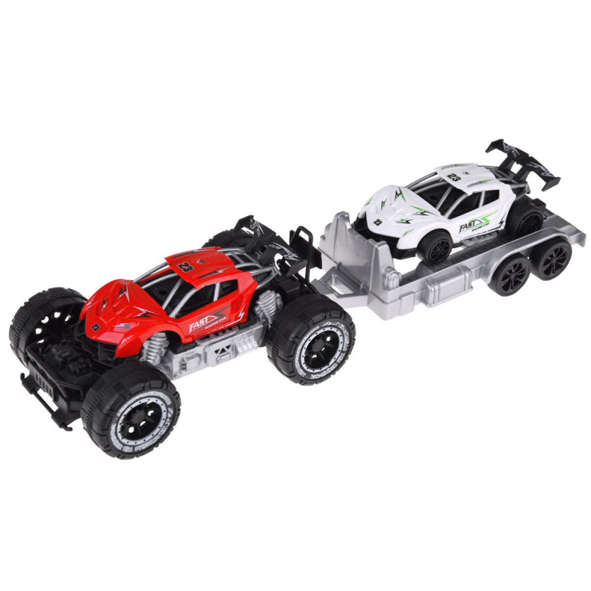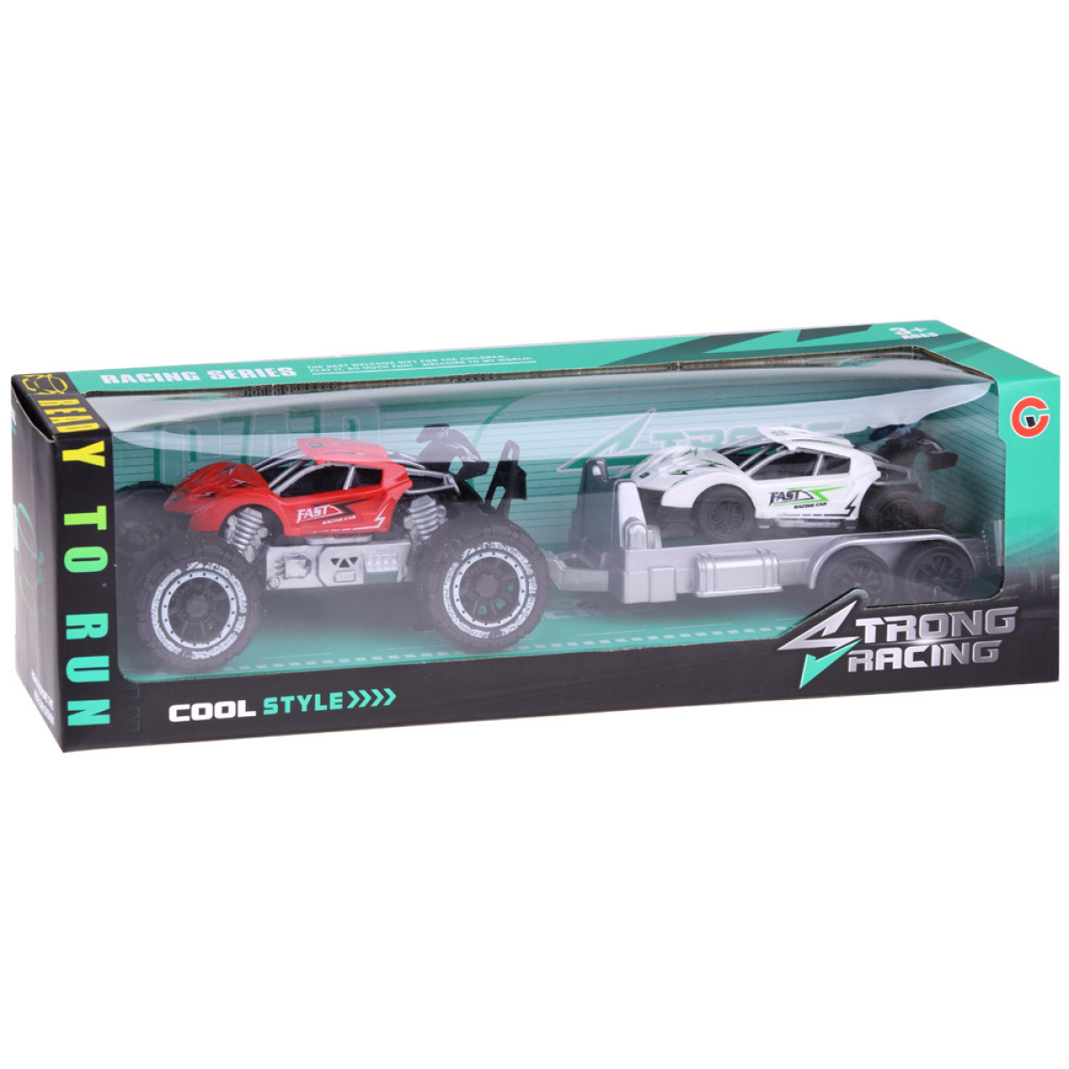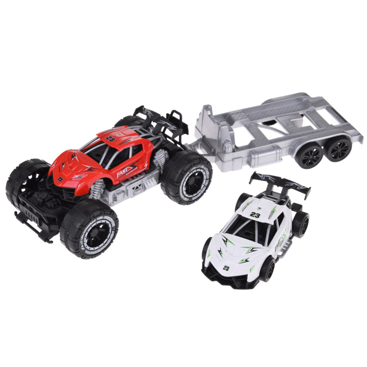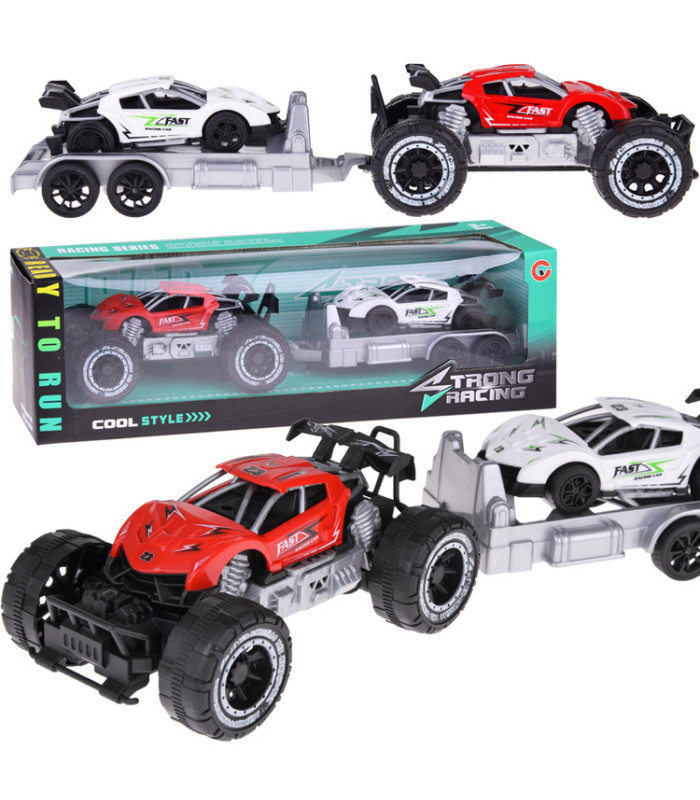 Visureigis su priekaba ir sportiniu automobiliu yra transporto priemonė, kuriai jokie kliūtys nebaisios. Automobiliai ir priekaba pagaminti iš plastiko. Priekabos ir sportinio automobilio ratai yra guminiai, o visureigio – plastikiniai. Visureigis juda į priekį įsibėgėjus, o sportinis automobilis, naudojant pull-back mechanizmą - trauk ir paleisk. Priekaba atlieka tralo funkciją, ant kurios transportuojamas sportinis automobilis, puikiai tinkantis ralio išvykoms. Rinkinys automobilių yra mažo kolekcionieriaus ir automobilių gerbėjo džiaugsmas. Įvairiapusiškumas padeda lavinti vaiko vaizduotę ir rankų įgūdžius.