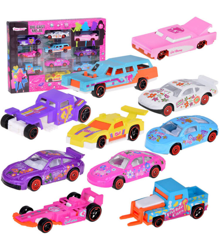 Automobilių Rinkinys 10 metalinių žaislinių automobilių mergaitiškomis spalvomis ir originalia grafika