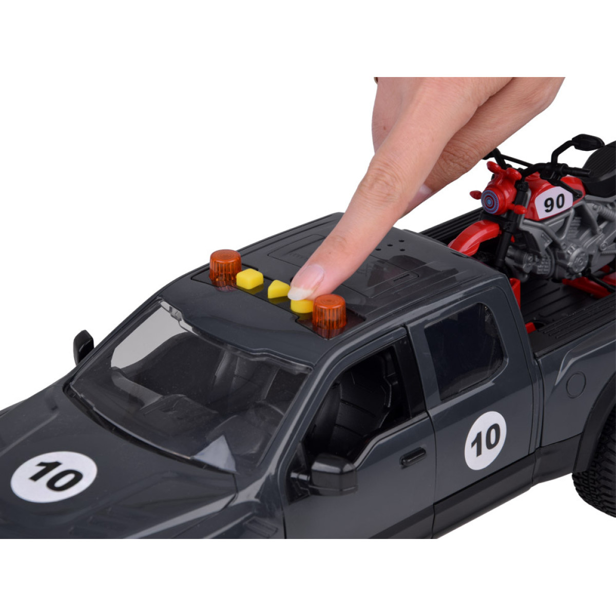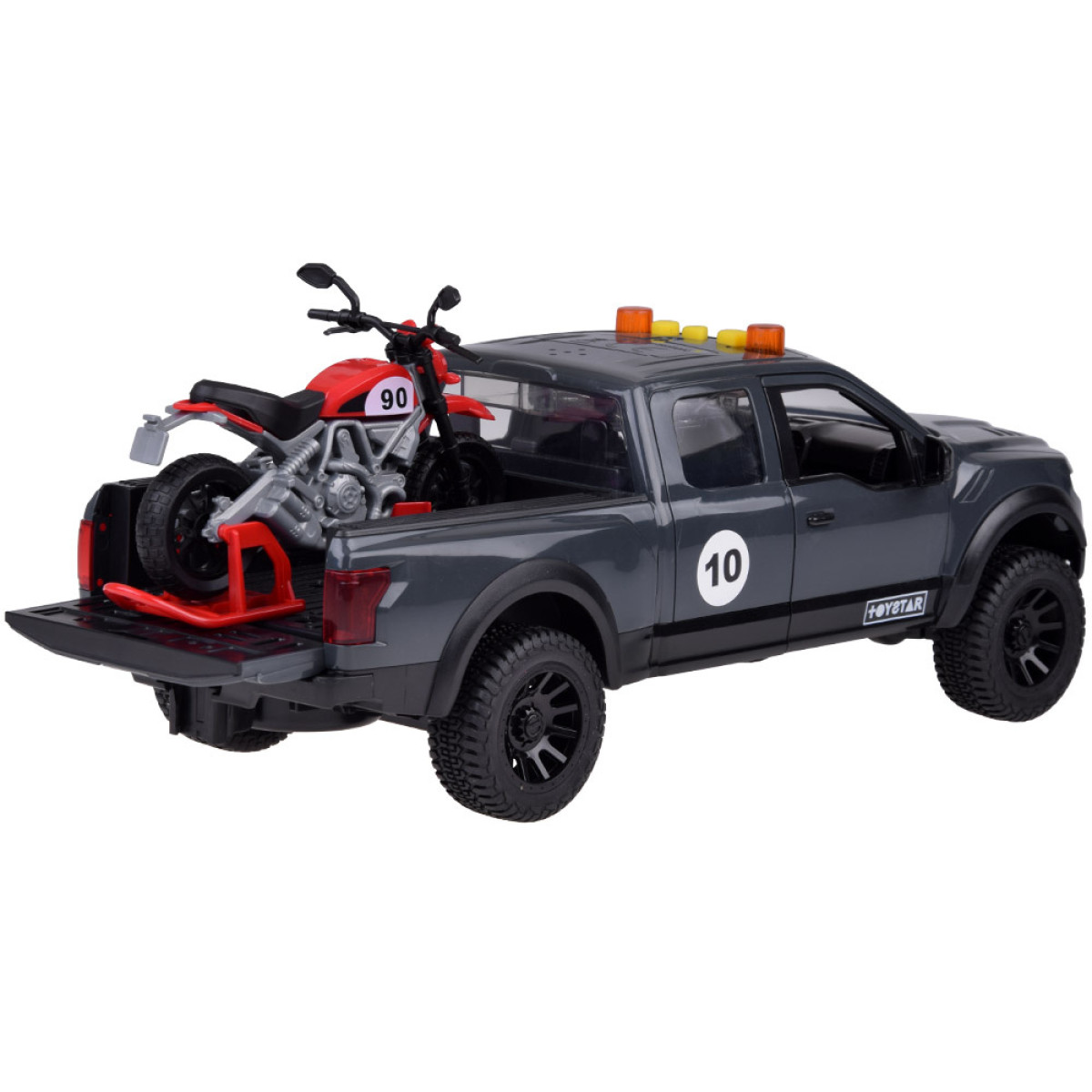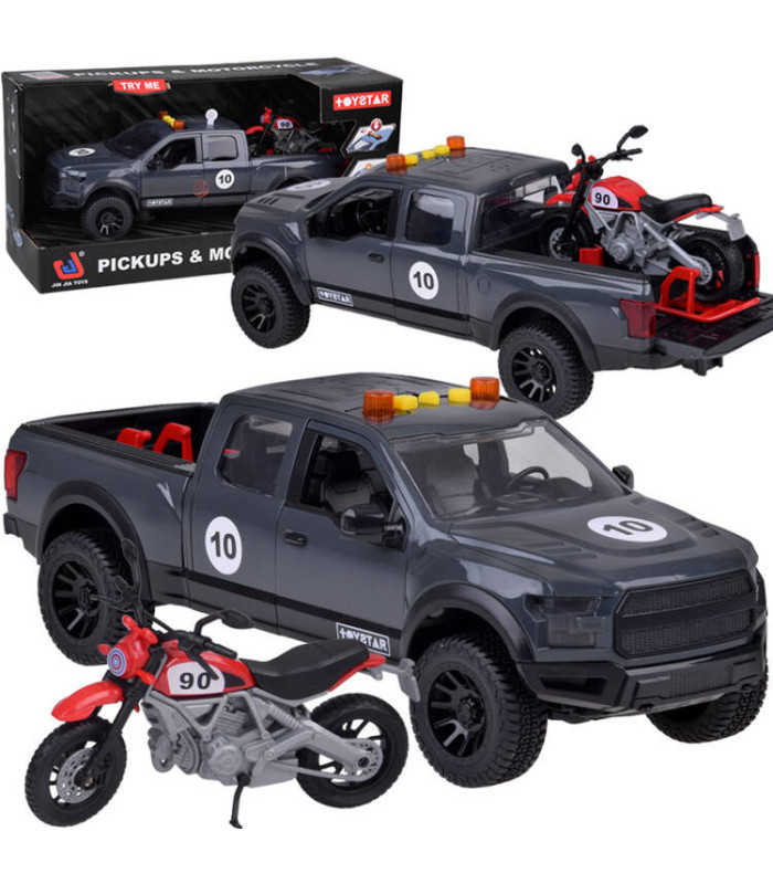 Šis žaislas automobilis su motociklu yra puikus pasirinkimas mažiesiems automobilių mėgėjams! Tvirta pikapo konstrukcija užtikrina ilgaamžiškumą, o ant galinio bagažinės esantis motociklas suteikia vaikams galimybę jį lengvai nuimti ir vežioti.