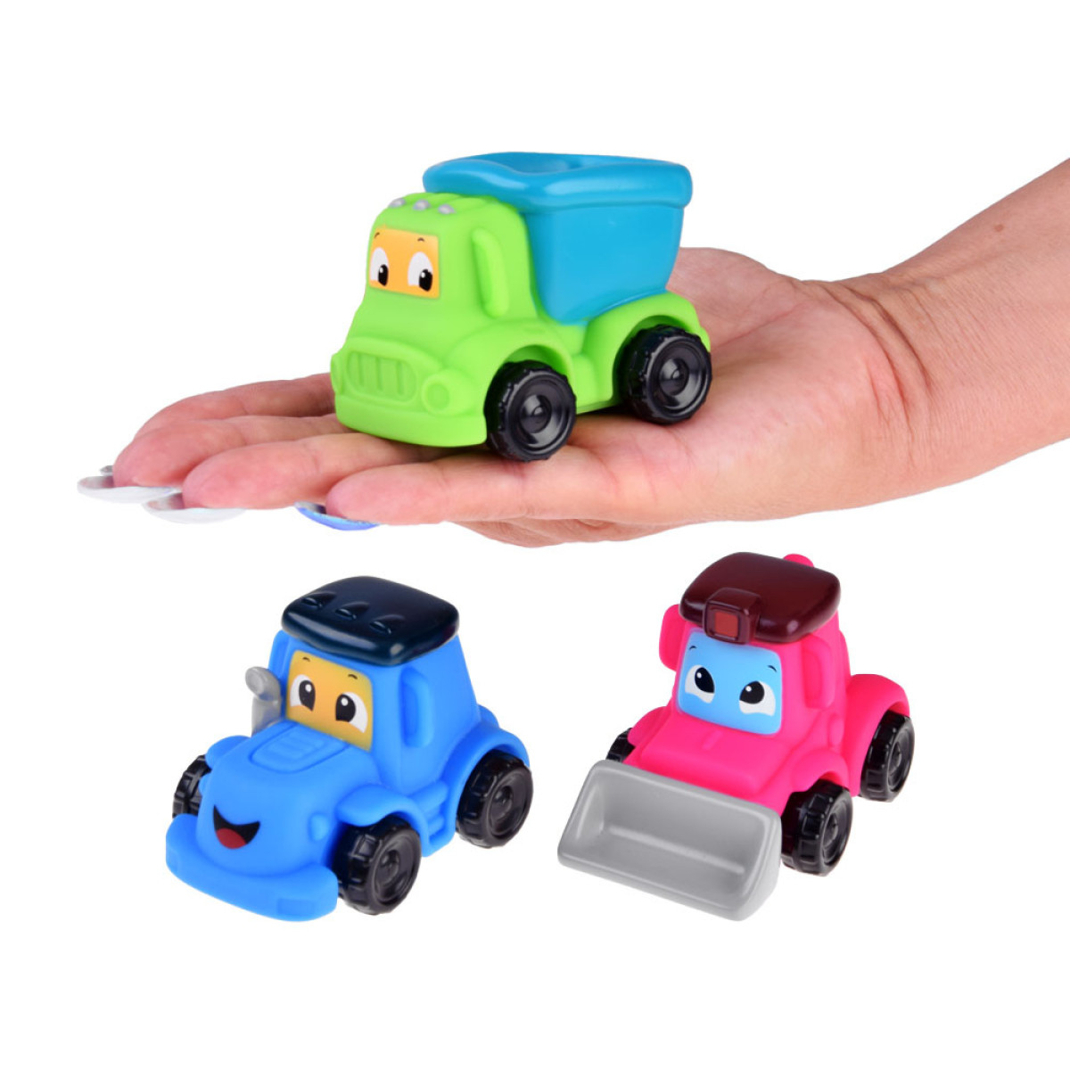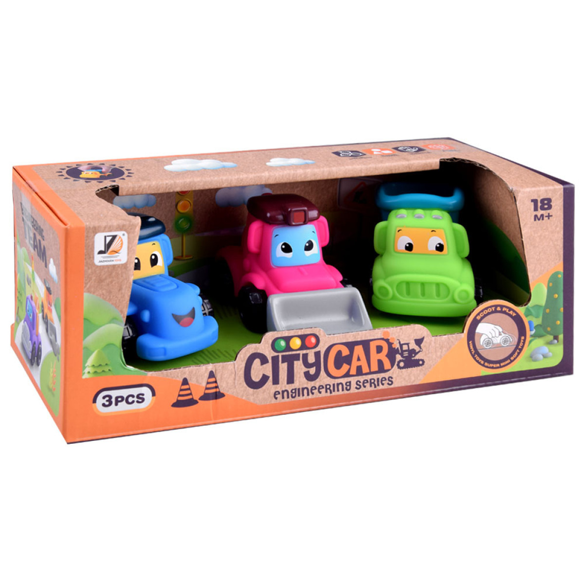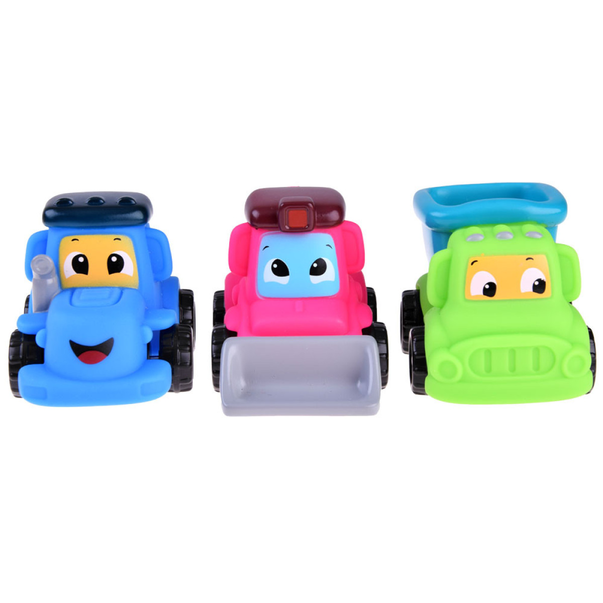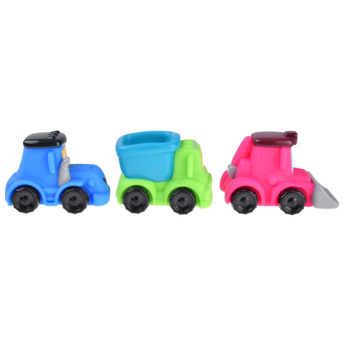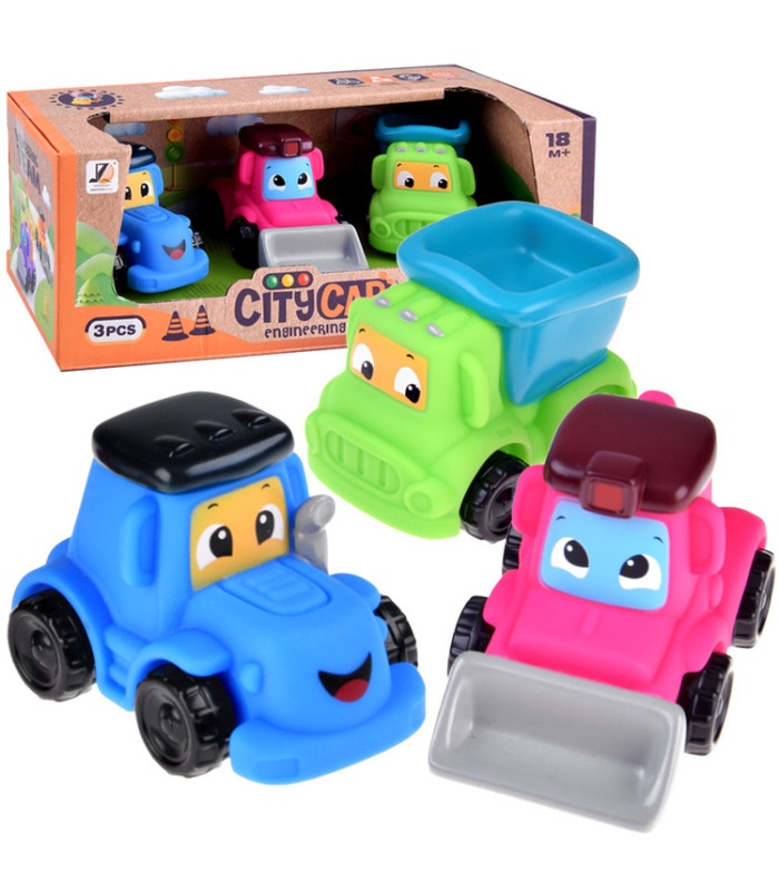 Rinkinys iš 3 statybinių automobiliukų suteiks linksmą ir saugų žaidimą vaikams nuo 18 mėnesių amžiaus. Automobiliukai pagaminti iš gumos ir plastiko, neturi aštrių kampų ar smulkių detalių, todėl juos galima drąsiai dovanoti net ir mažiems vaikams.