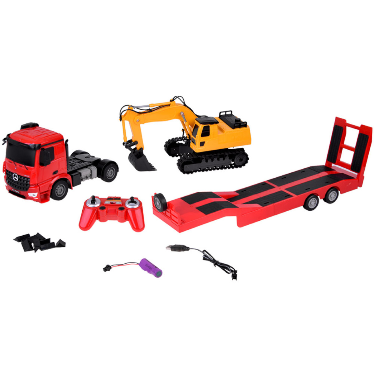 Šis rinkinys yra idealus mažajam vairuotojui ir puiki dovana vaikams, mėgstantiems statybines mašinas. Rinkinį sudaro vilkikas su priekaba ir ekskavatorius. Automobilis turi realistiškus šviesos efektus (priekiniai žibintai mirksi balta šviesa) ir garso efektus (žaislo paleidimas, variklio garsas, judančio automobilio garsas, posūkių signalai, garso signalas).