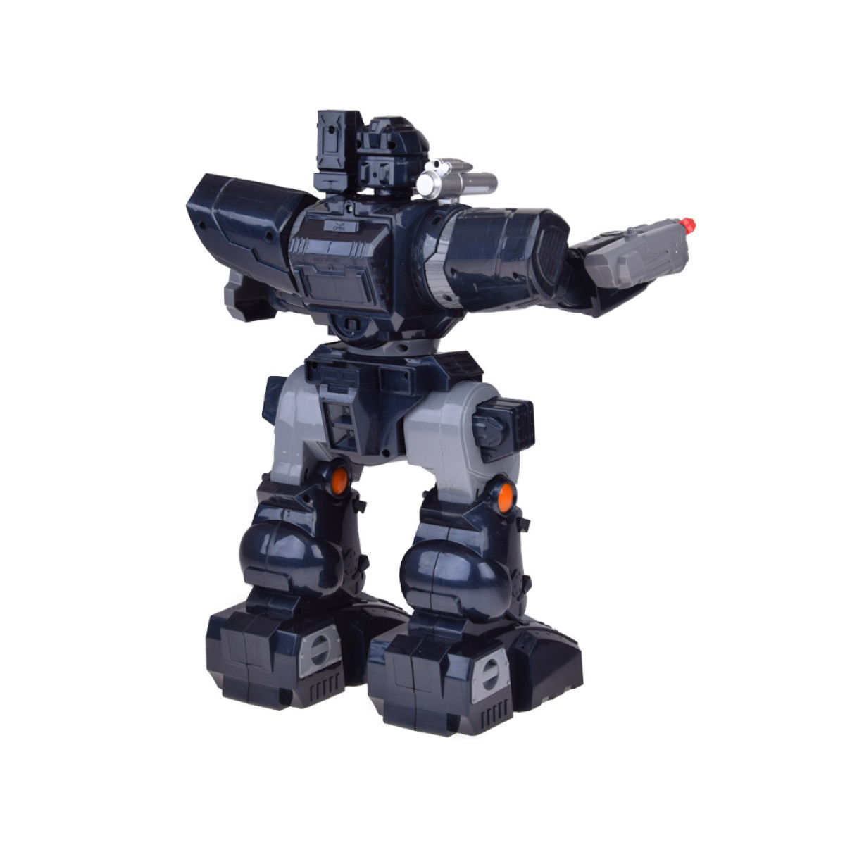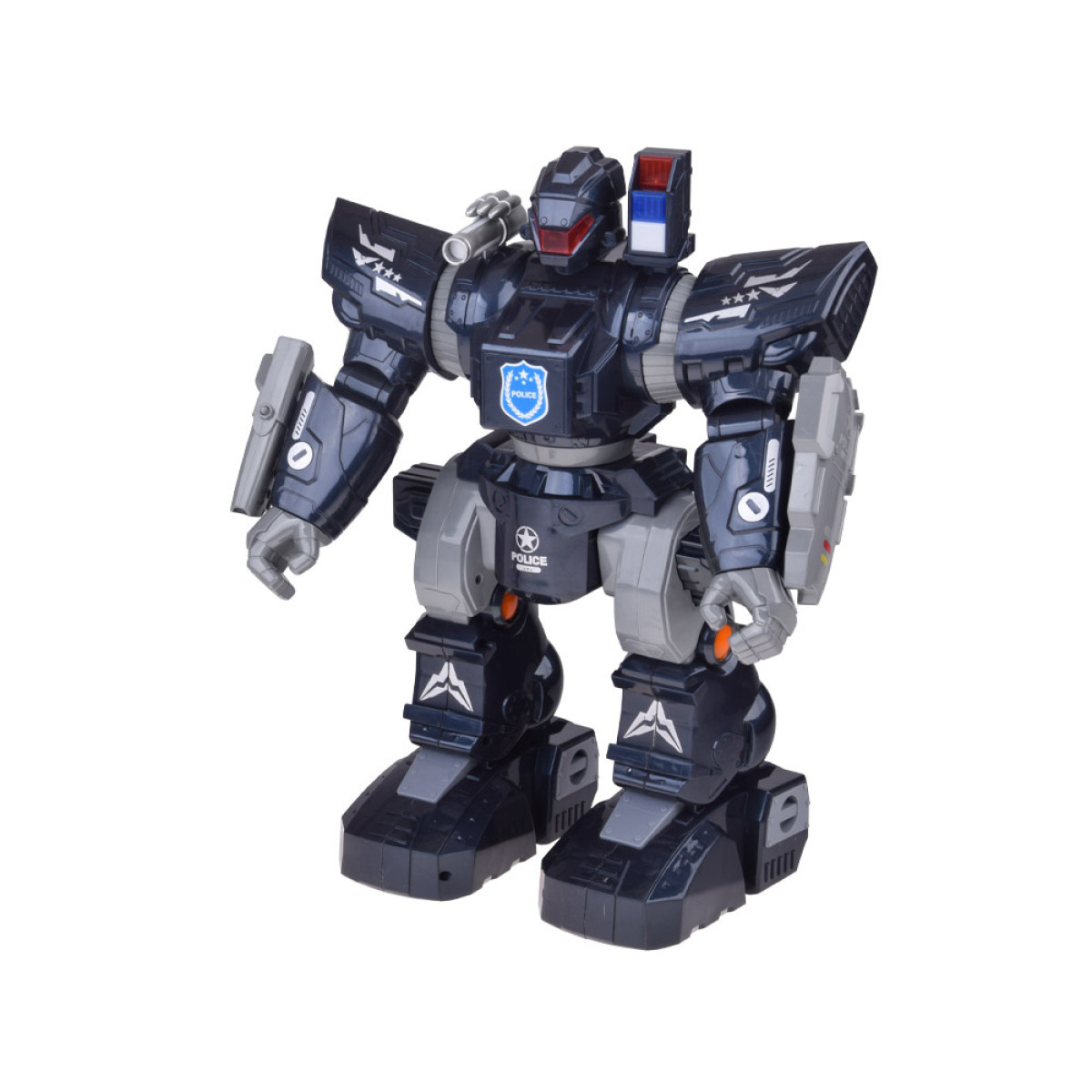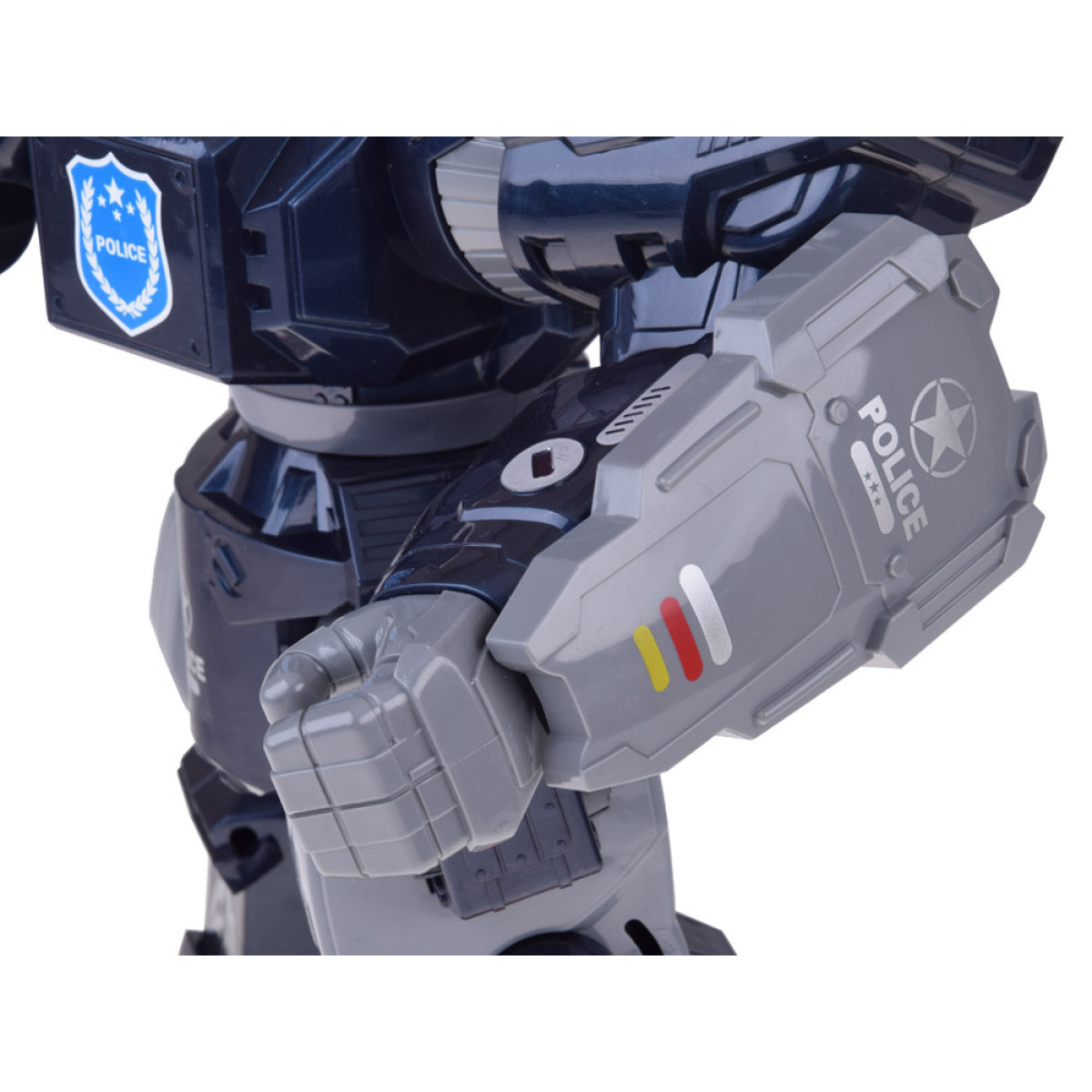 Policijos robotas yra įspūdingas žaislas, kurio matmenys yra 38 cm aukščio, 16 cm ilgio ir 30 cm pločio. Jo dideli matmenys daro jį tikrai efektingu ir iš karto traukia vaikų dėmesį. Robotas, palaikantis mėlynai-pilkos spalvos paletę su užrašu POLICE ir žvaigždutėmis žyminčiomis laipsnį, primena futuristinį policininką veiksme. Ant rankų ir pečių turi ginklą, skydą ir žibintą, kas sustiprina realistiškumo įspūdį.