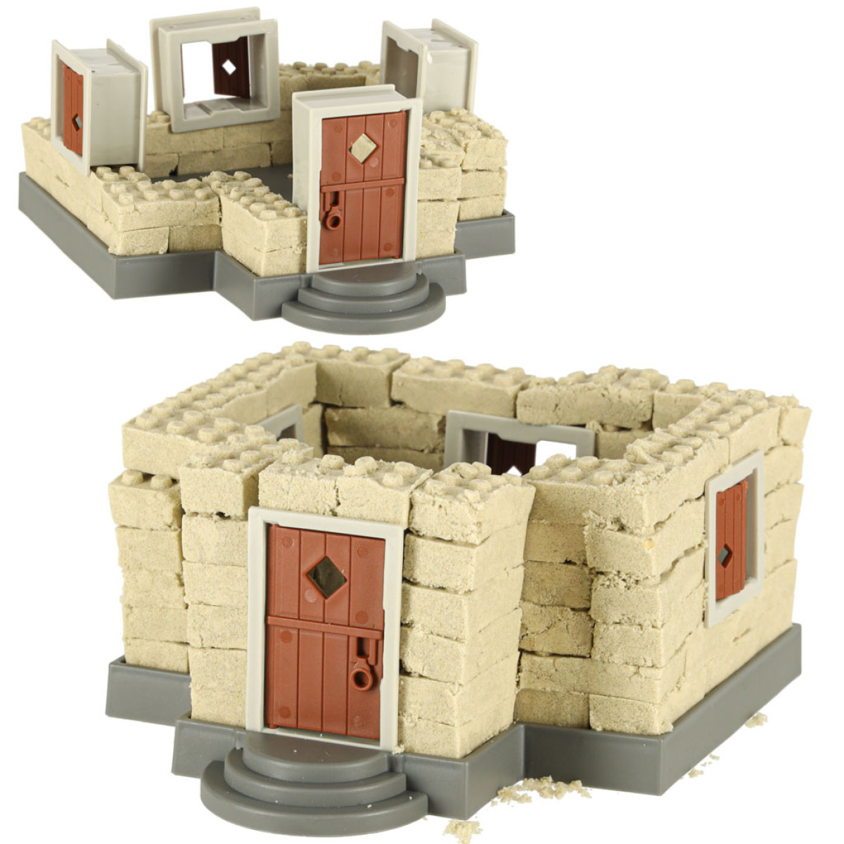 Jūsų vaikas gali pirmiausia suformuoti plytas iš smėlio ir pastatyti savo pirmąjį namelį. Vėliau pridėti langus ir duris, kad konstrukcija atrodytų kaip tikras mažas namas. Galiausiai, uždėti stogą ir vaikas sukurs savo pastatą mėgaudamasis puikia pramoga.