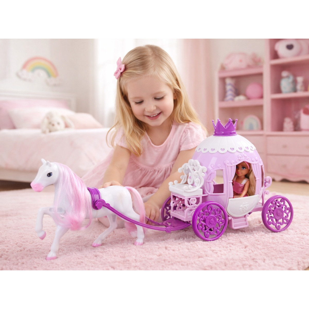 - Karieta – balta-violetinė, stilinga princesės karieta