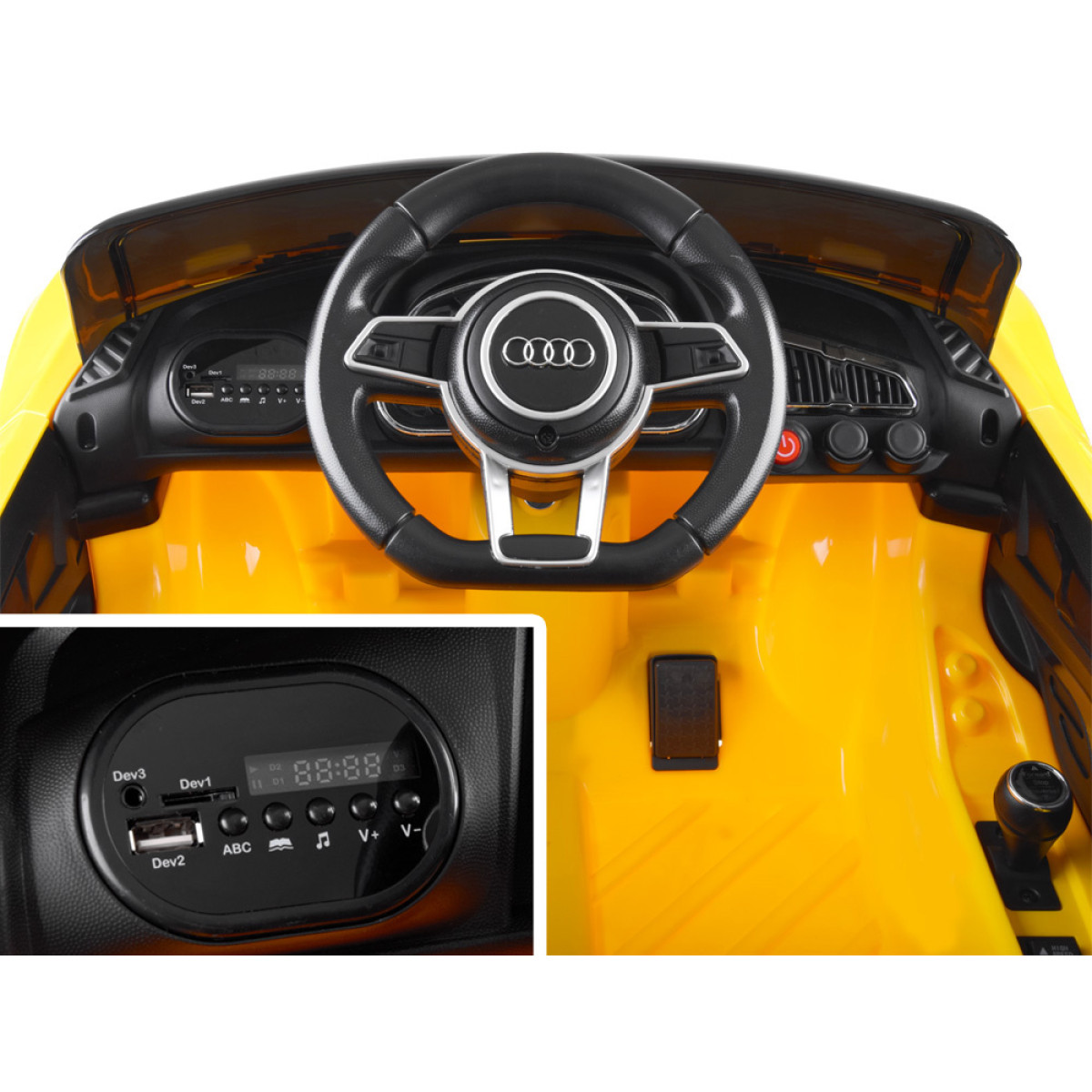 Licencijuotas AUDI R8 Spyder automobilis vaikams yra puikus pasirinkimas šį sezoną. Šis automobilis, kaip ir dera Audi markei, turi garso ir šviesos efektus, itin patogią vairuotojo sėdynę bei muzikos panelę.