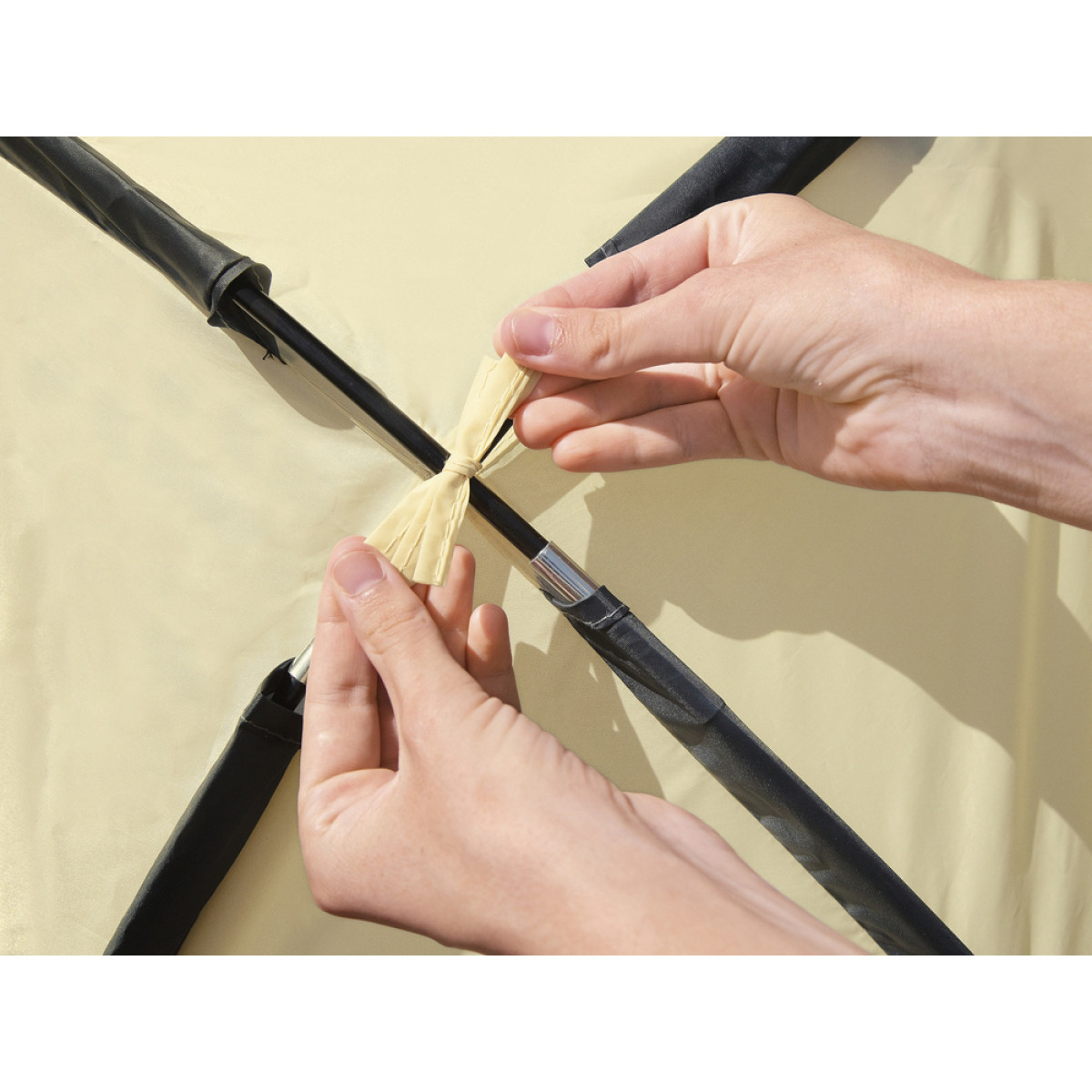 Komplektacija: 1 x pavėsinė, 3 x stulpai, 2 x įtempimo linijos, 1 x laikymo krepšys