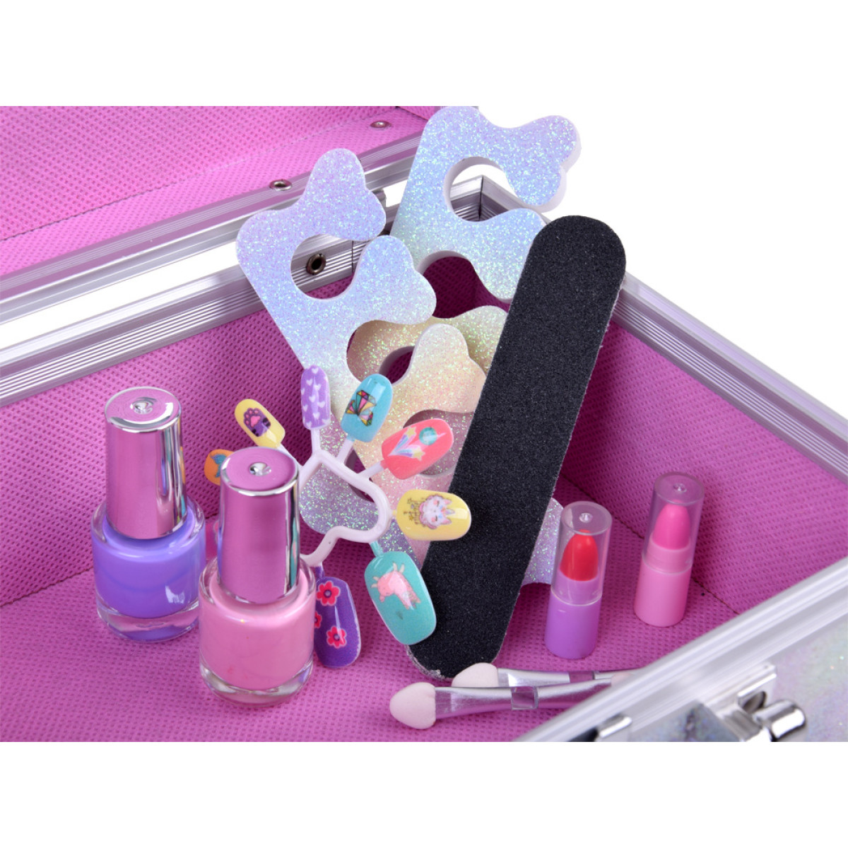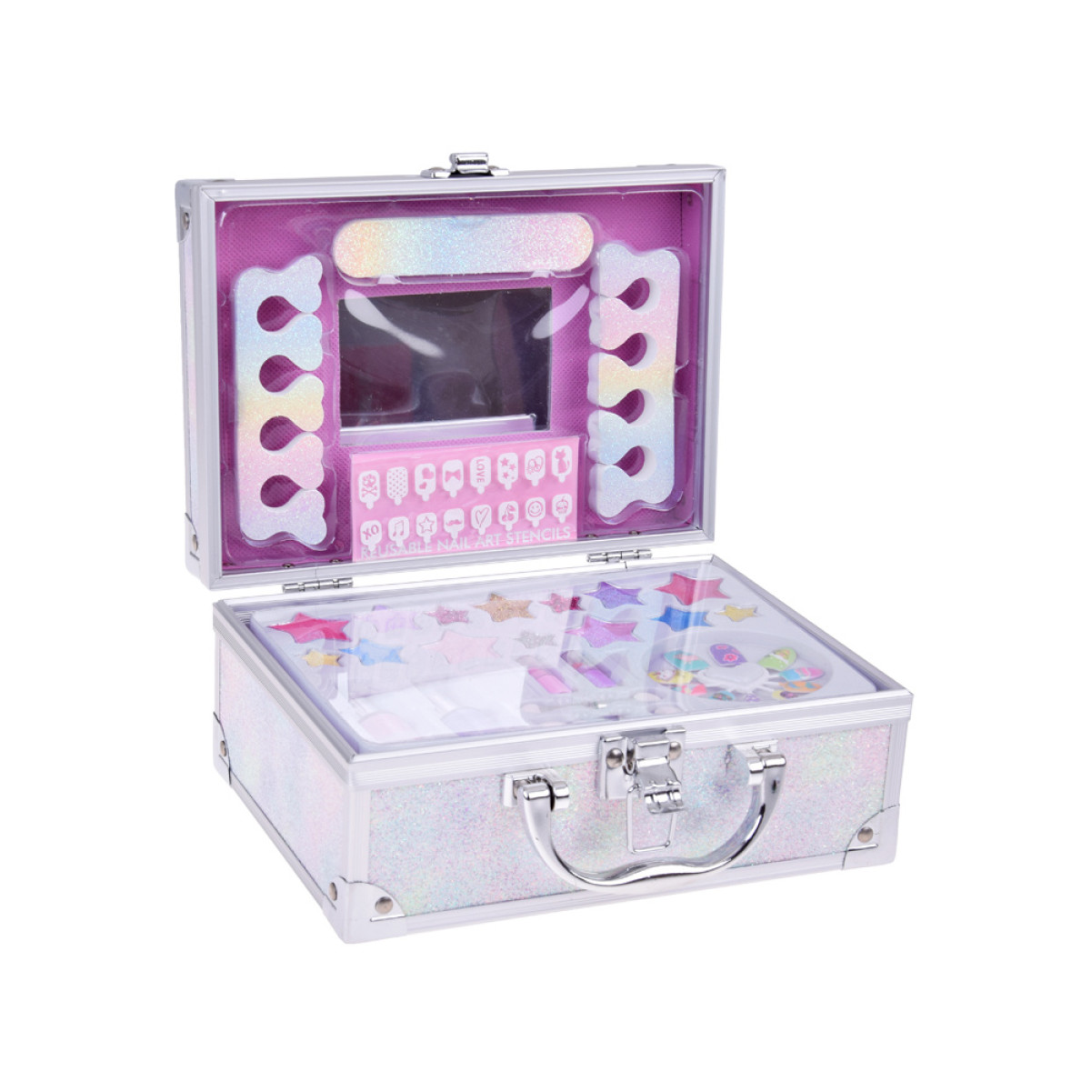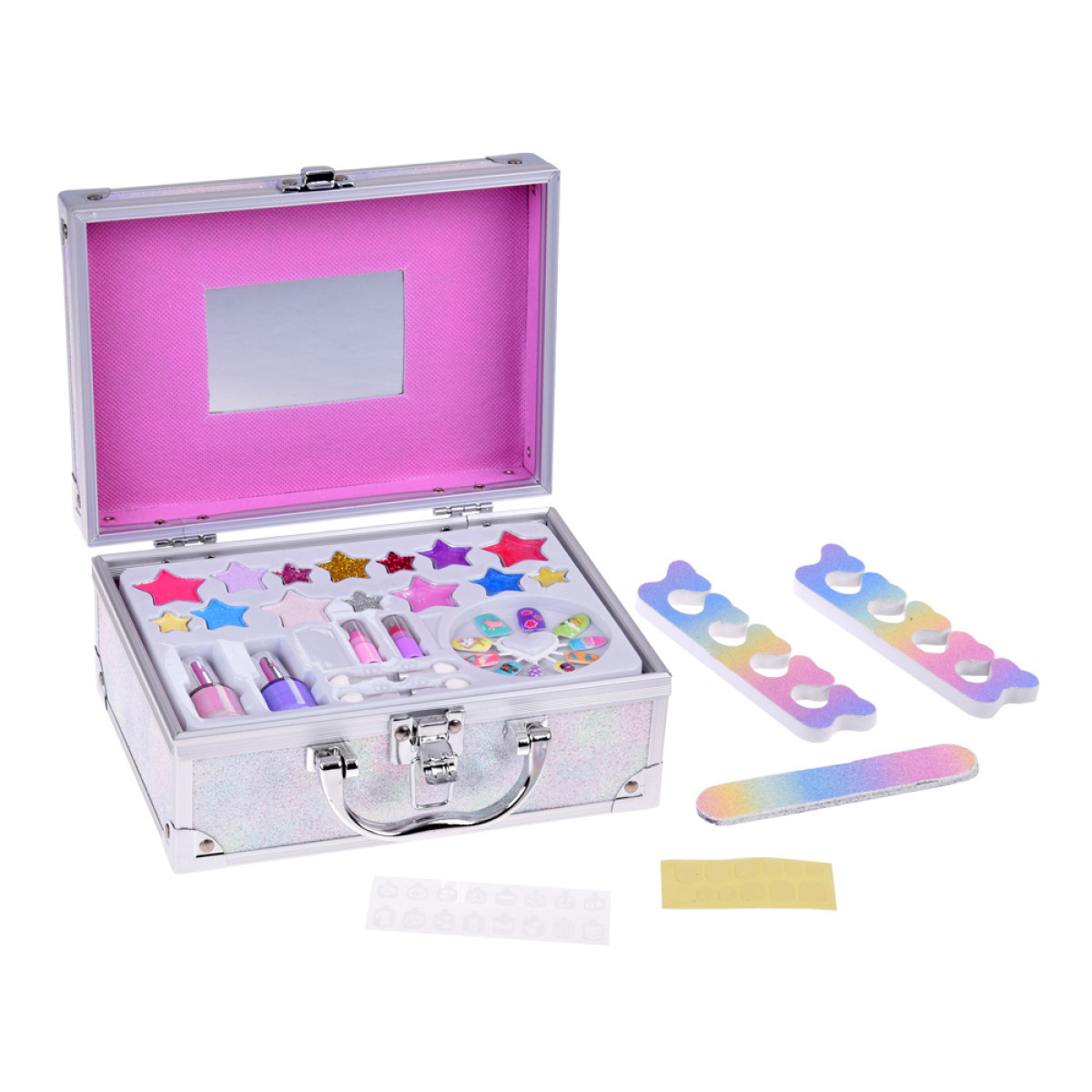 Dėžutėje rasite įvairius mergaitiškus elementus, skirtus nagų, akių vokų ir lūpų makiažui. Kad būtų lengviau dažytis, viduje yra pritvirtintas veidrodis.