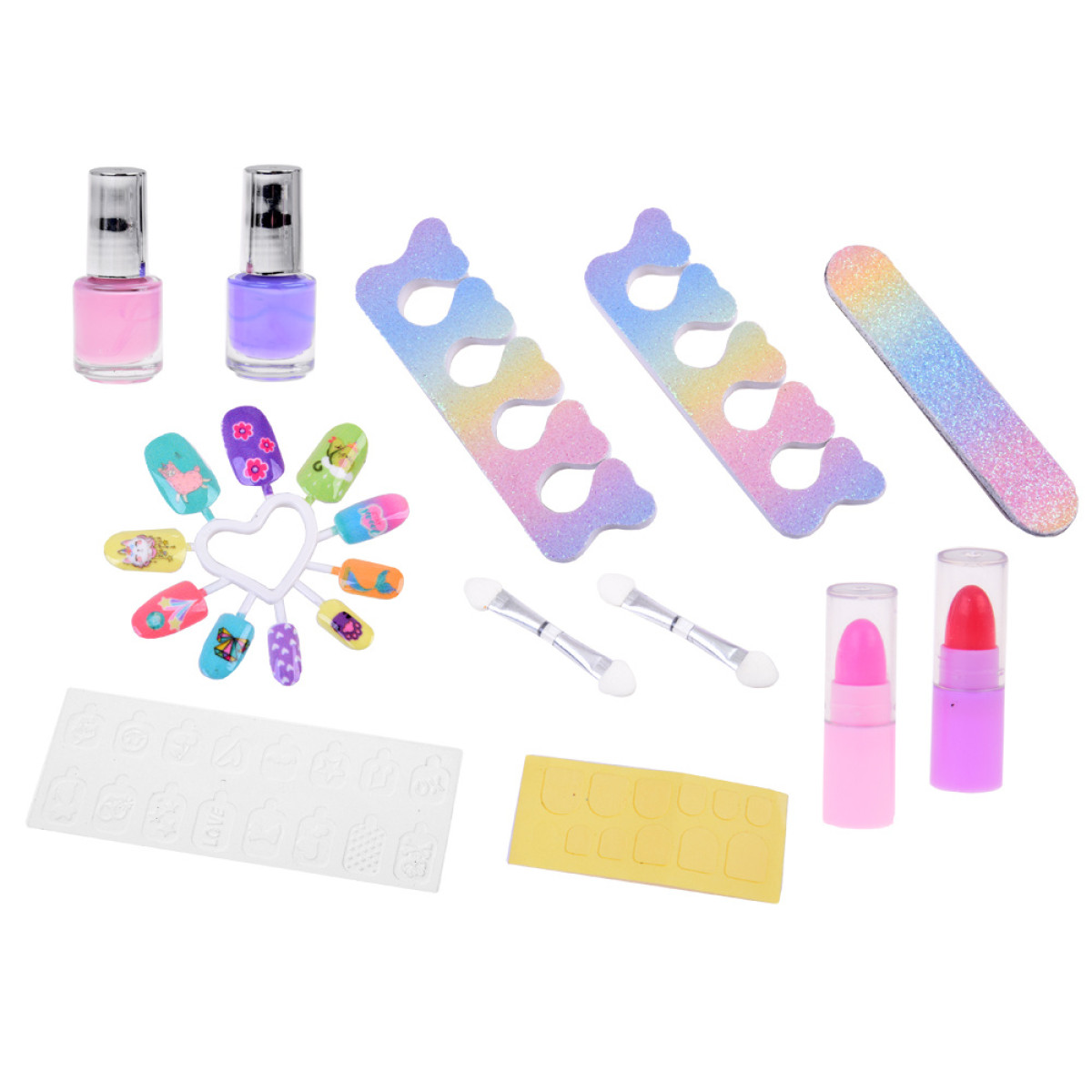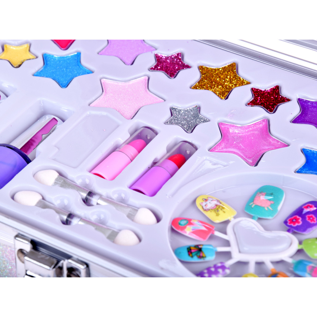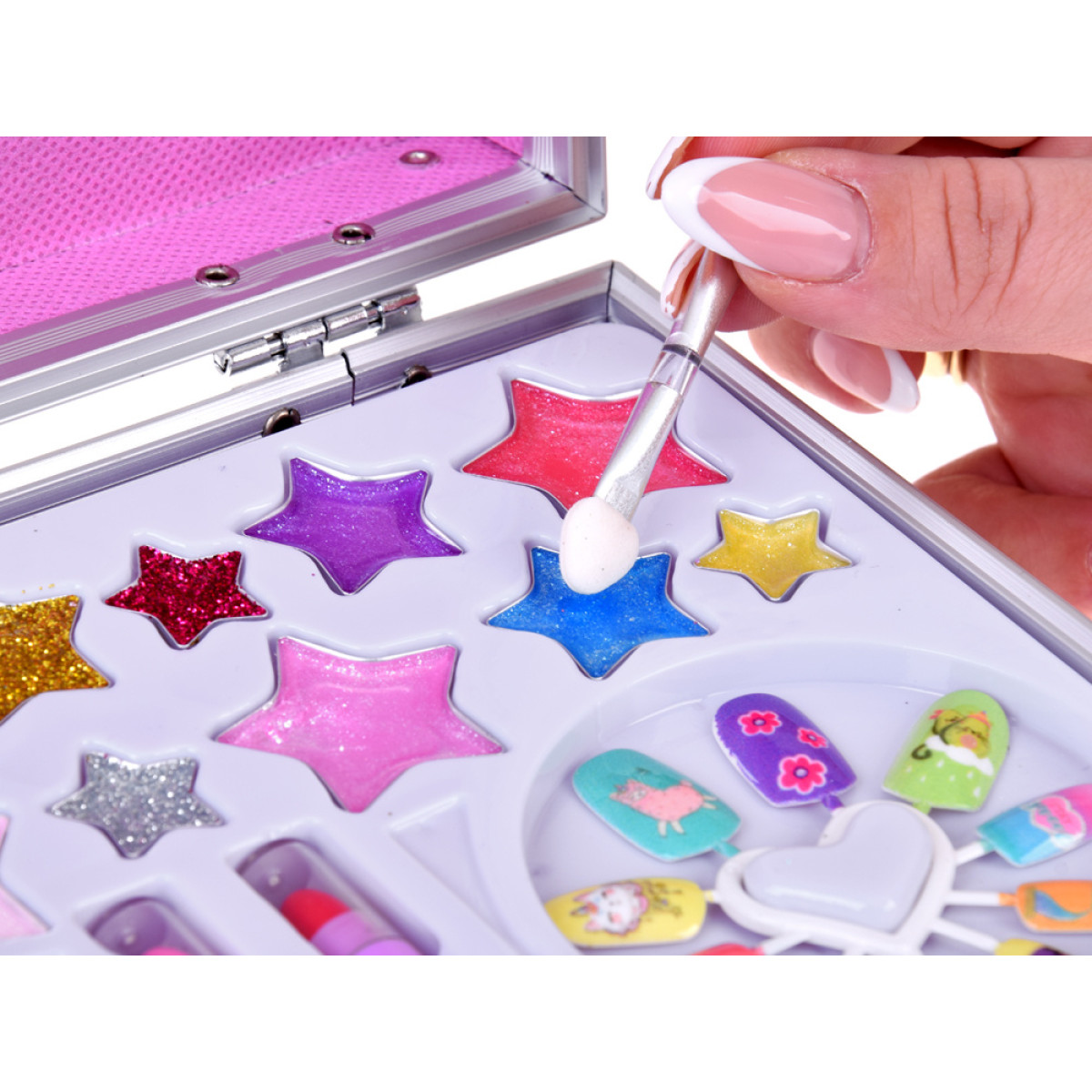 Dėžutėje rasite įvairius mergaitiškus elementus, skirtus nagų, akių vokų ir lūpų makiažui. Kad būtų lengviau dažytis, viduje yra pritvirtintas veidrodis.