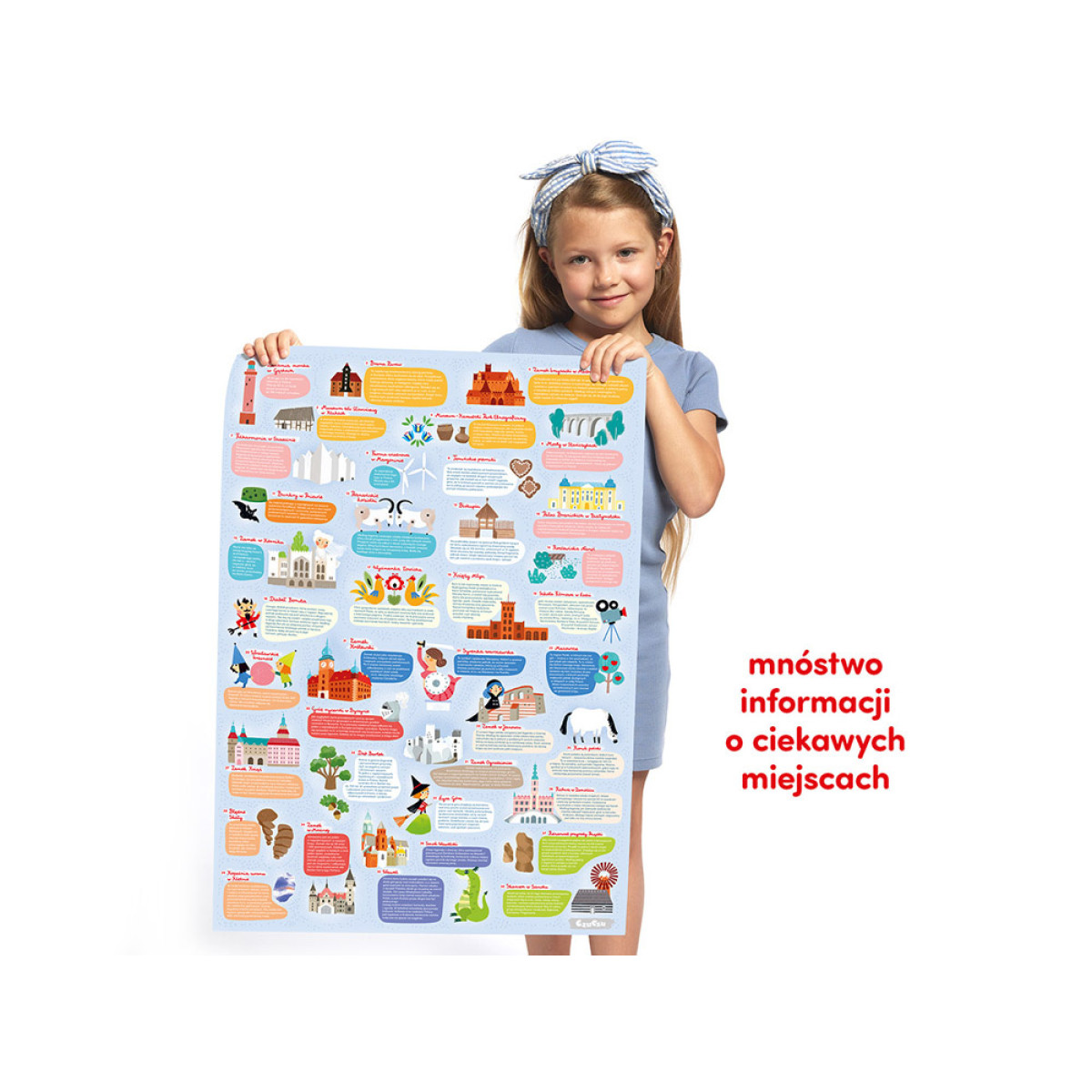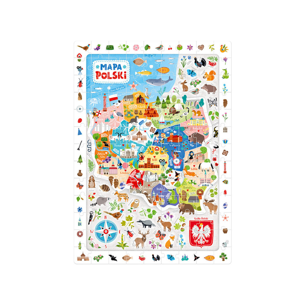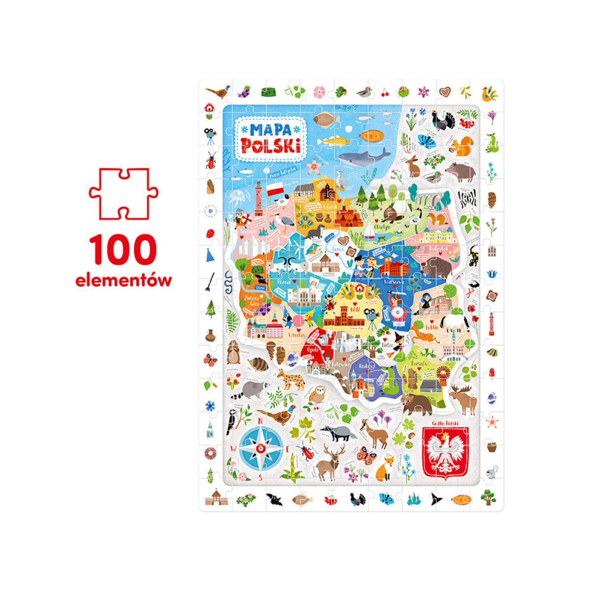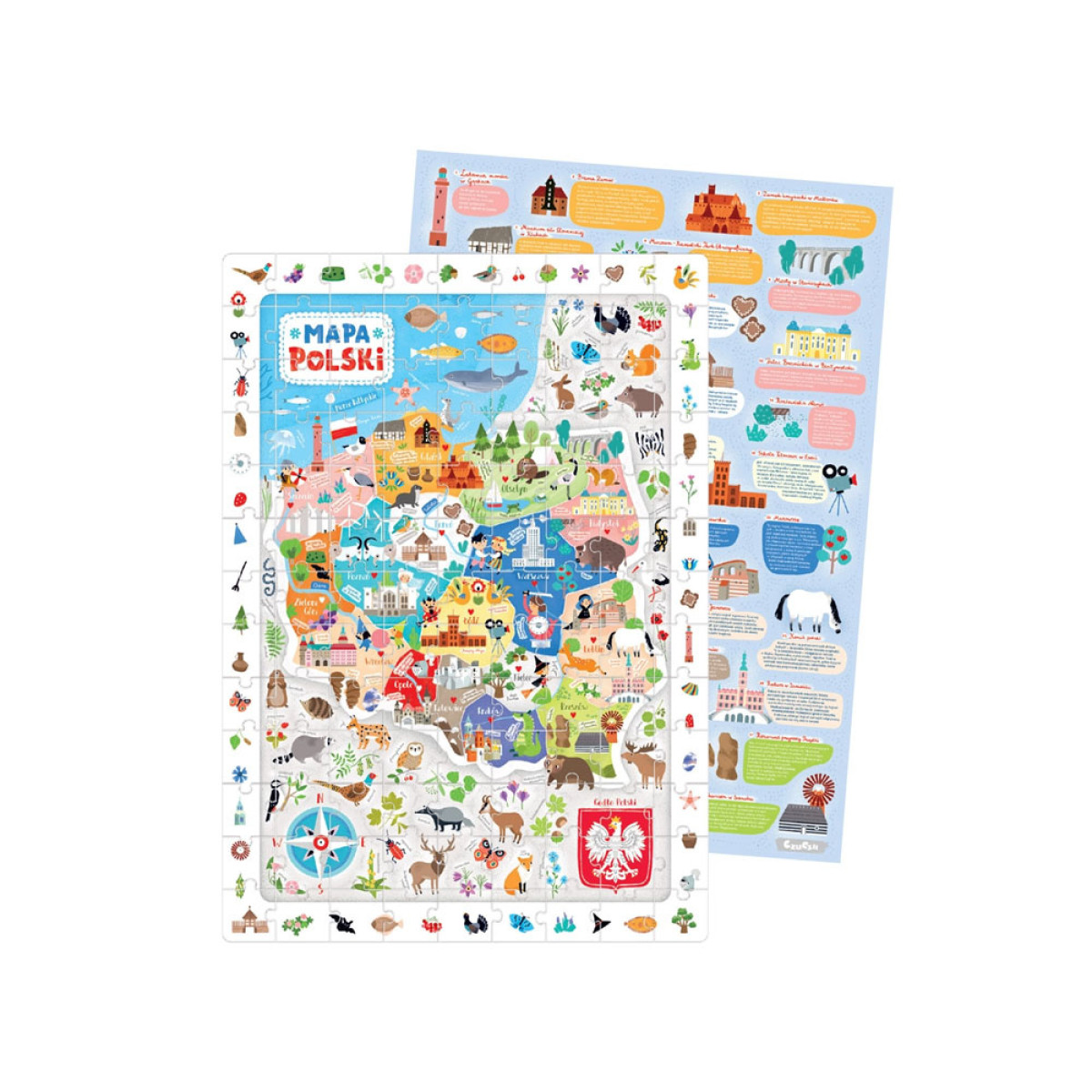 Didelė, spalvinga ir pilna detalių iliustracija, vaizduojanti Lenkijos žemėlapį, vertas aplankyti vietas, charakteringus augalus ir gyvūnus. Dėlionės sudėliojimas yra didelis iššūkis ir puiki pramoga, kuri įkvepia gilinti žinias apie istoriją, kultūrą ir gamtą. Dėlionės kūrimas nesibaigia ją sudėjus! Ieškokite detalių iš rėmelio ir leiskite, kad plakato smulkmenos įkvėptų jus tolesniems atradimams. Iliustracijos ir forma pritaikytos vaikų amžiui.