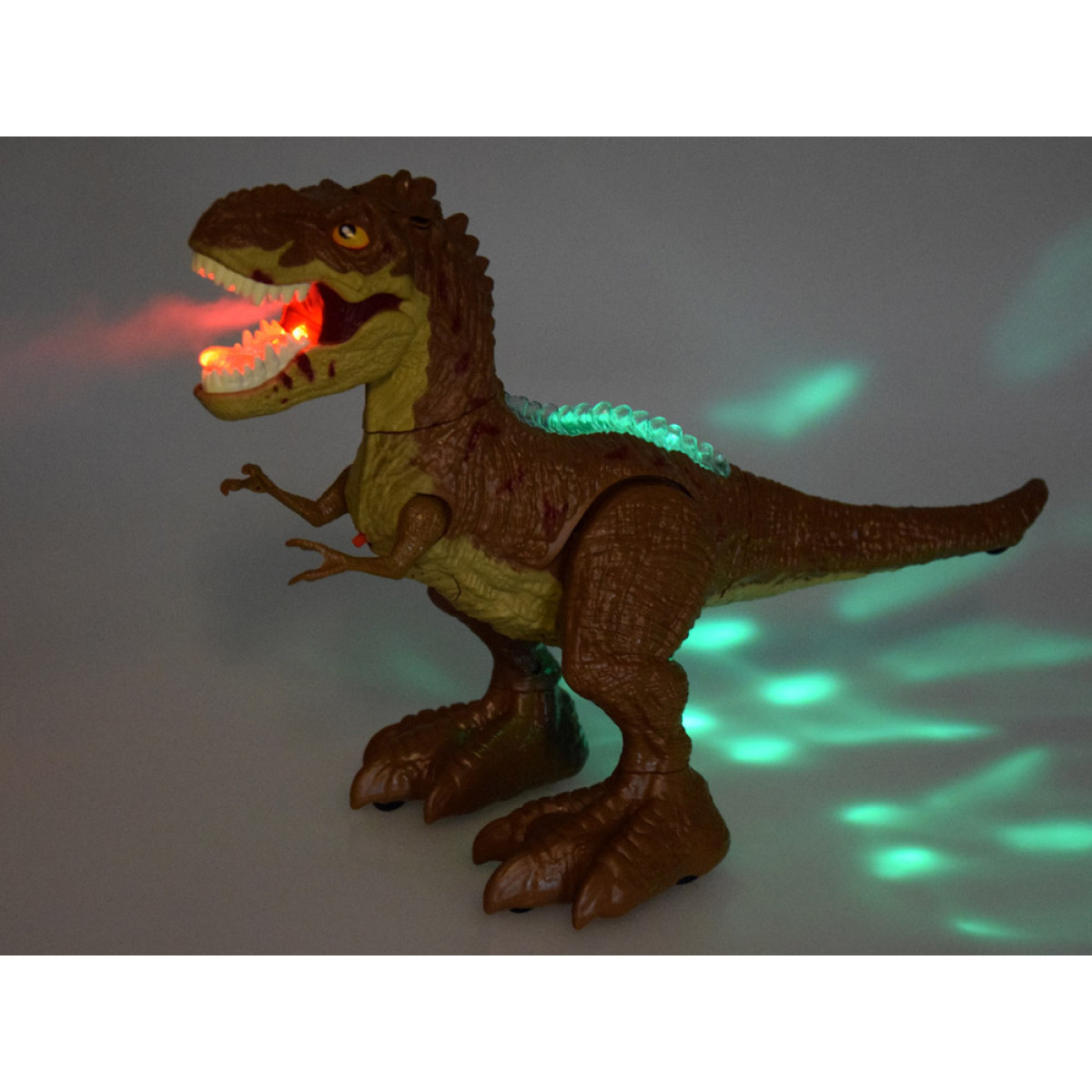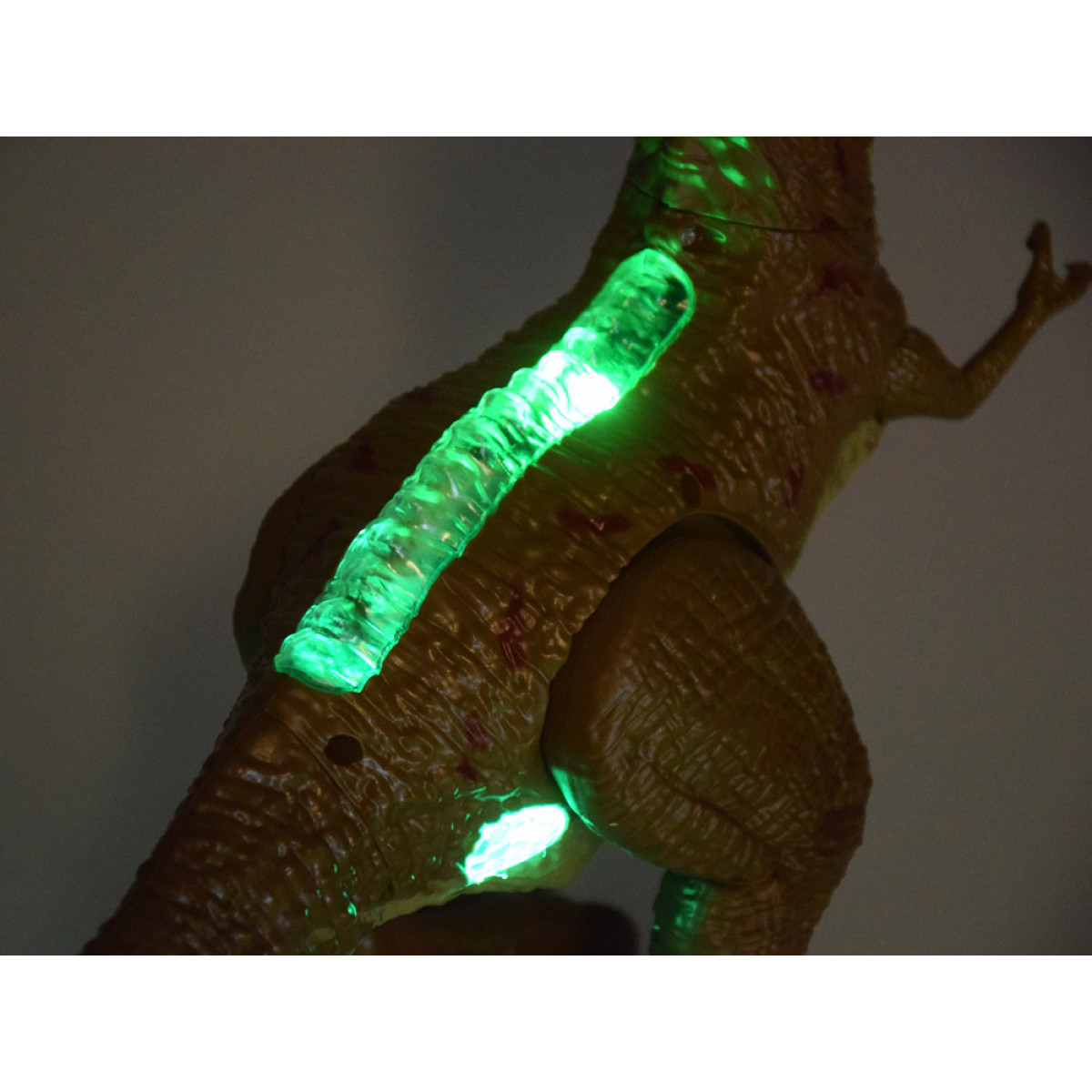 Žaislui būdingos garso funkcijos - riaumojimas ar linksmi melodijos, taip pat mirksinčios spalvingos šviesos ant T-rex nugaros ir raudonai apšviesta burna. Visa tai atrodo įspūdingai, ypač tamsesnėje aplinkoje. Riaumojimas ir ugnies išmetimas. Tikras dinozauras turi riaumoti! Todėl šis modelis turi įspūdingą riaumojimo garsą. Riaumojimą lydi garas, kylantis iš burnos, kuris dėl raudono apšvietimo atrodo kaip ugnis. Kaip pasiekti tokį efektą? Tiesiog įpilkite vandens į rezervuarą, esantį ant gyvūno galvos, ir paspauskite atitinkamą mygtuką pultelyje.