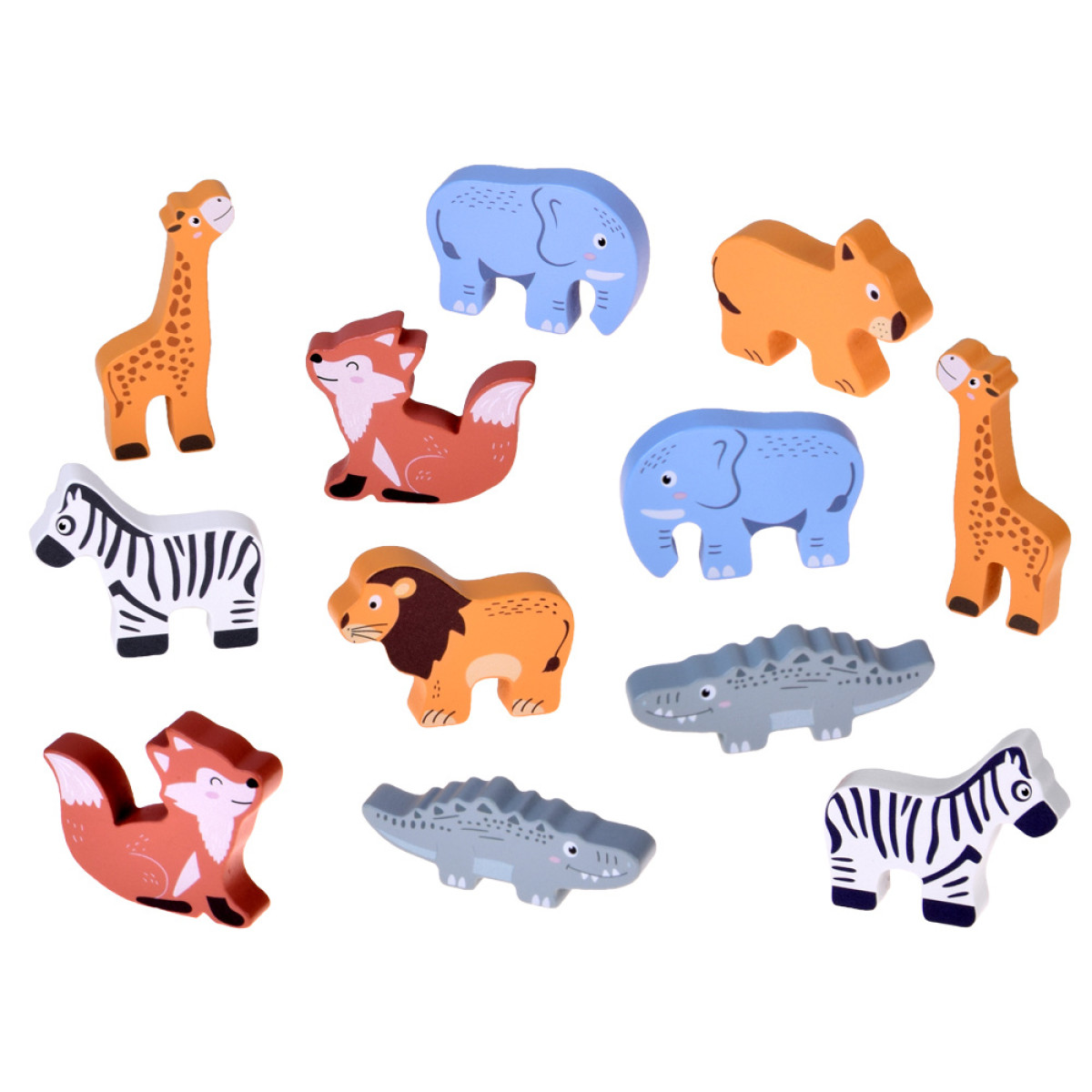 - Gyvūnų figūrėlės: drambliai, zebrai, liūtai, žirafa, lapės, krokodilai, paukščiai.