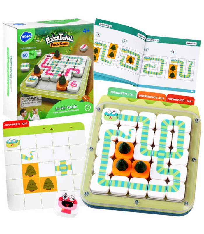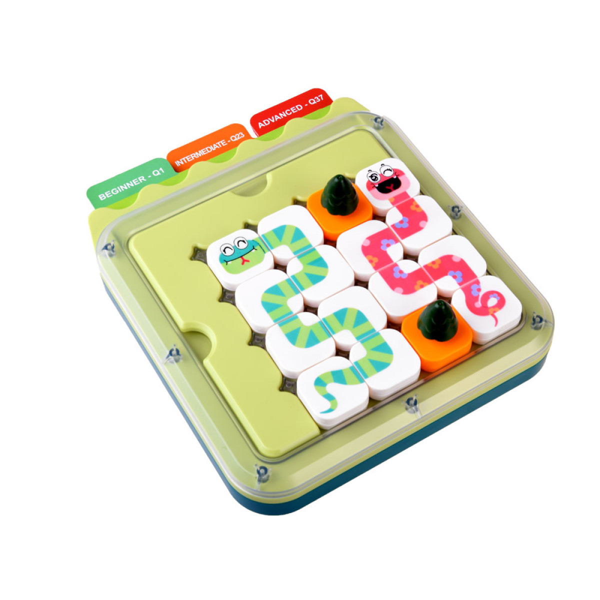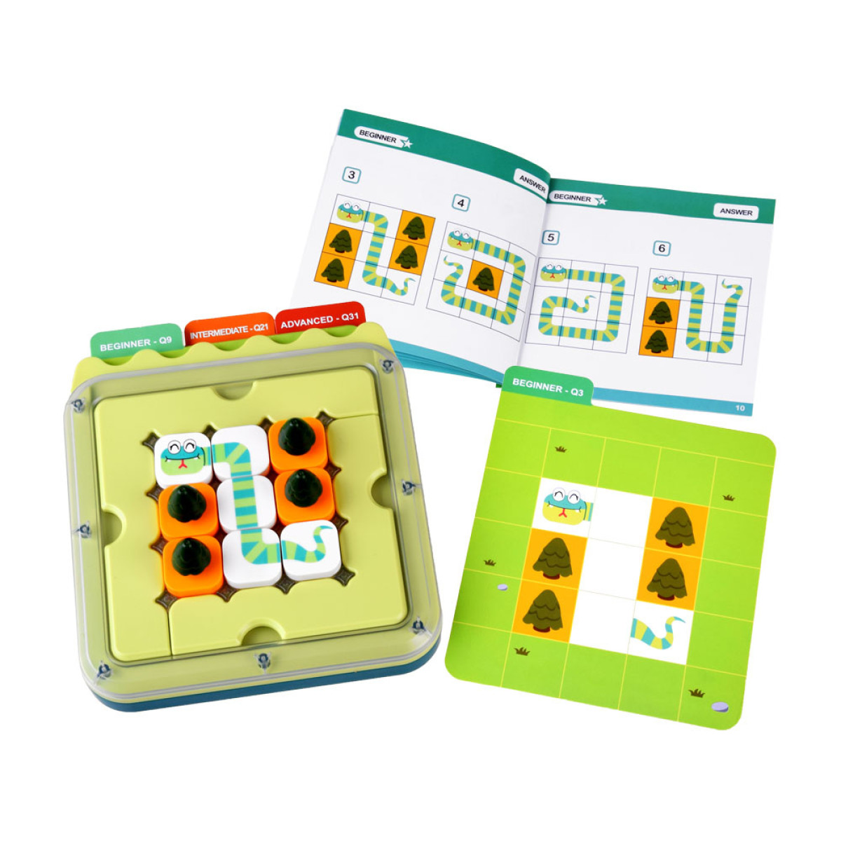 Pradžioje pasirinkite užduočių kortelę. Galite rinktis iš trijų sunkumo lygių: lengvas (žalias), vidutinis (oranžinis) ir sunkus (raudonas). Pasirinkta kortelė dedama prieš plokštę, ir tada reikia atkartoti kortelės išdėstymą ant plokštės. Lengvame ir vidutiniame lygyje žaidimo lauką sumažiname naudodami ribotuvus. Taip pat išdėstome medelius, gyvatės galvą ir uodegą, o sunkiausiame lygyje - papildomus gyvatės elementus, kuriuos reikės sujungti. Mūsų tikslas yra sujungti gyvatės galvą ir uodegą į vieną visumą. Galime pasirinkti kauliukus su tiesiais segmentais, posūkiais ar besikertančiais gyvatės segmentais. Kauliukai yra dvipusiai su žalia ir rožine gyvate. Žaidžiant negalima perkelti ar pašalinti jokių elementų, nurodytų kortelėje. Negalima maišyti spalvų - gyvatė turi būti visiškai žalia arba rožinė. Svarbu! Užduotis laikoma teisingai išspręsta, kai sujungiate gyvatę į vieną visumą ir visi laukai yra užimti kauliukais ar medžiais. Atsakymų knygelėje, puslapiuose 8-32, yra užduočių sprendimai. Dvi paskutinės puslapiai yra tuščios, todėl galite sugalvoti savo užduotis ir užsirašyti jas kartu su sprendimais.
